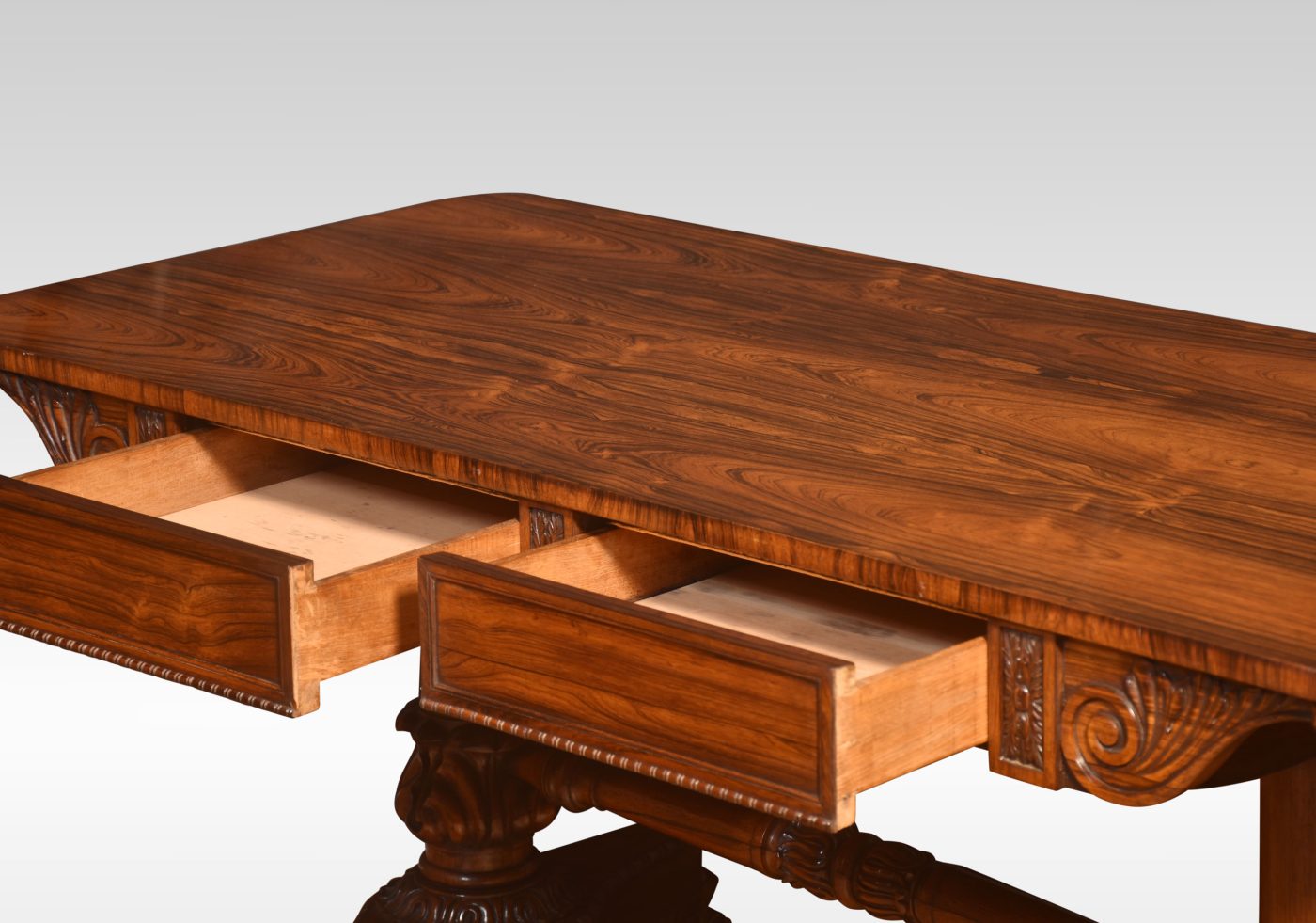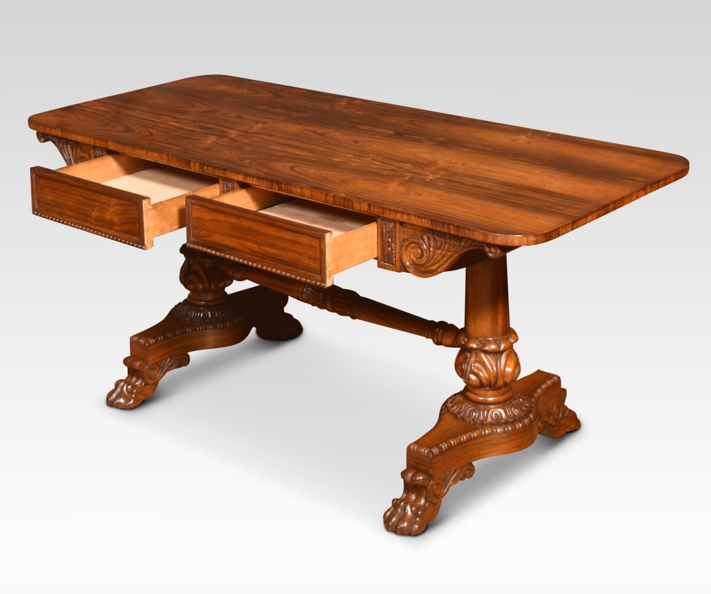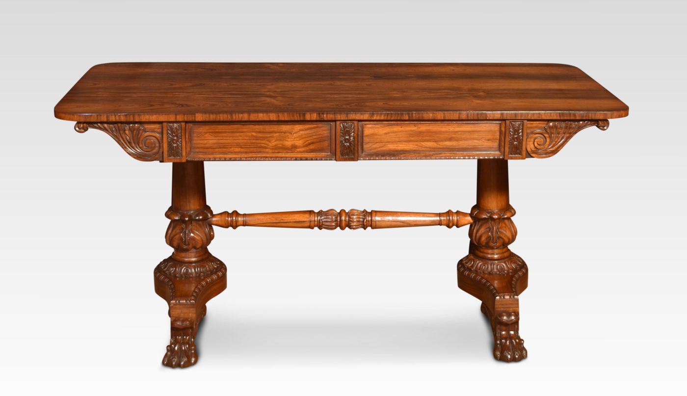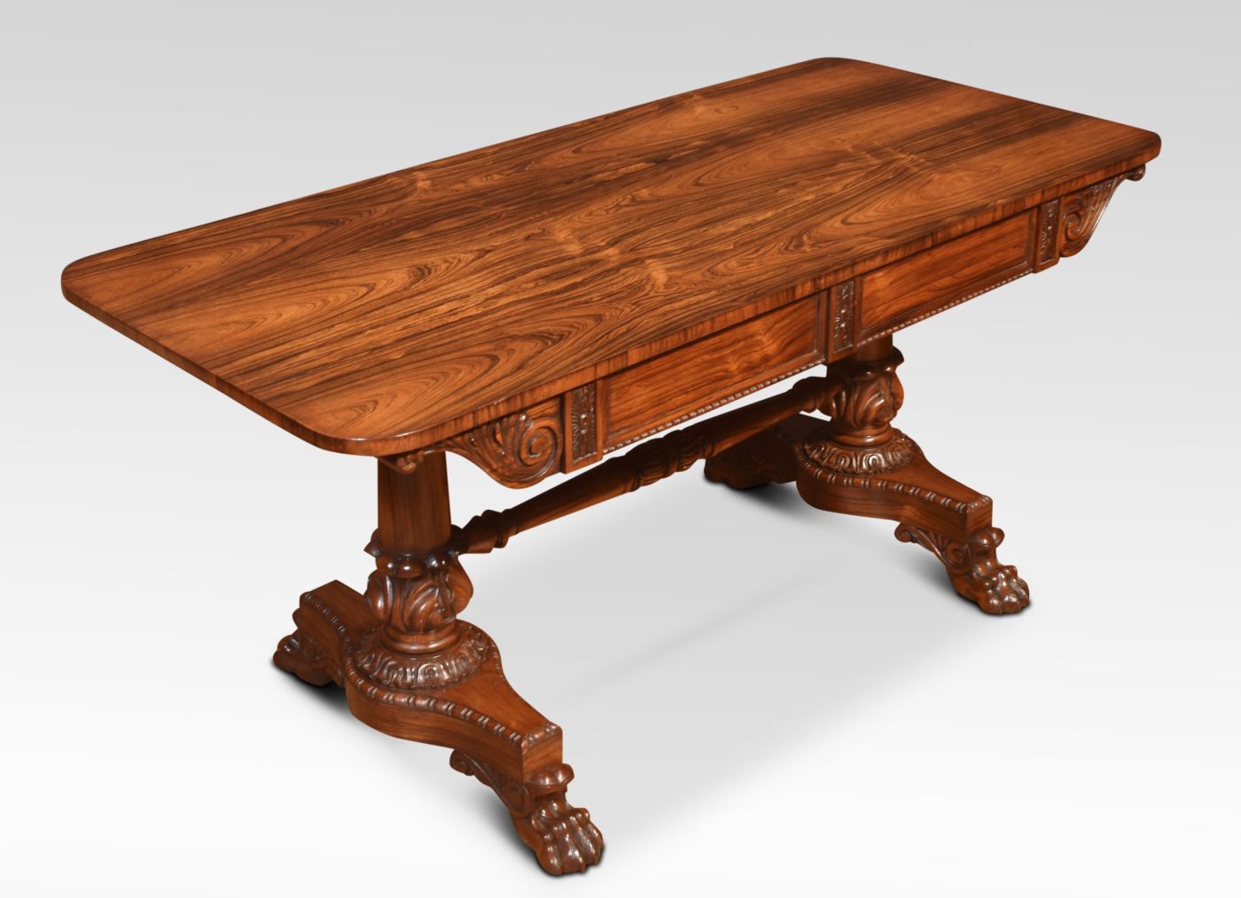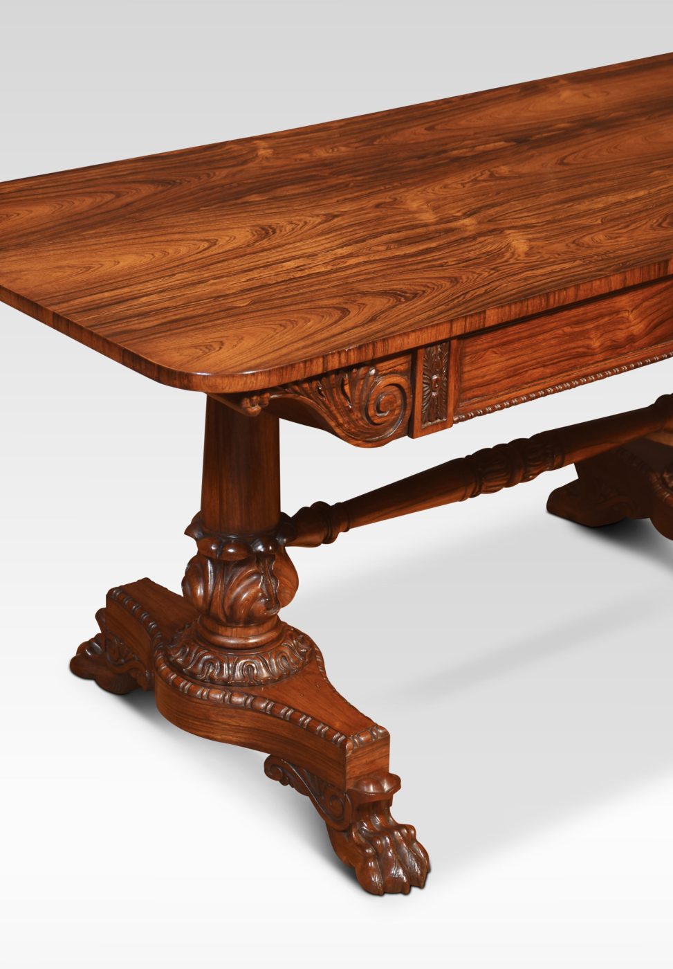 Rosewood library table, the rectangular top with rounded corners, above two frieze drawers, raised on tapering columns and acanthus carved socles, raised on egg and dart moulded trestle ends, terminating in lions paw feet and concealed castors.