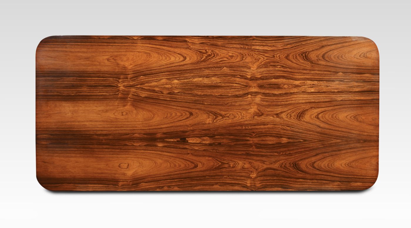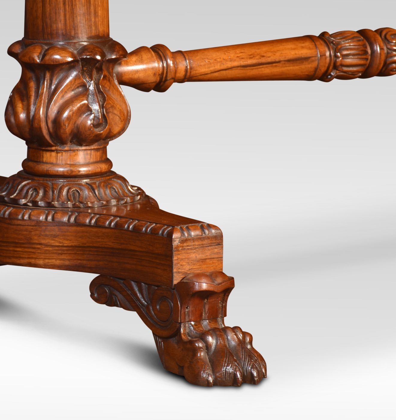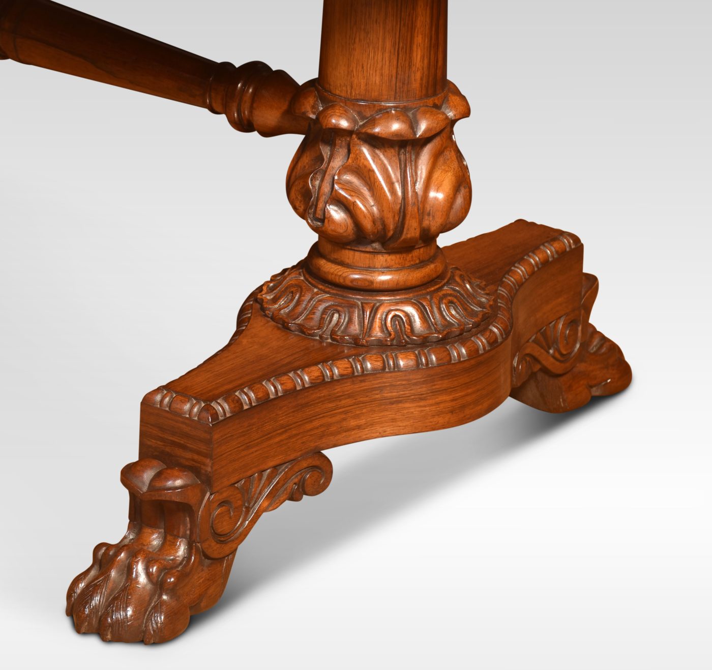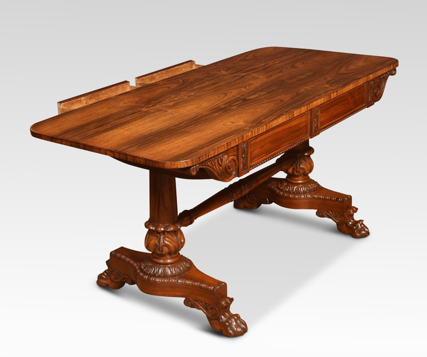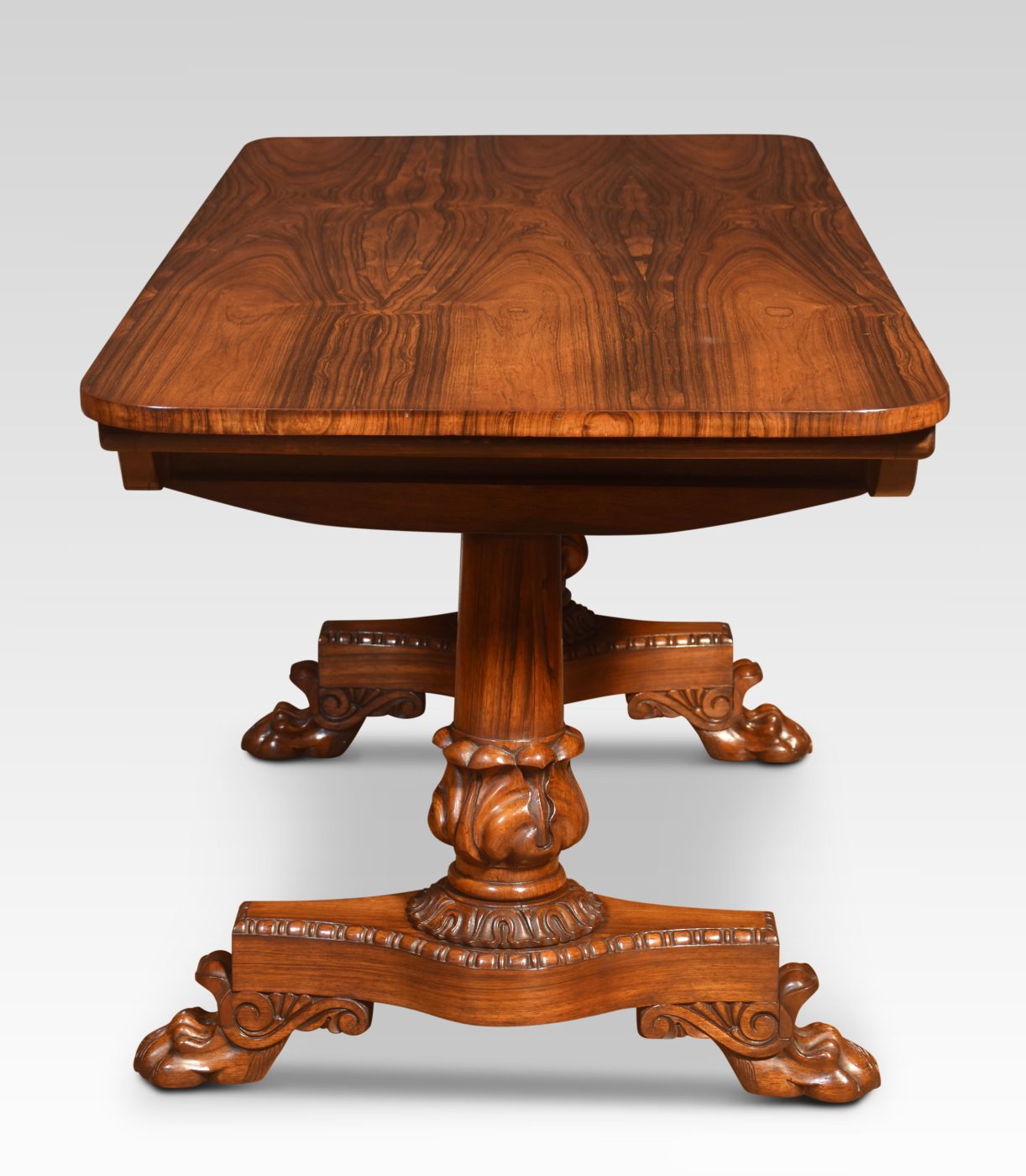 Rosewood library table, the rectangular top with rounded corners, above two frieze drawers, raised on tapering columns and acanthus carved socles, raised on egg and dart moulded trestle ends, terminating in lions paw feet and concealed castors.
