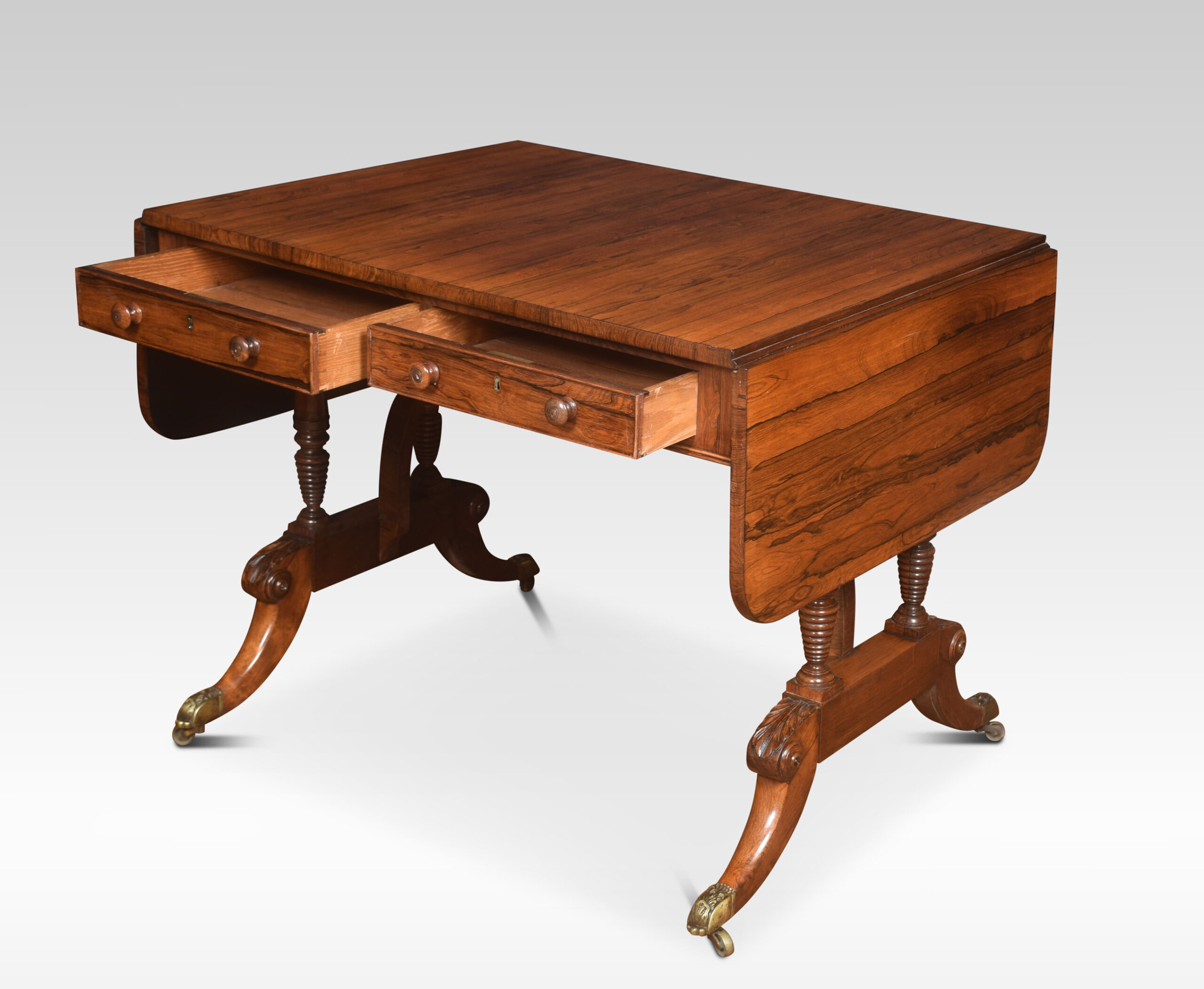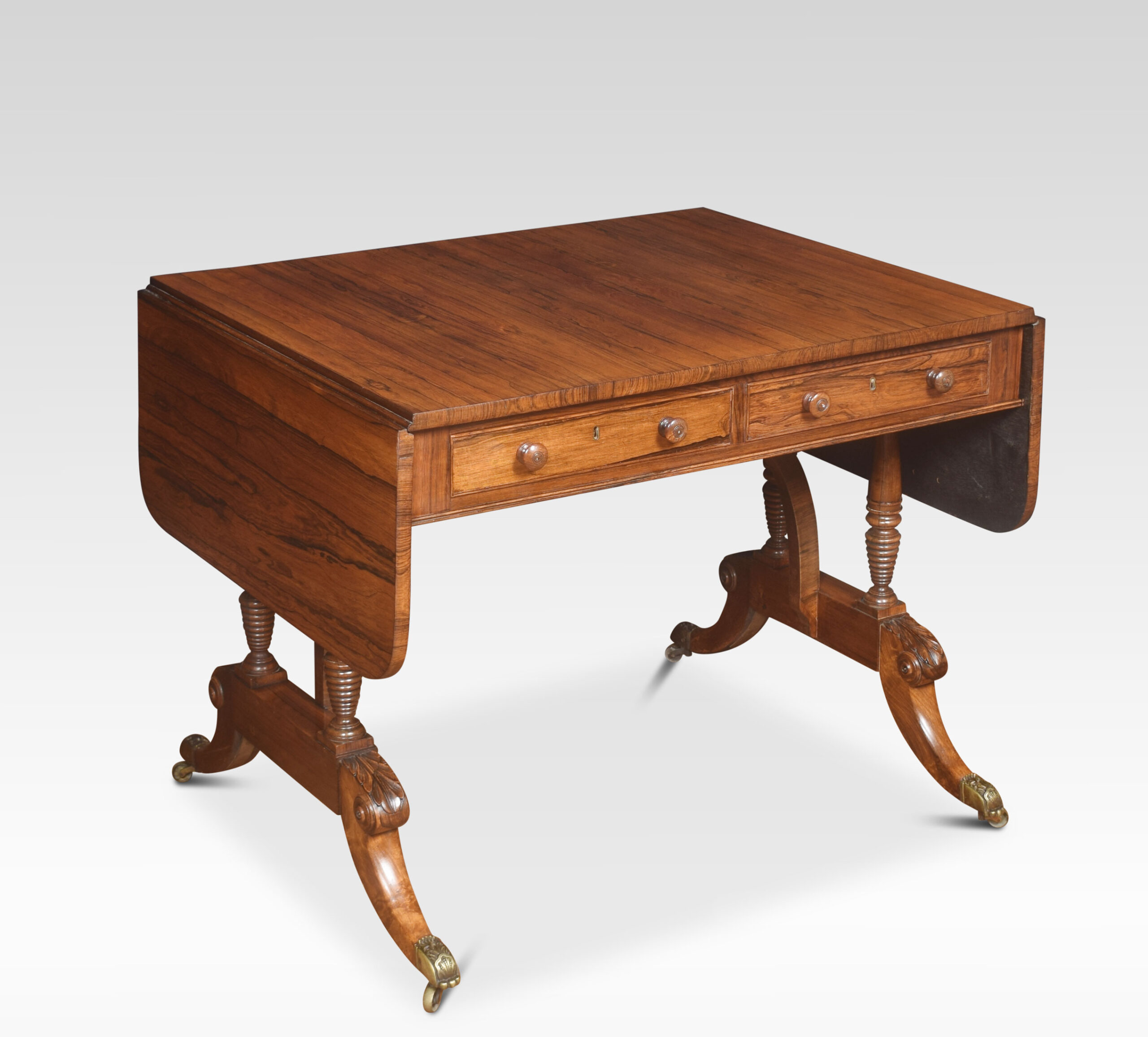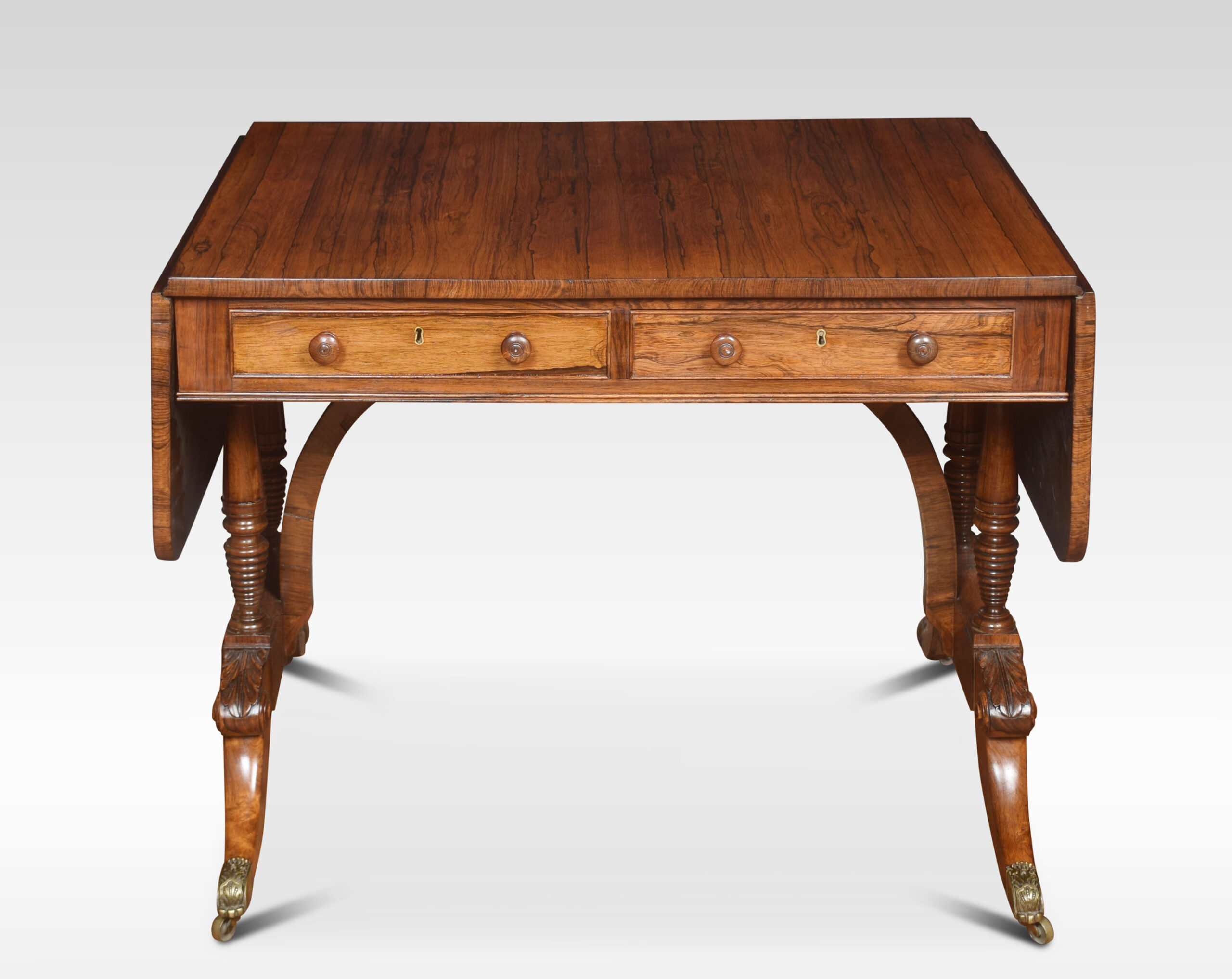 Regency rosewood sofa table, the rectangular top, and two drop leaves, two freeze drawers the opposing side having dummy drawers. Raised up on ring turned supports and out swept legs with brass terminals and castors.