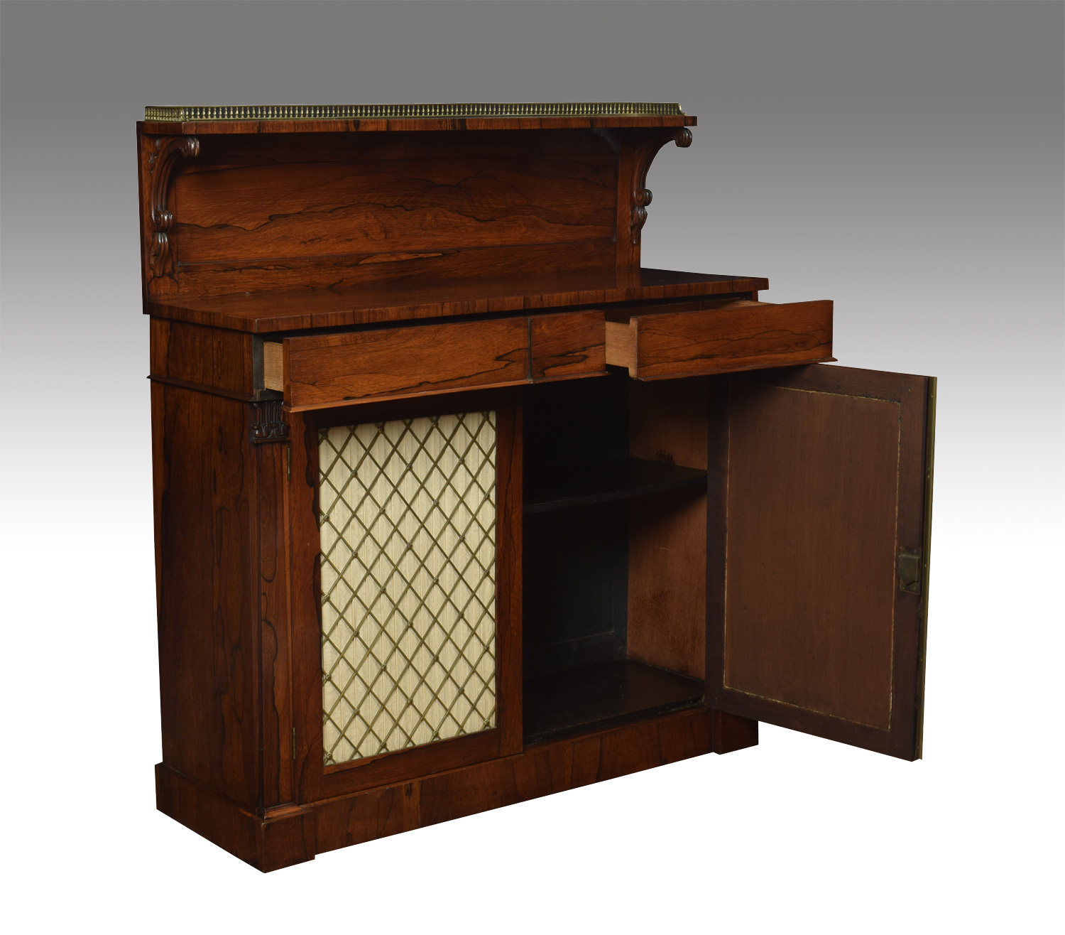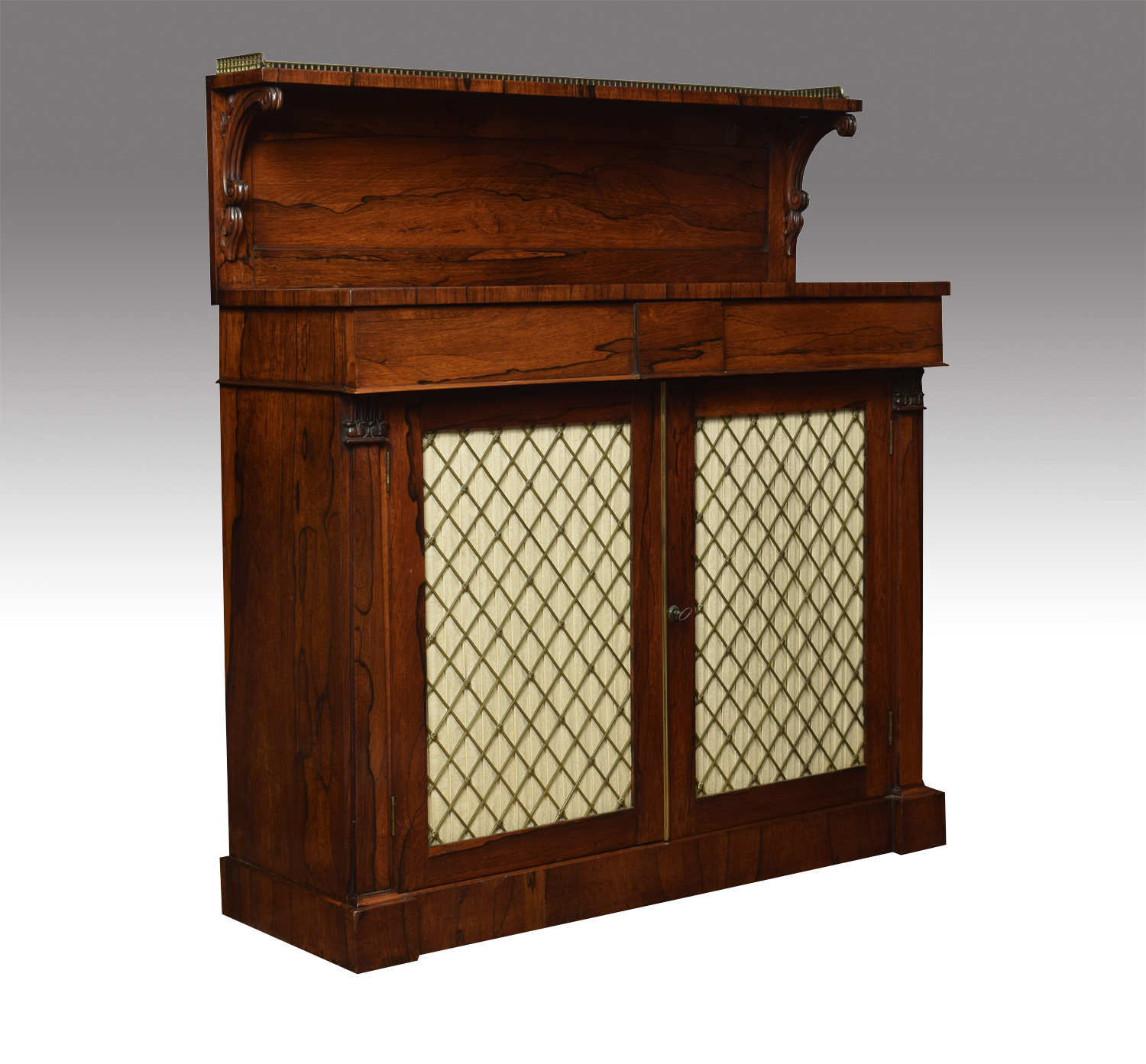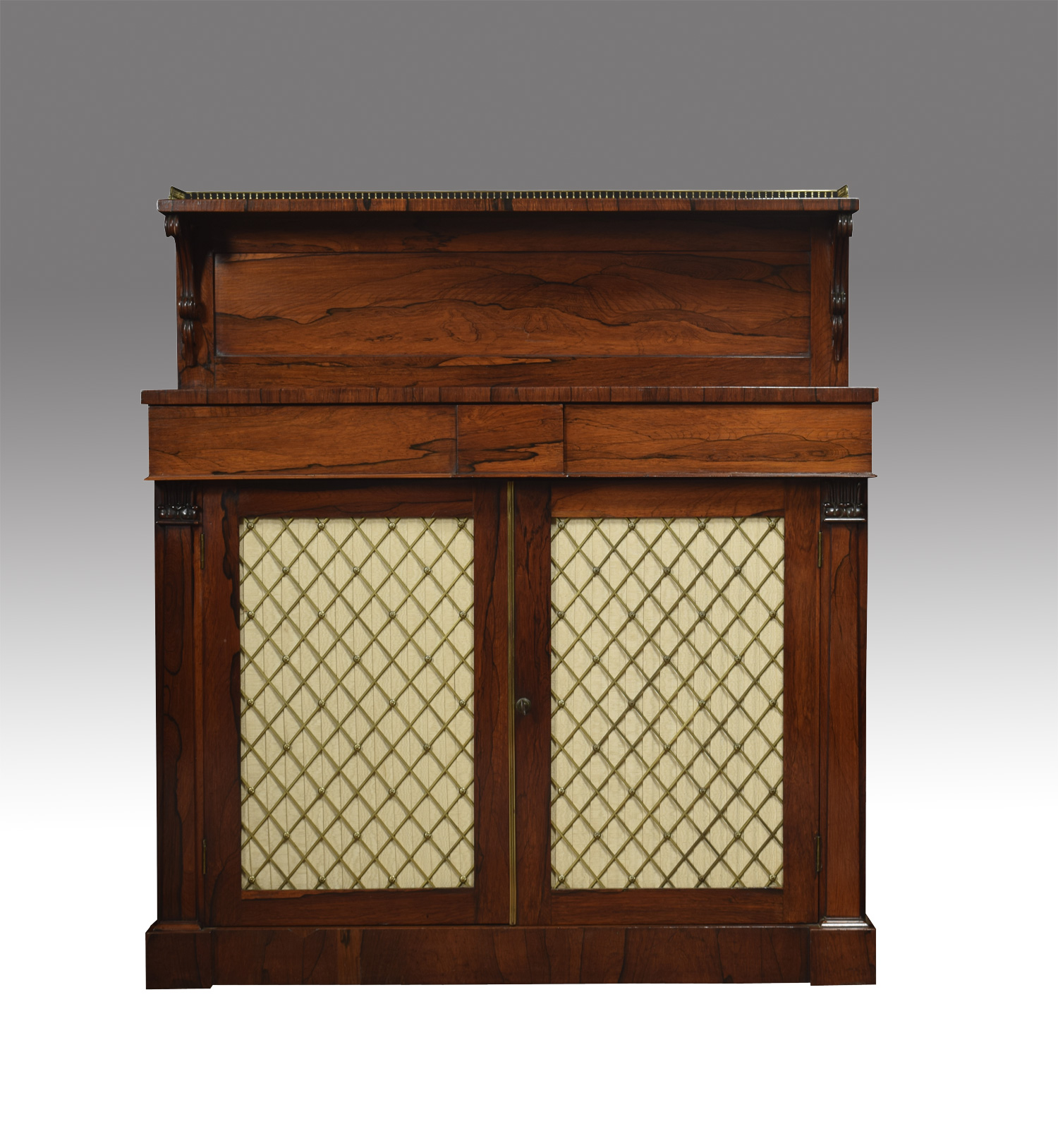 Regency rosewood two door chiffonier, the raised gallery back with reeded scroll supports above two short freeze draws the base section fitted with two silk panelled doors behind brass grilles. The doors opening to reveal a single fixed shelf all raised up on plinth base