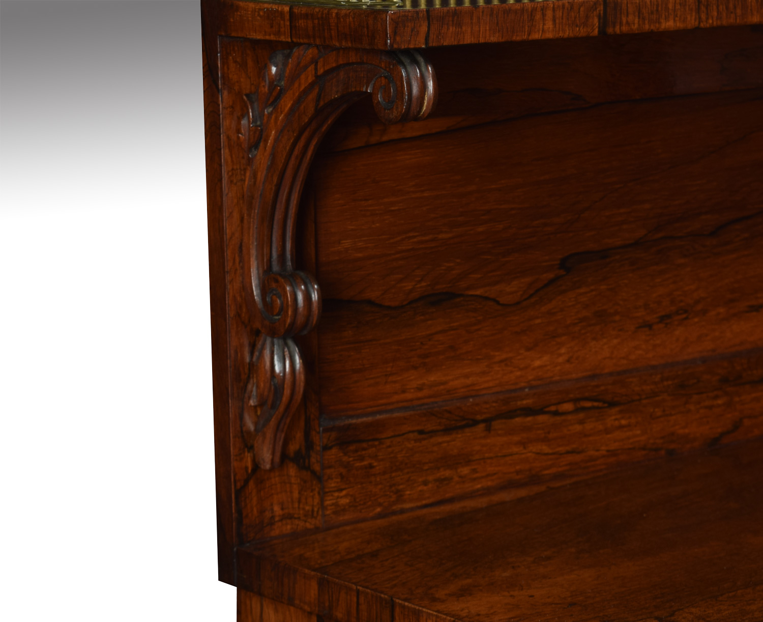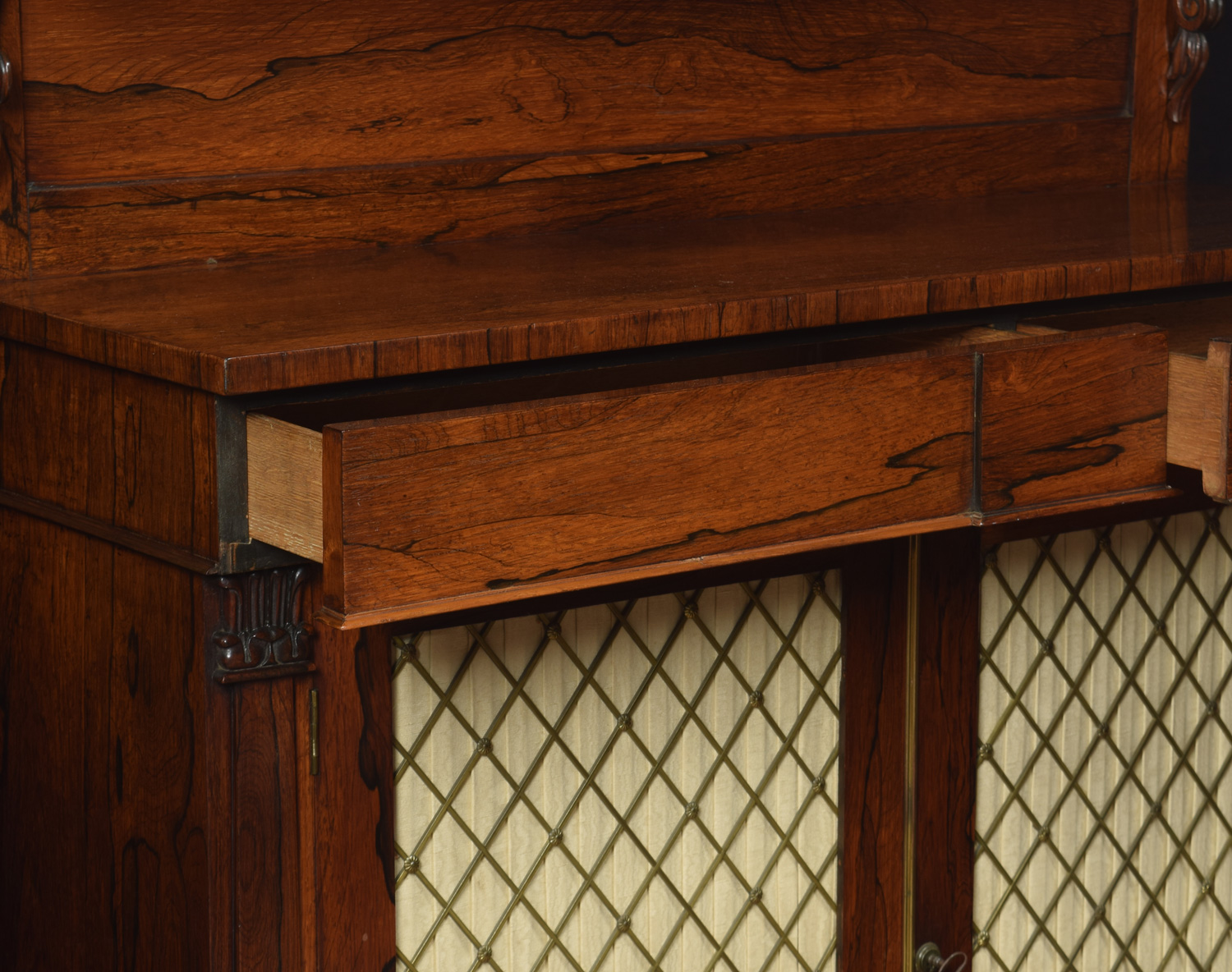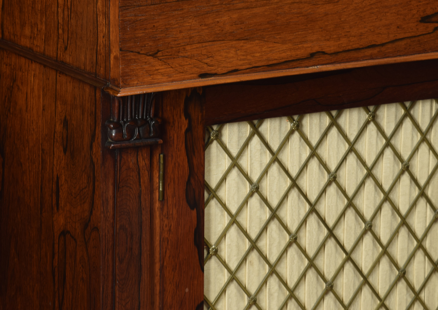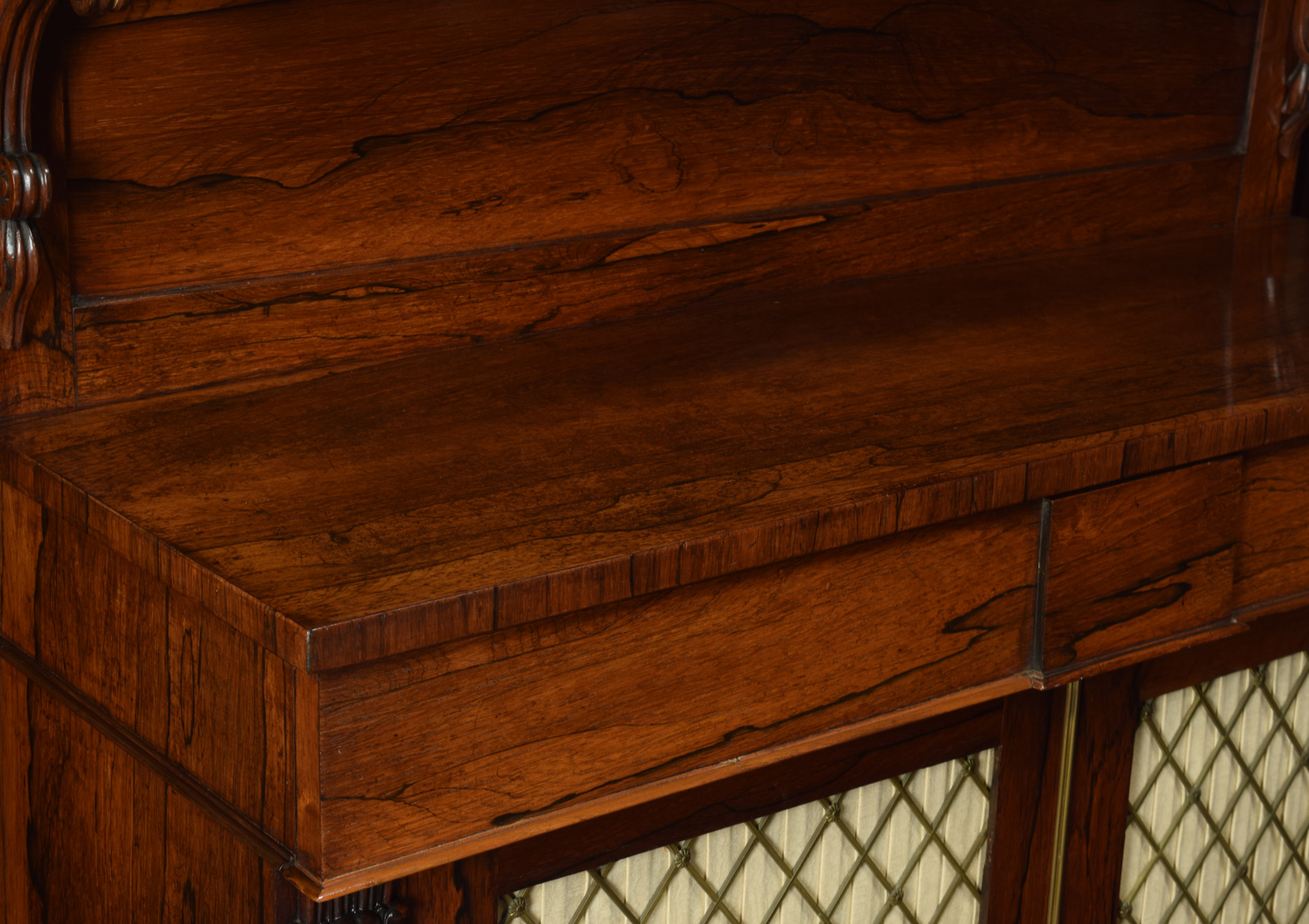 Regency rosewood two door chiffonier, the raised gallery back with reeded scroll supports above two short freeze draws the base section fitted with two silk panelled doors behind brass grilles. The doors opening to reveal a single fixed shelf all raised up on plinth base
