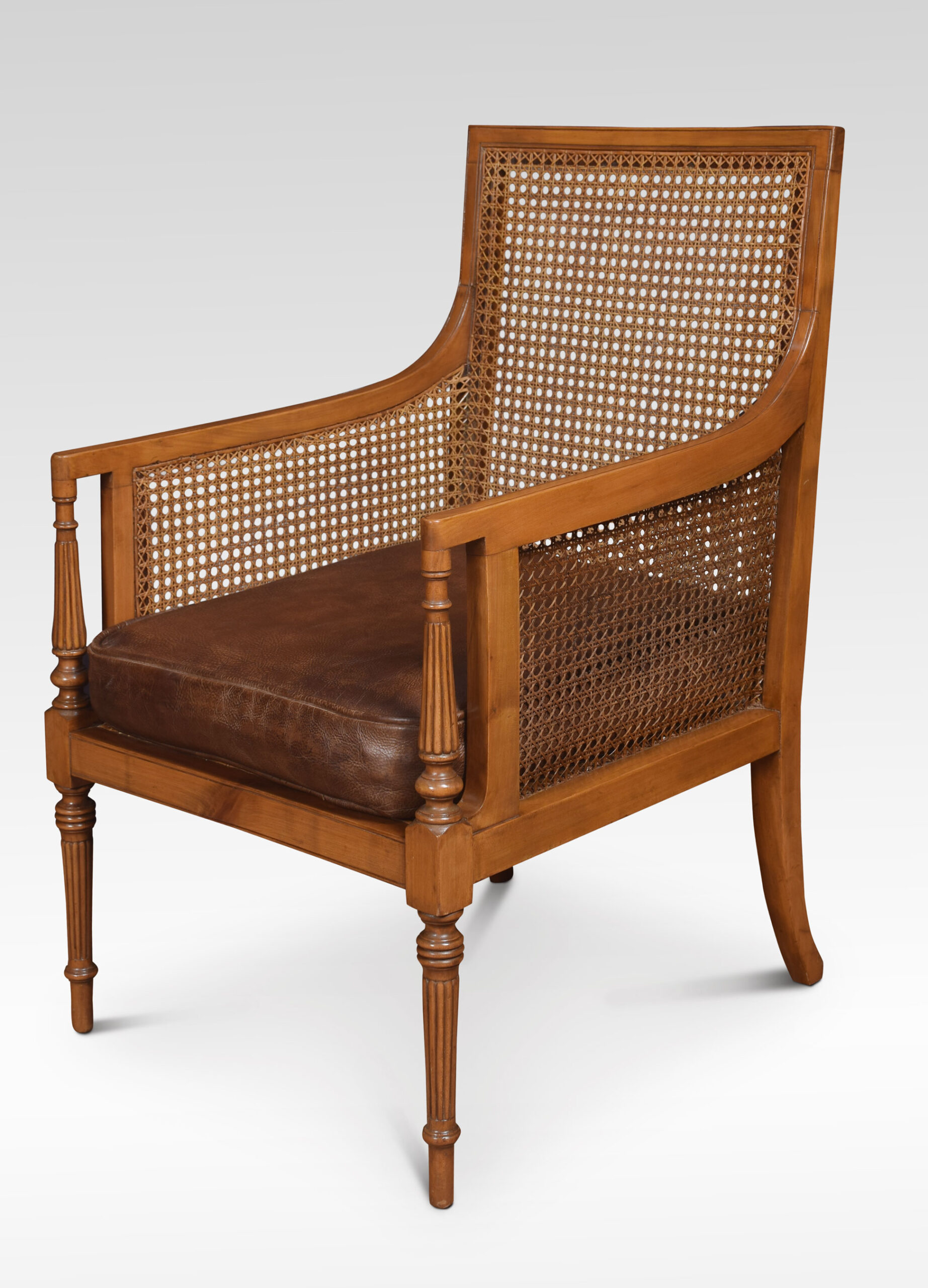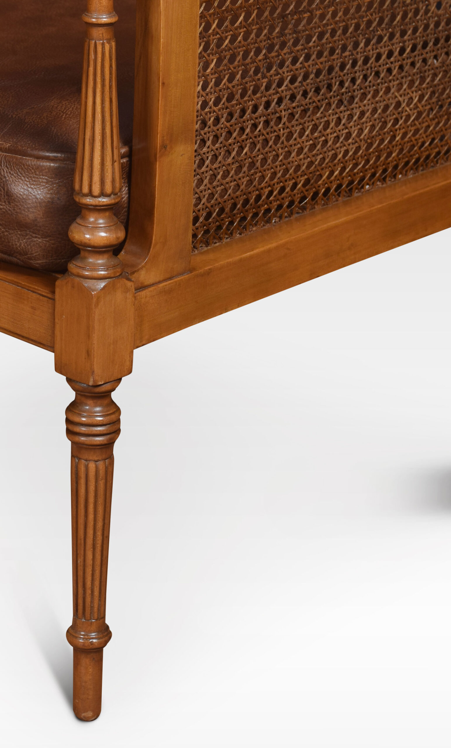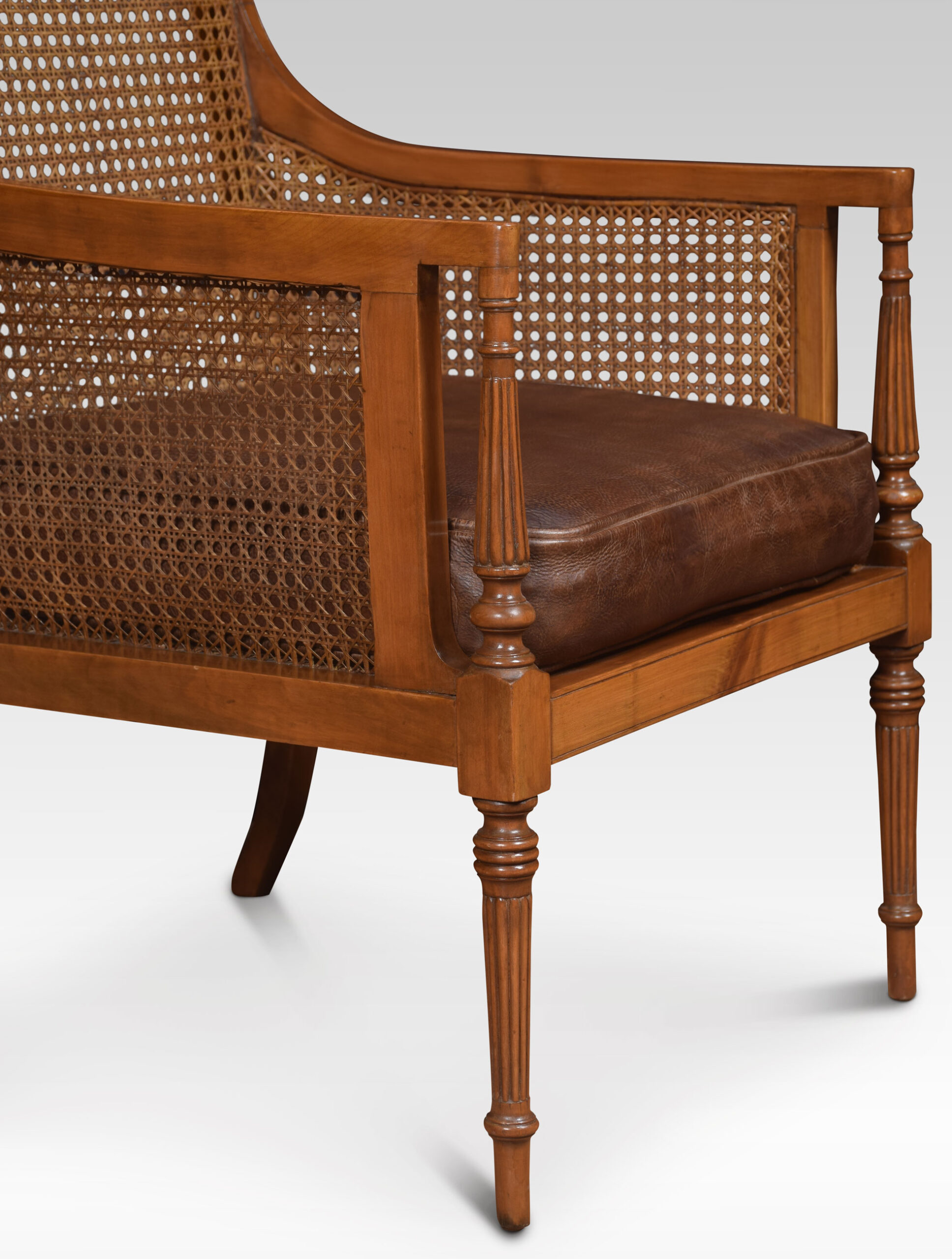 Early 20th-century bergere Armchair, the solid satinwood frame and inset bergere back and arms, above the removable brown leather cushion. Raised up on turned reeded tapering front legs.