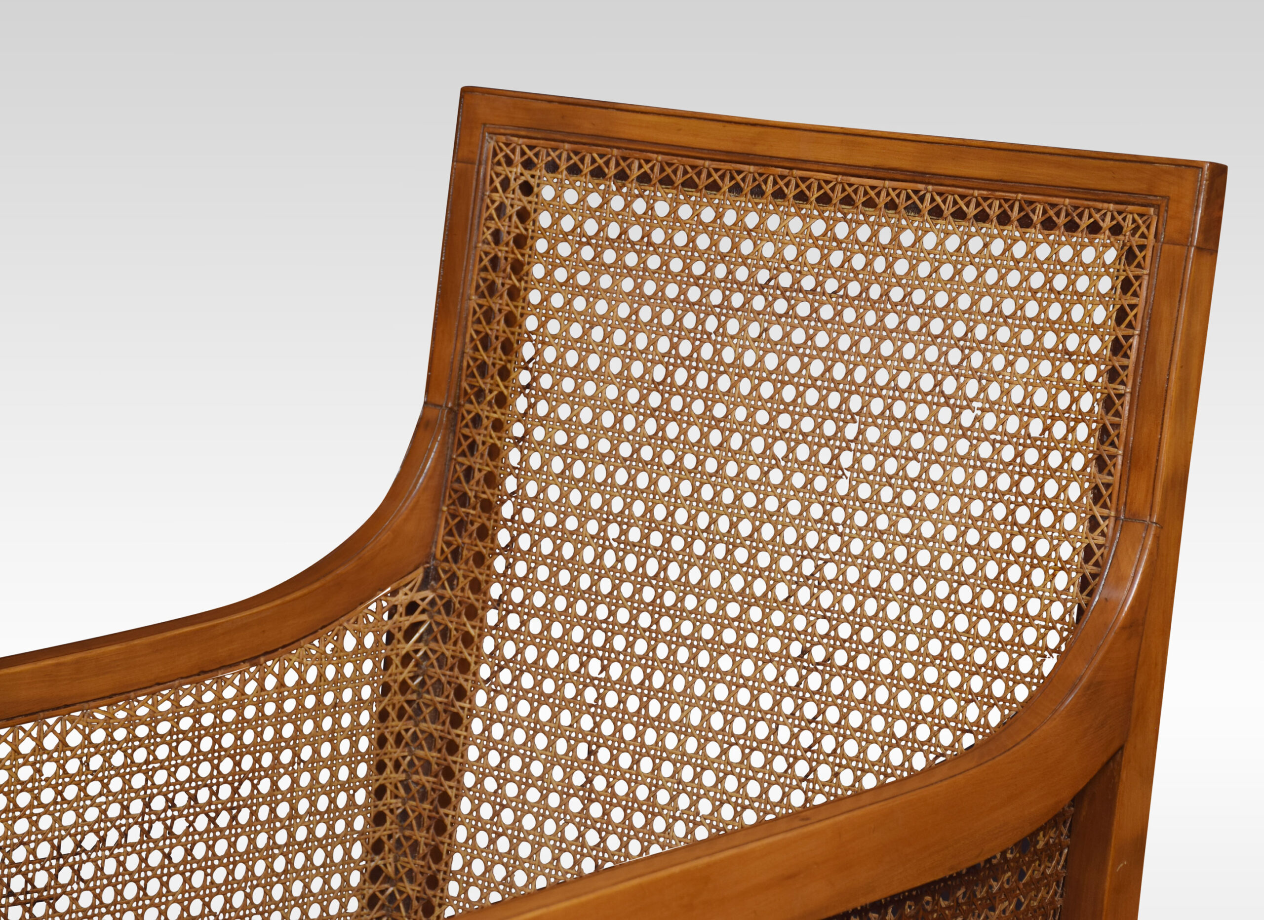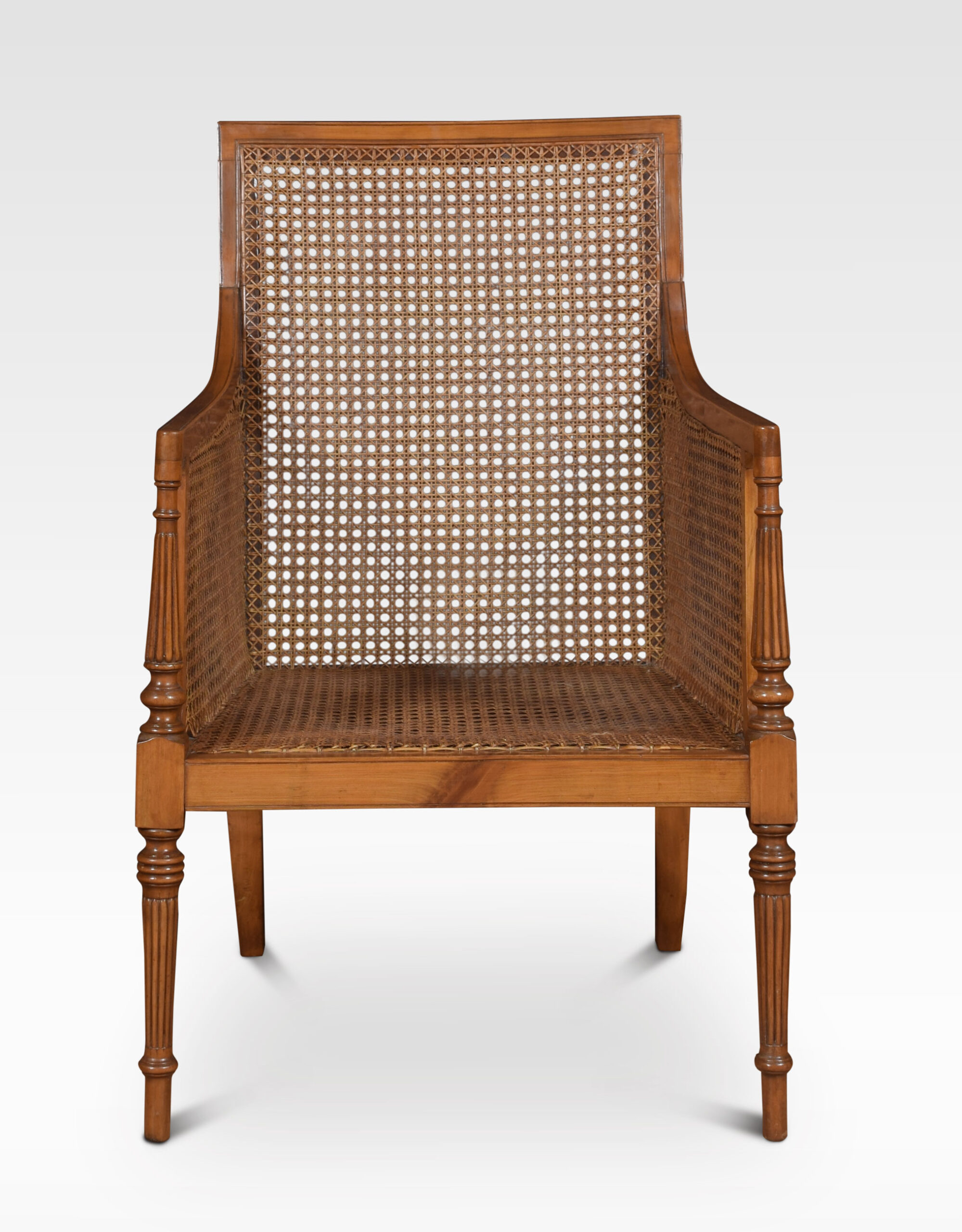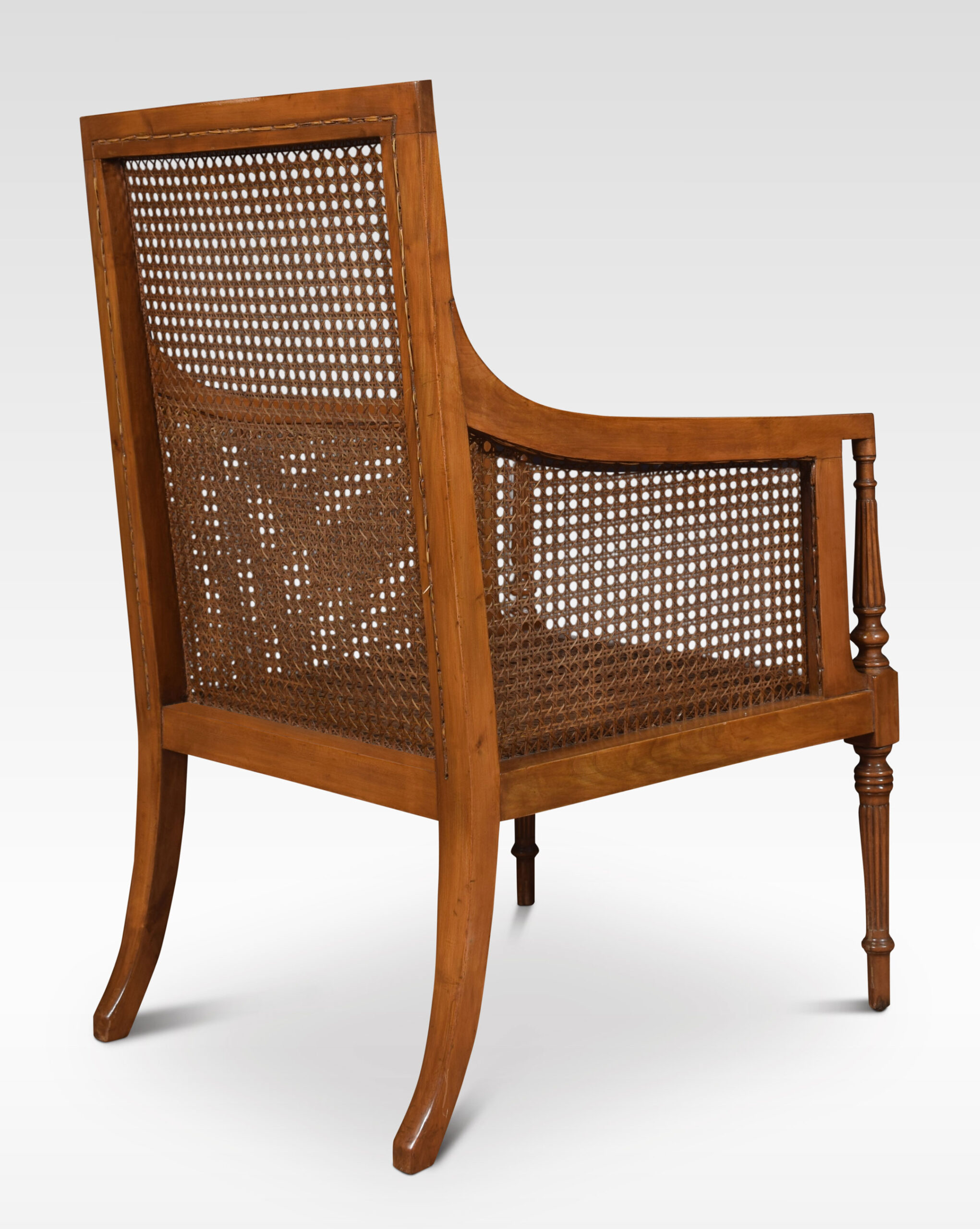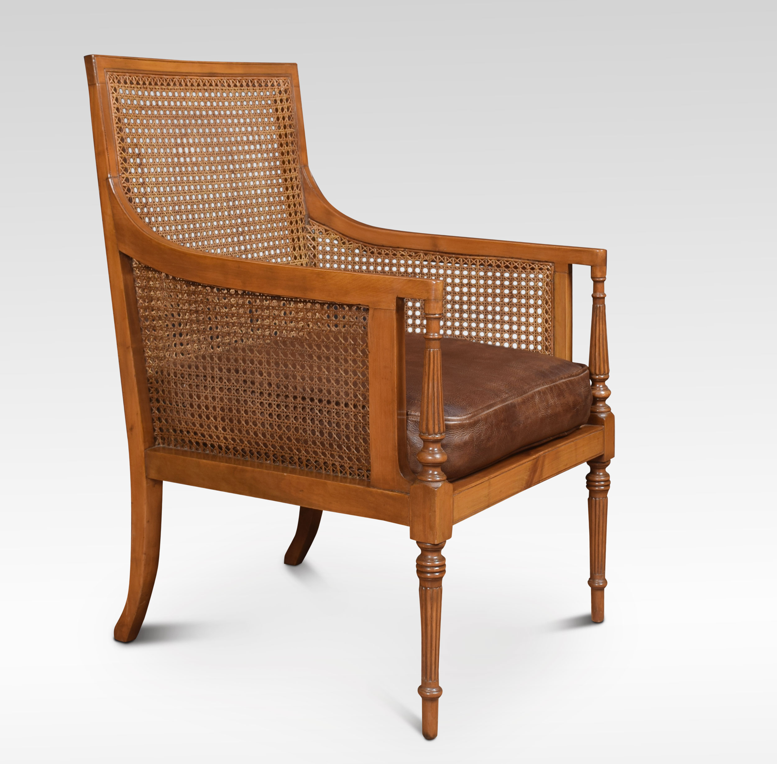 Early 20th-century bergere Armchair, the solid satinwood frame and inset bergere back and arms, above the removable brown leather cushion. Raised up on turned reeded tapering front legs.
