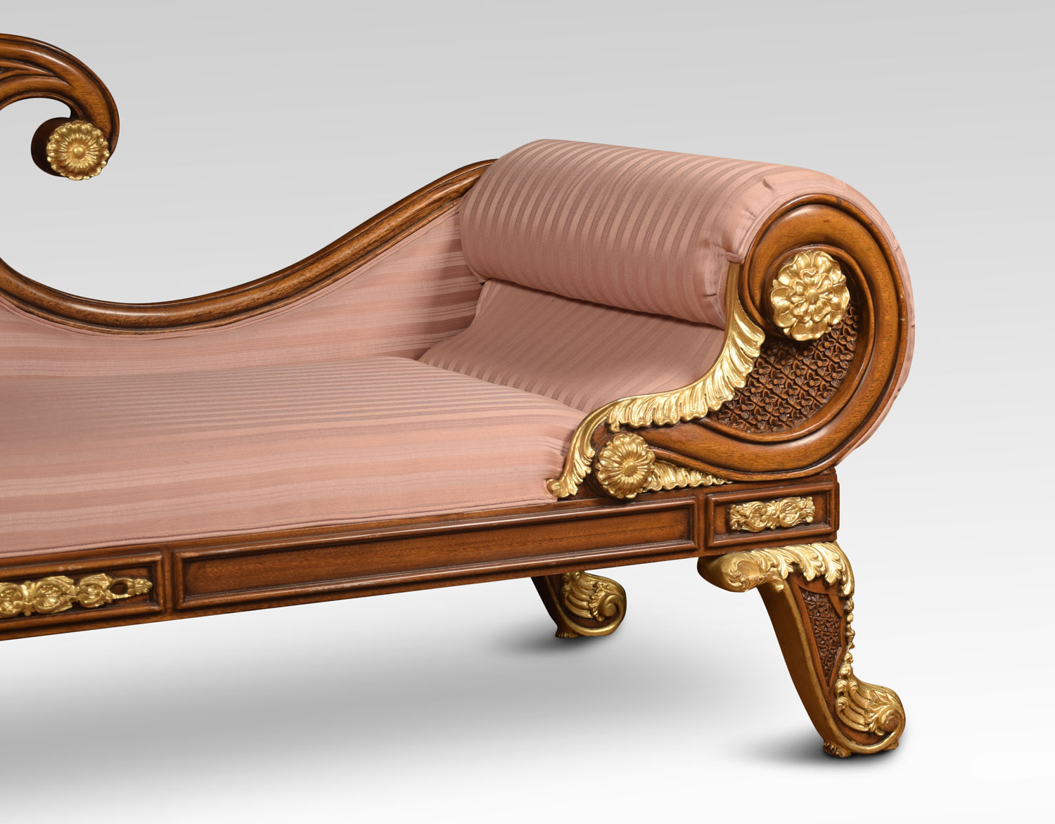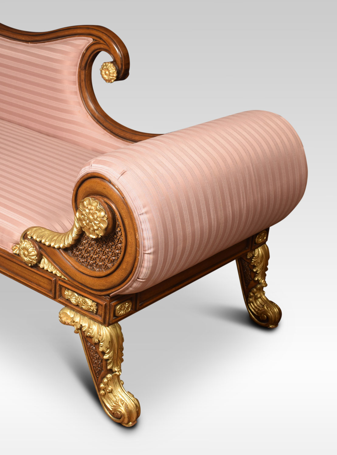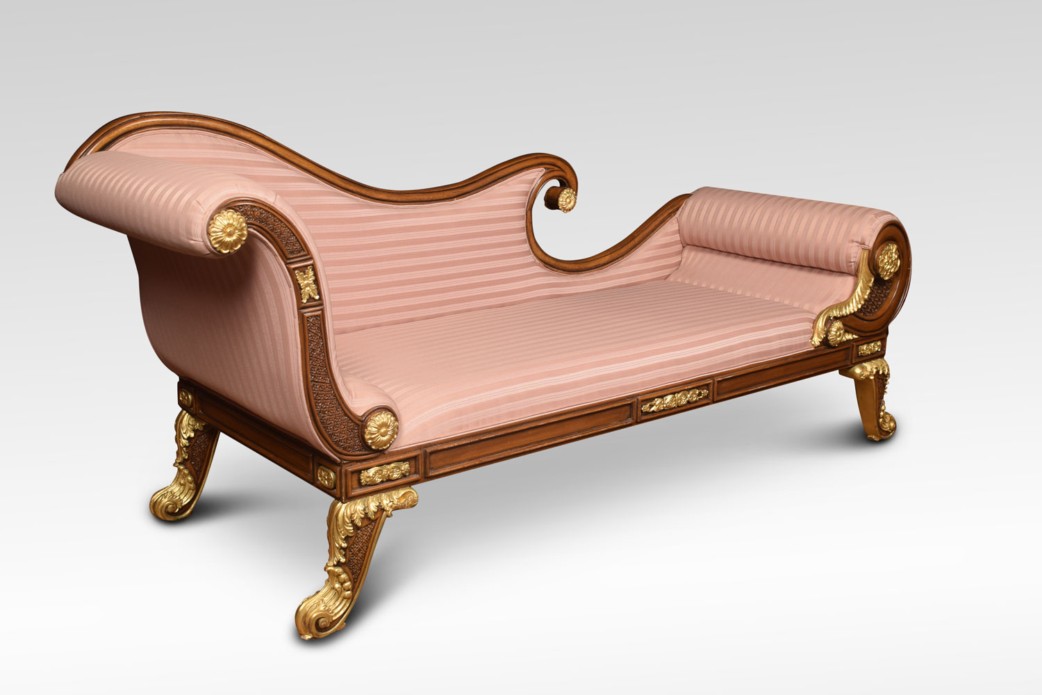 Regency revival mahogany and gilt chaise longue, with scroll ends and carved foliate decoration. To the padded seat and arm support upholstered striped pink damask. All raised up on heavily carved and gilded cabriole legs.