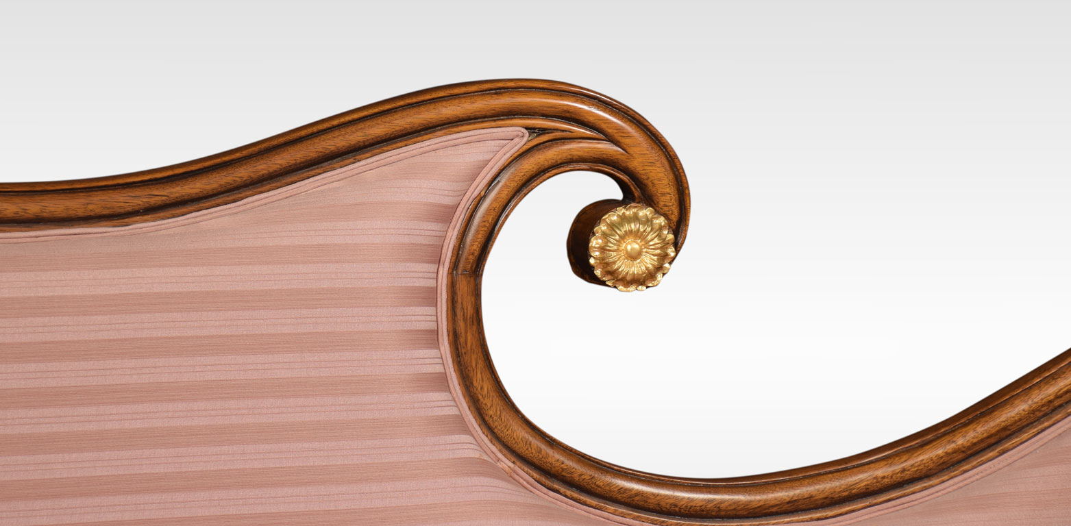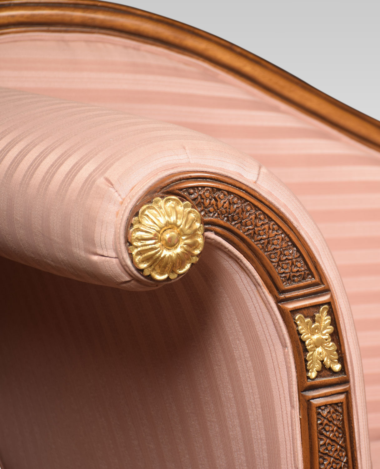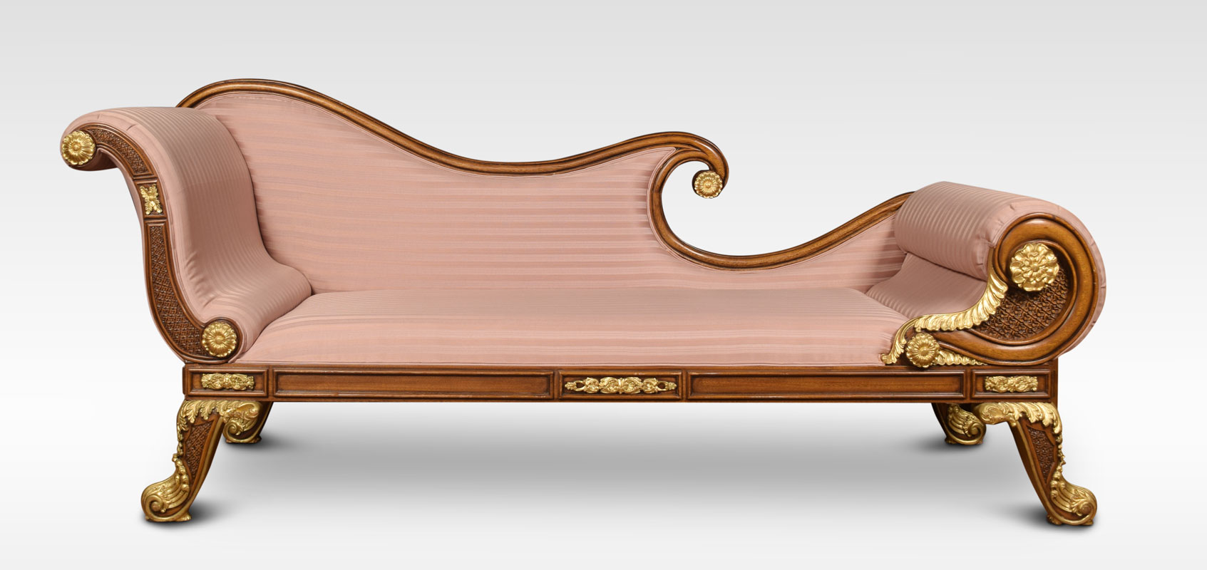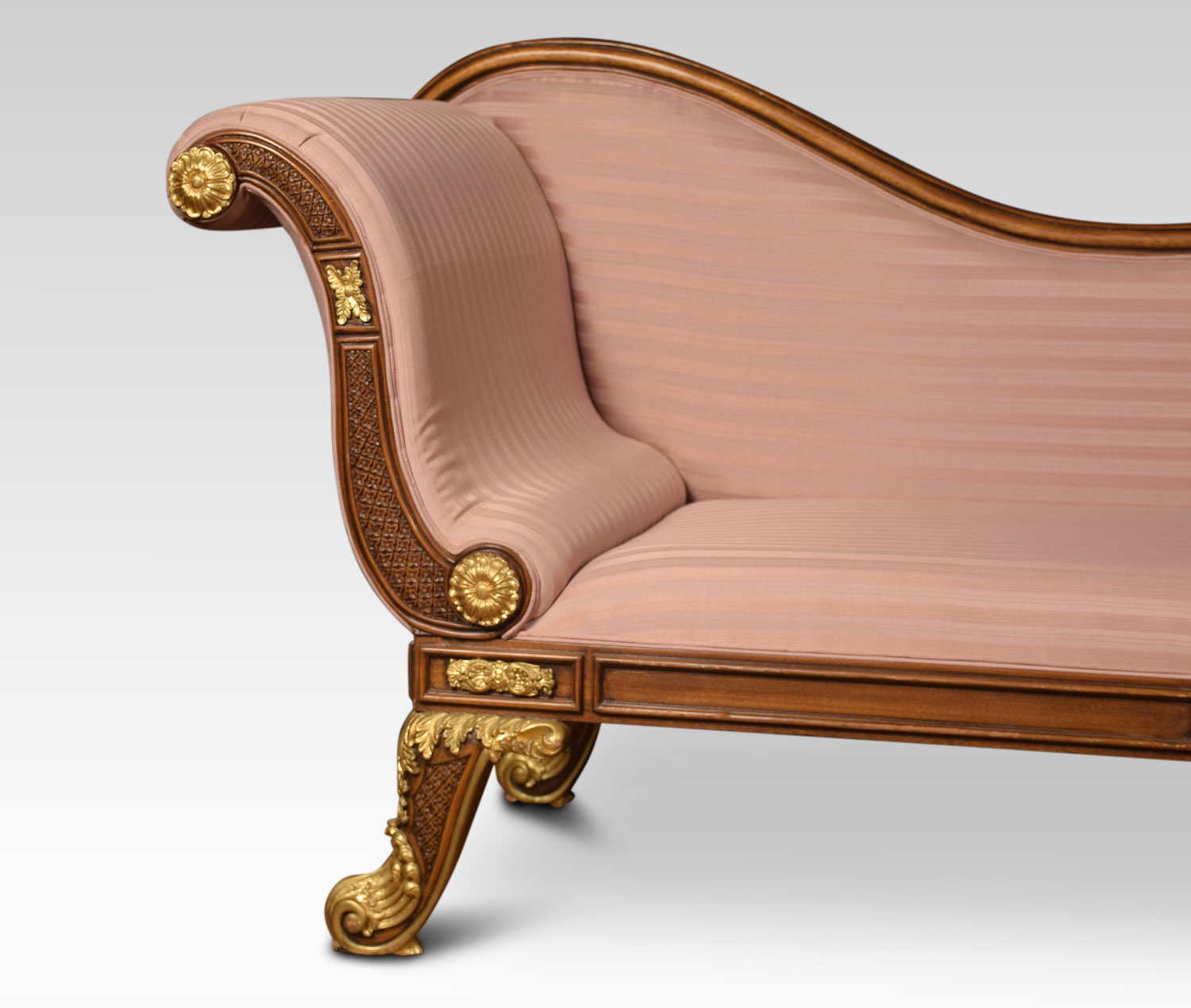 Regency revival mahogany and gilt chaise longue, with scroll ends and carved foliate decoration. To the padded seat and arm support upholstered striped pink damask. All raised up on heavily carved and gilded cabriole legs.