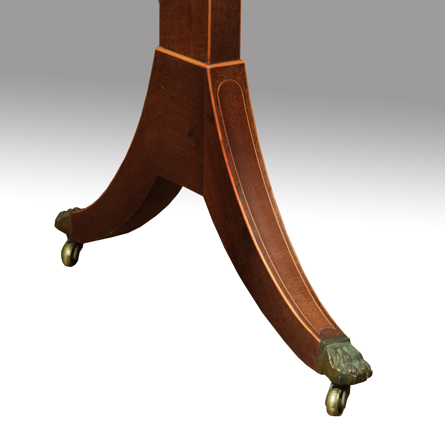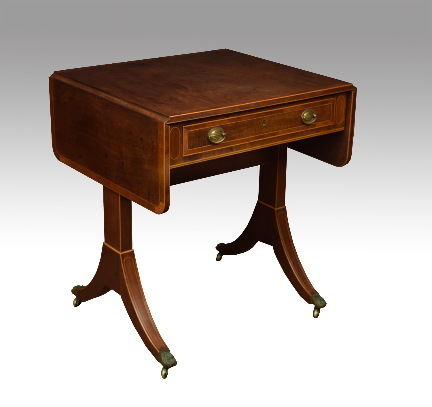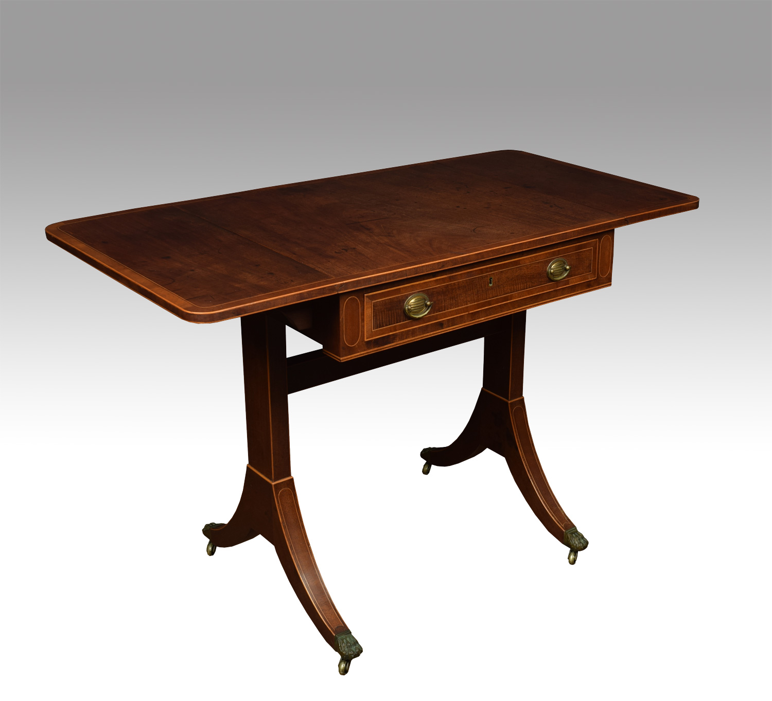 Regency mahogany sofa table of small proportions, the rounded rectangular string inlaid top above single drawer with brass handles. All raised up on sabre legs with brass caps and castors.