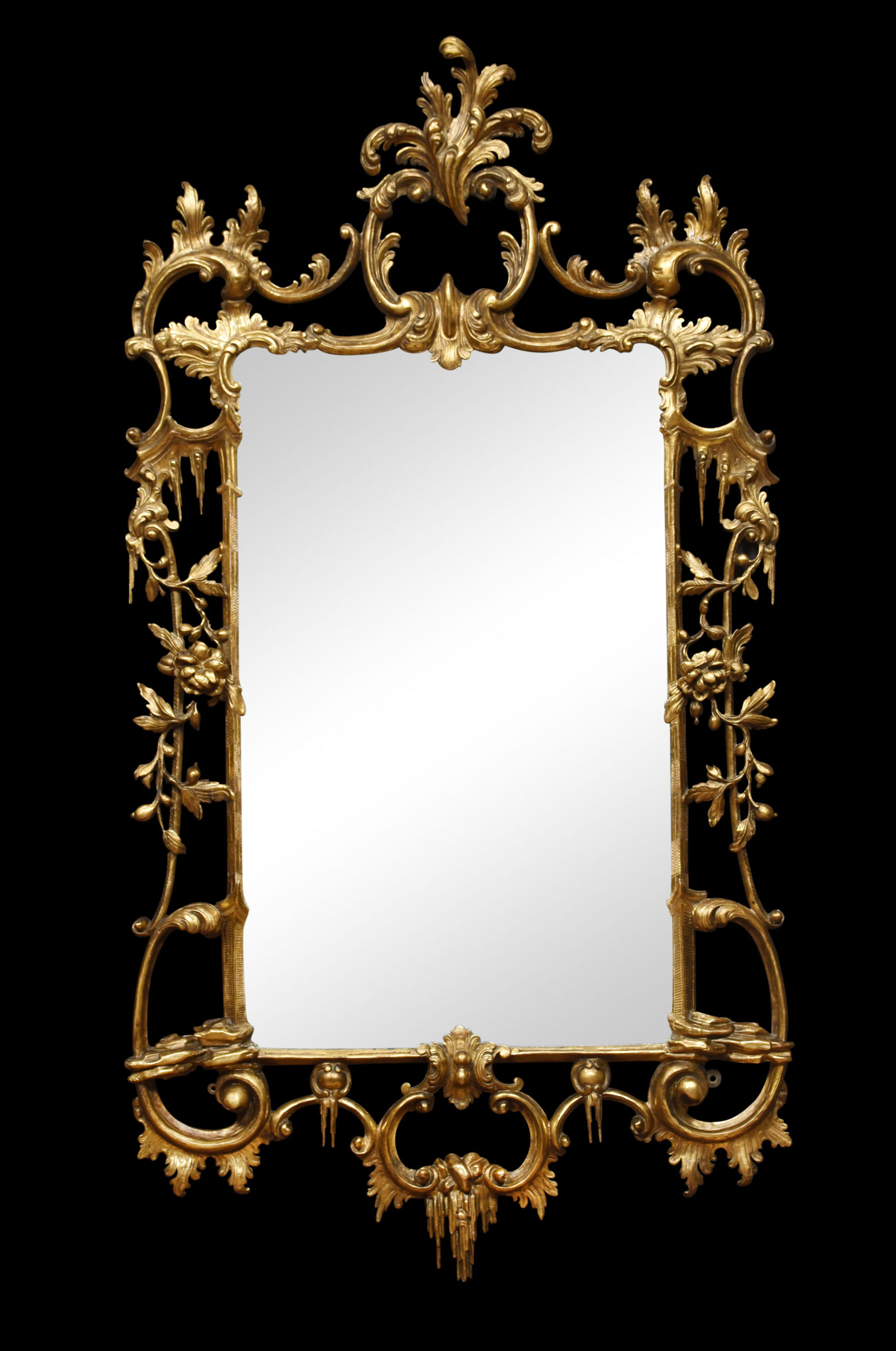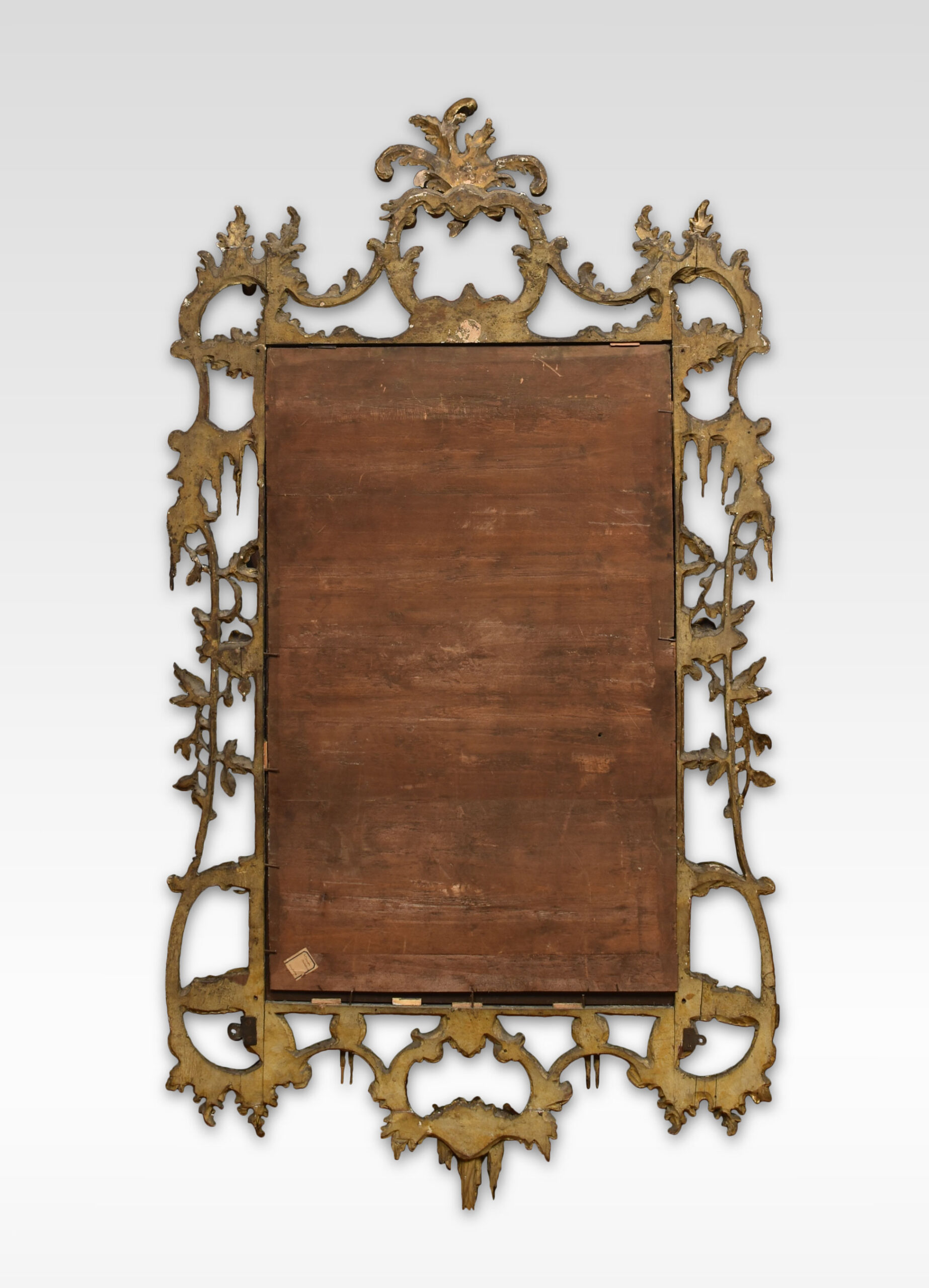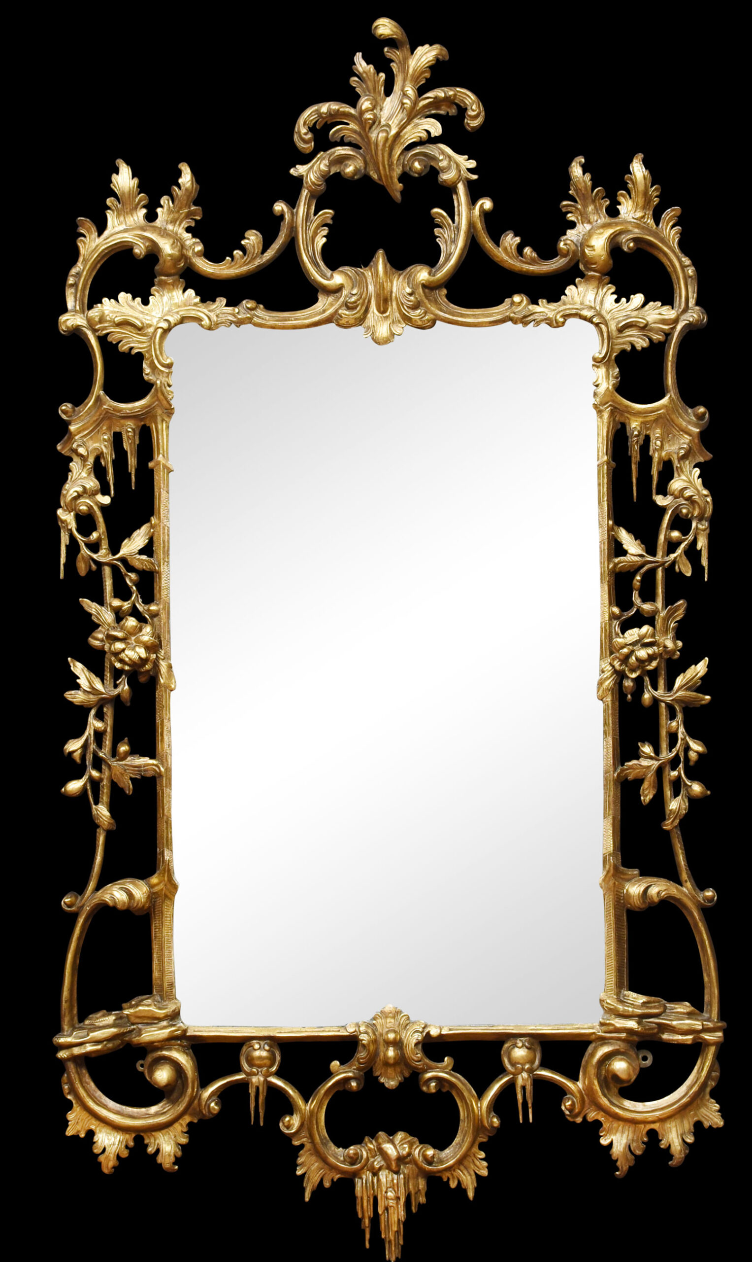Georgian giltwood mirror. The original cartouche-shaped bevelled plate mirror within a conforming frame elaborately carved with rocaille and c-scrolls.
