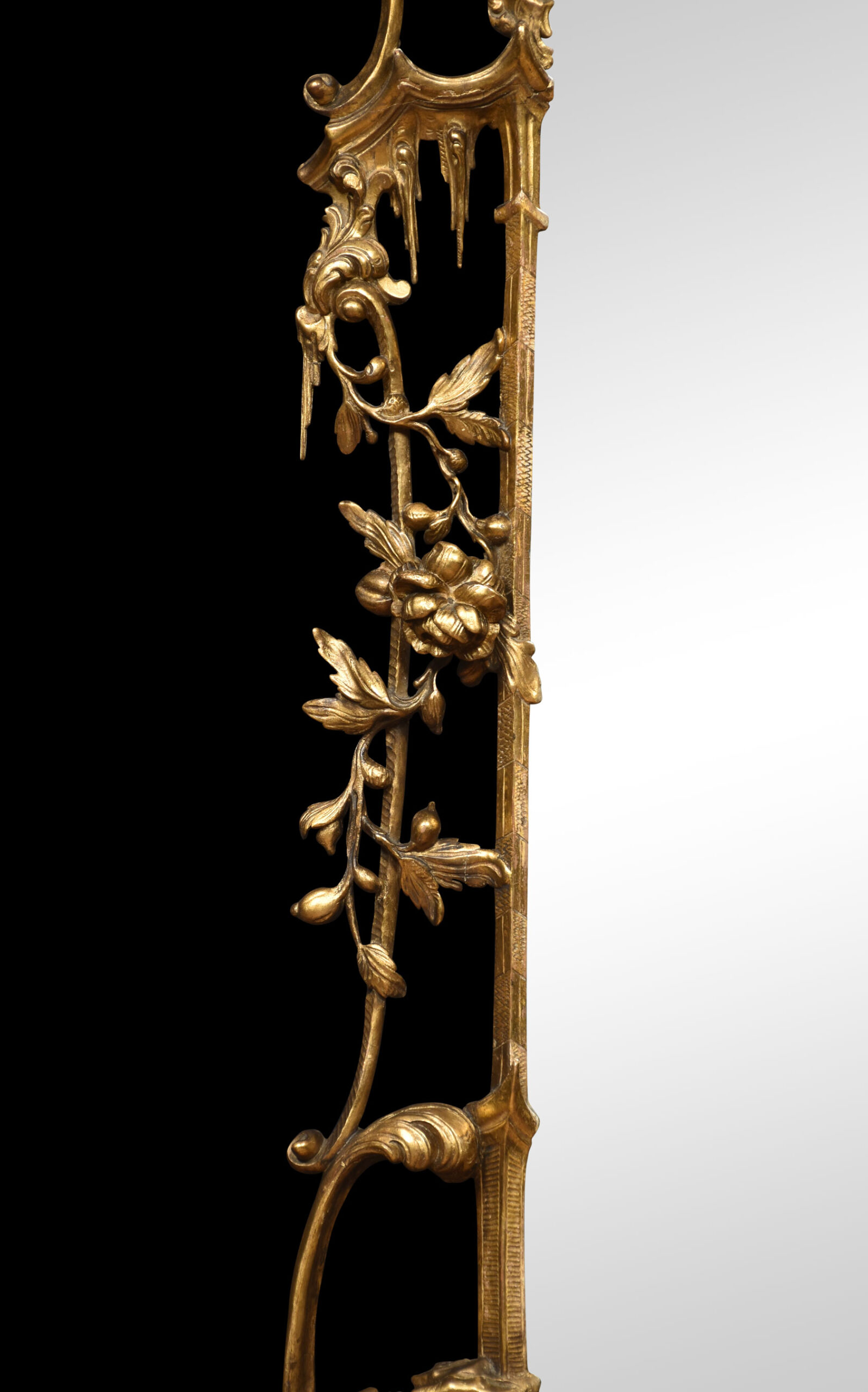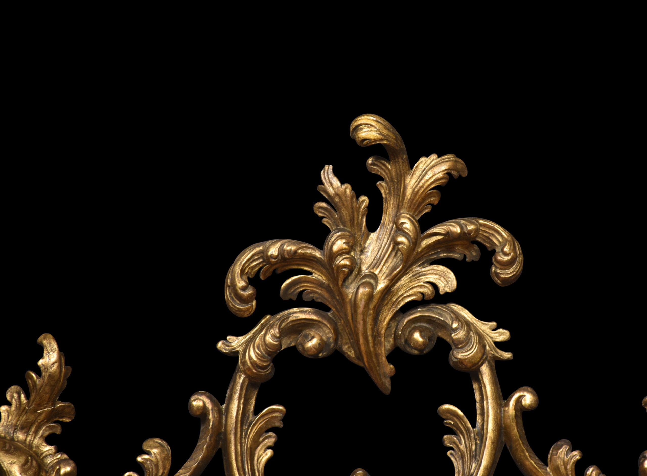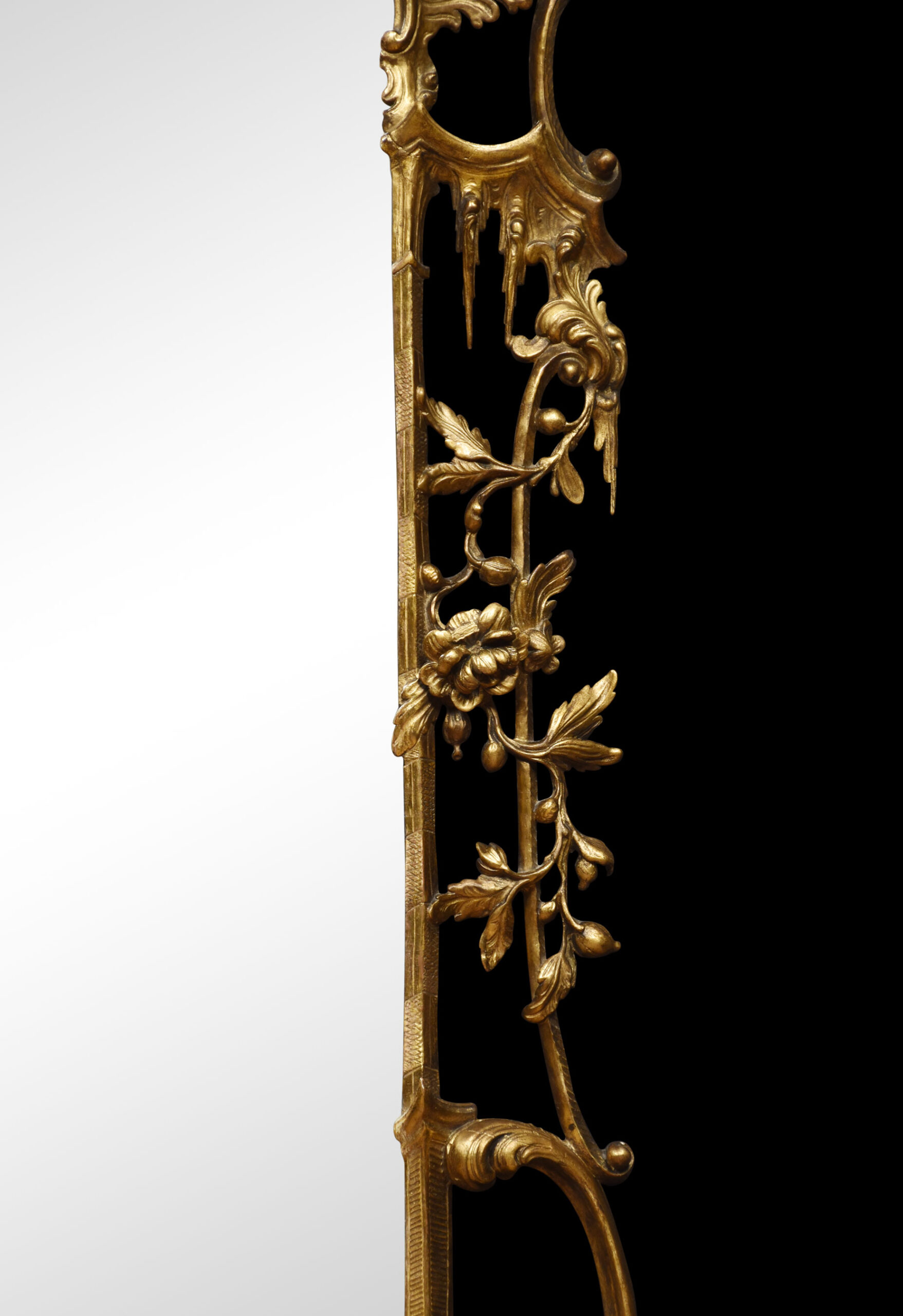 Georgian giltwood mirror. The original cartouche-shaped bevelled plate mirror within a conforming frame elaborately carved with rocaille and c-scrolls.