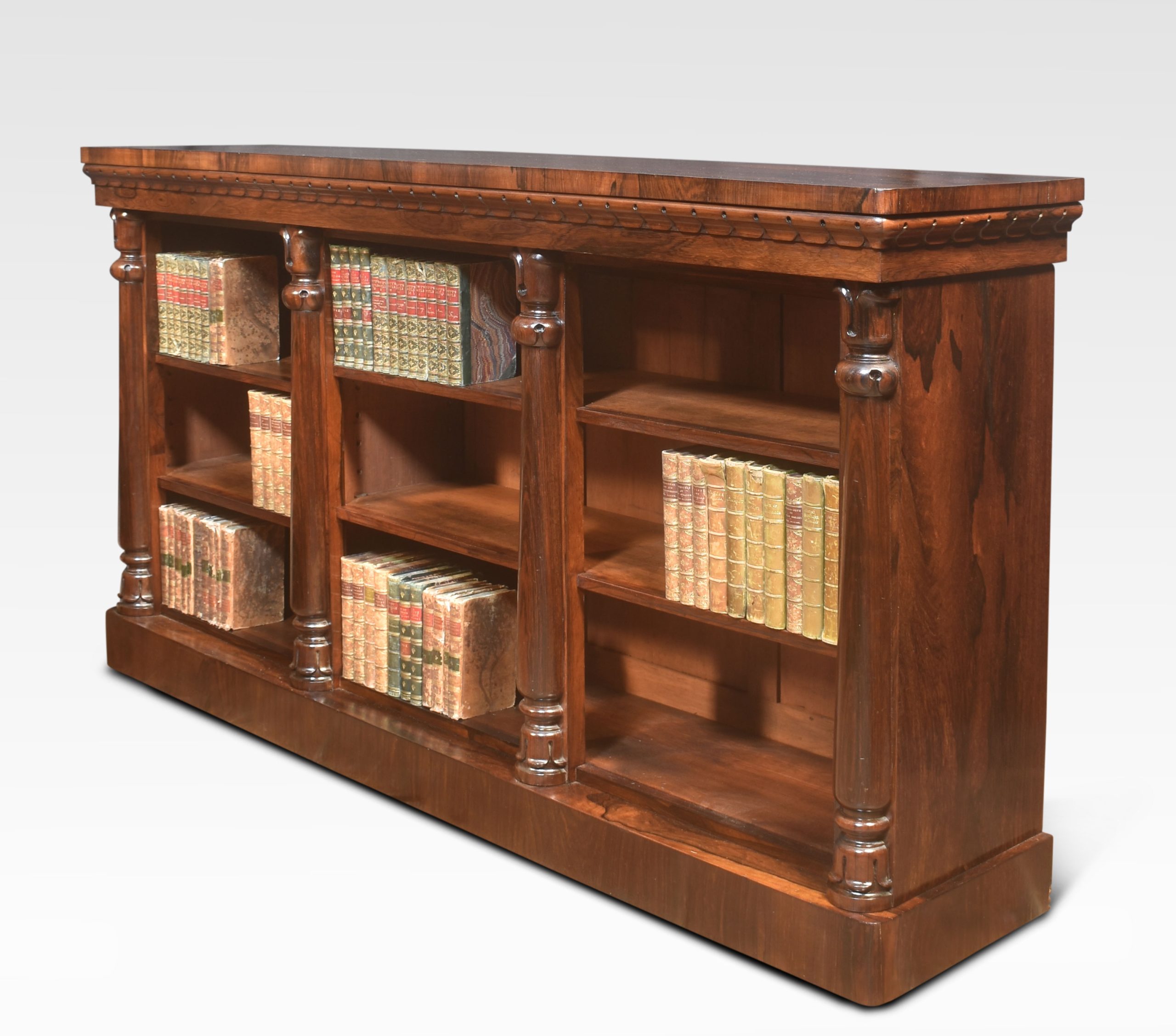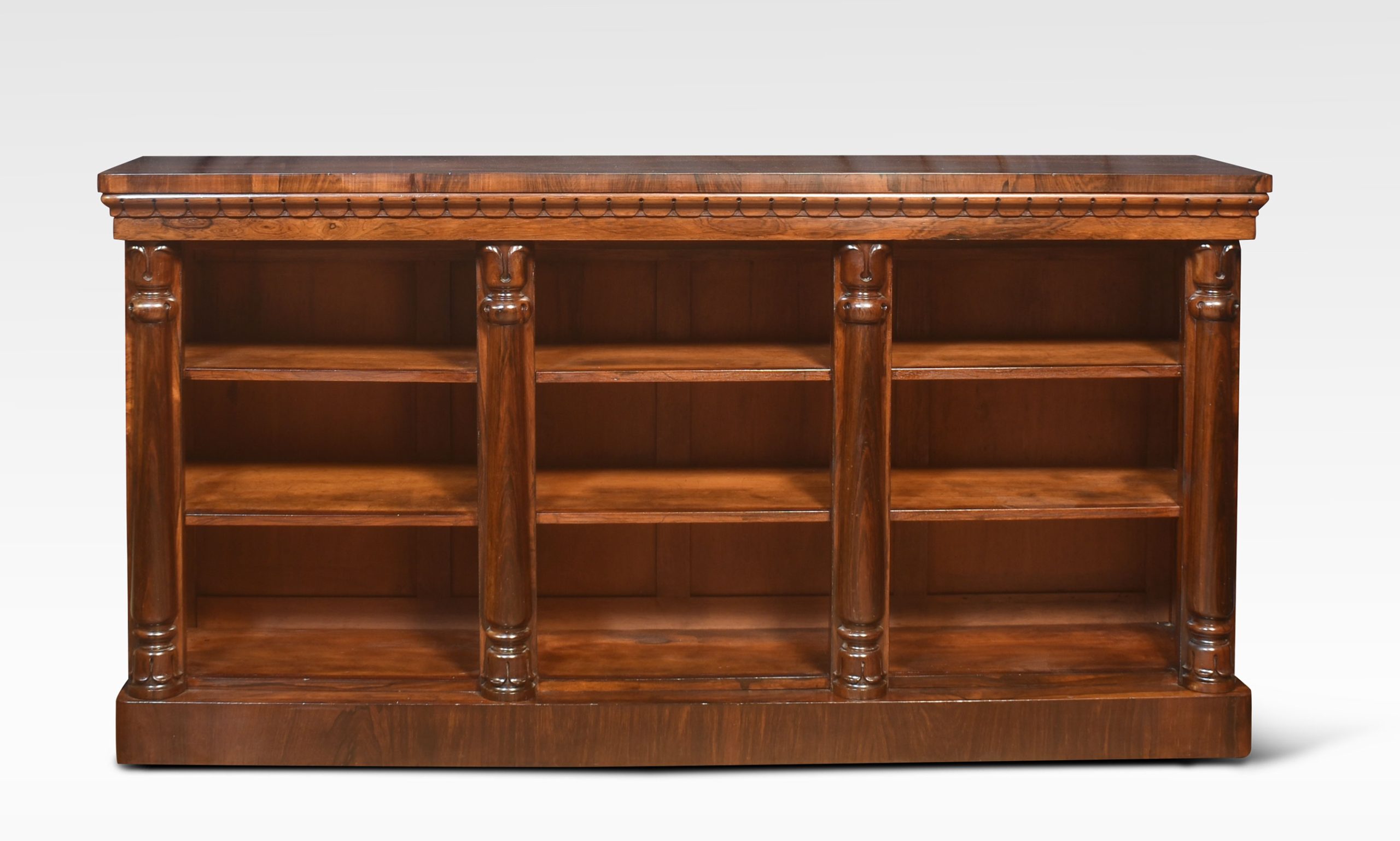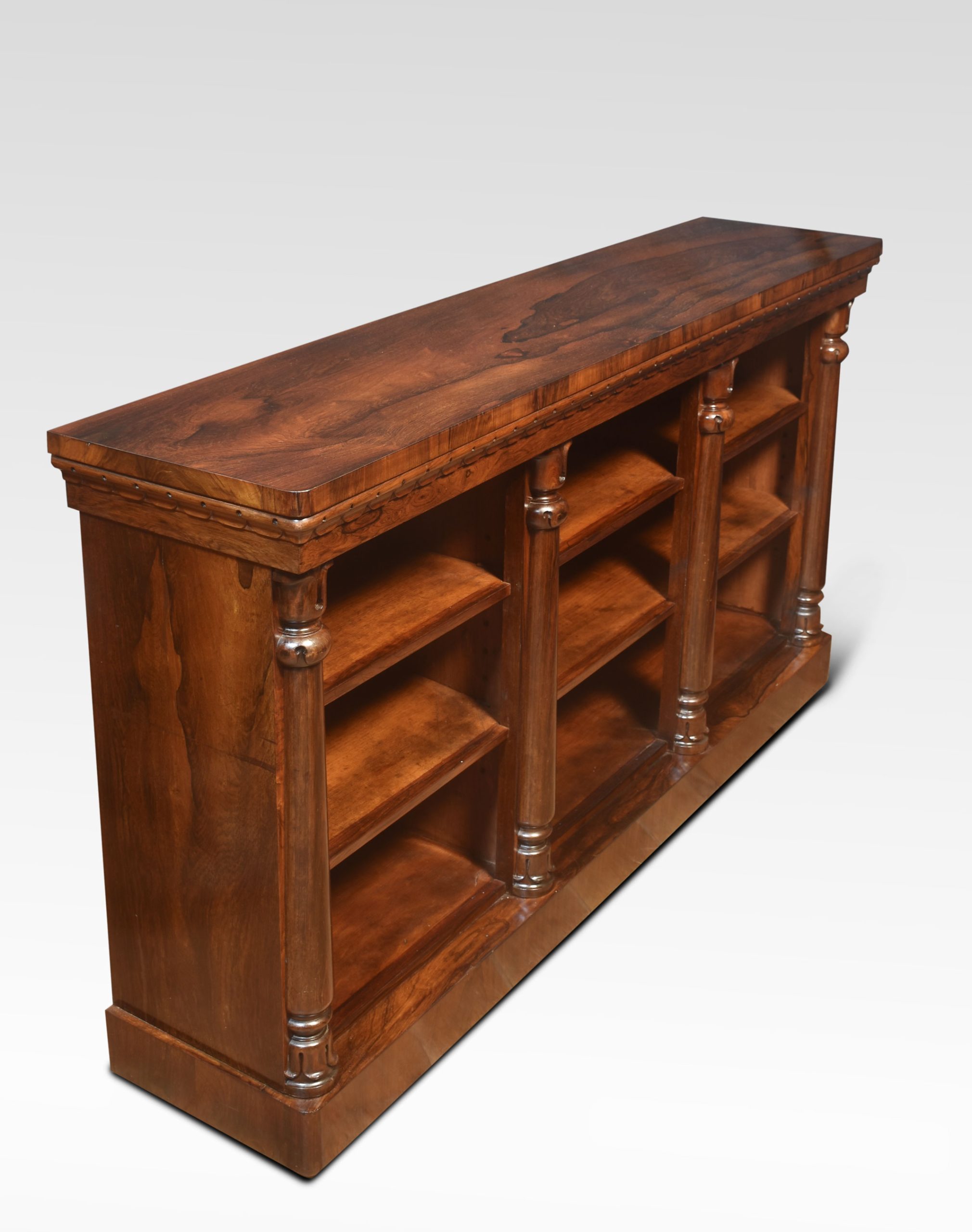 Rosewood open bookcase, the large rectangular well-figured top above three bays of adjustable shelves, divided by turned column pilasters. All raised up on a plinth base.