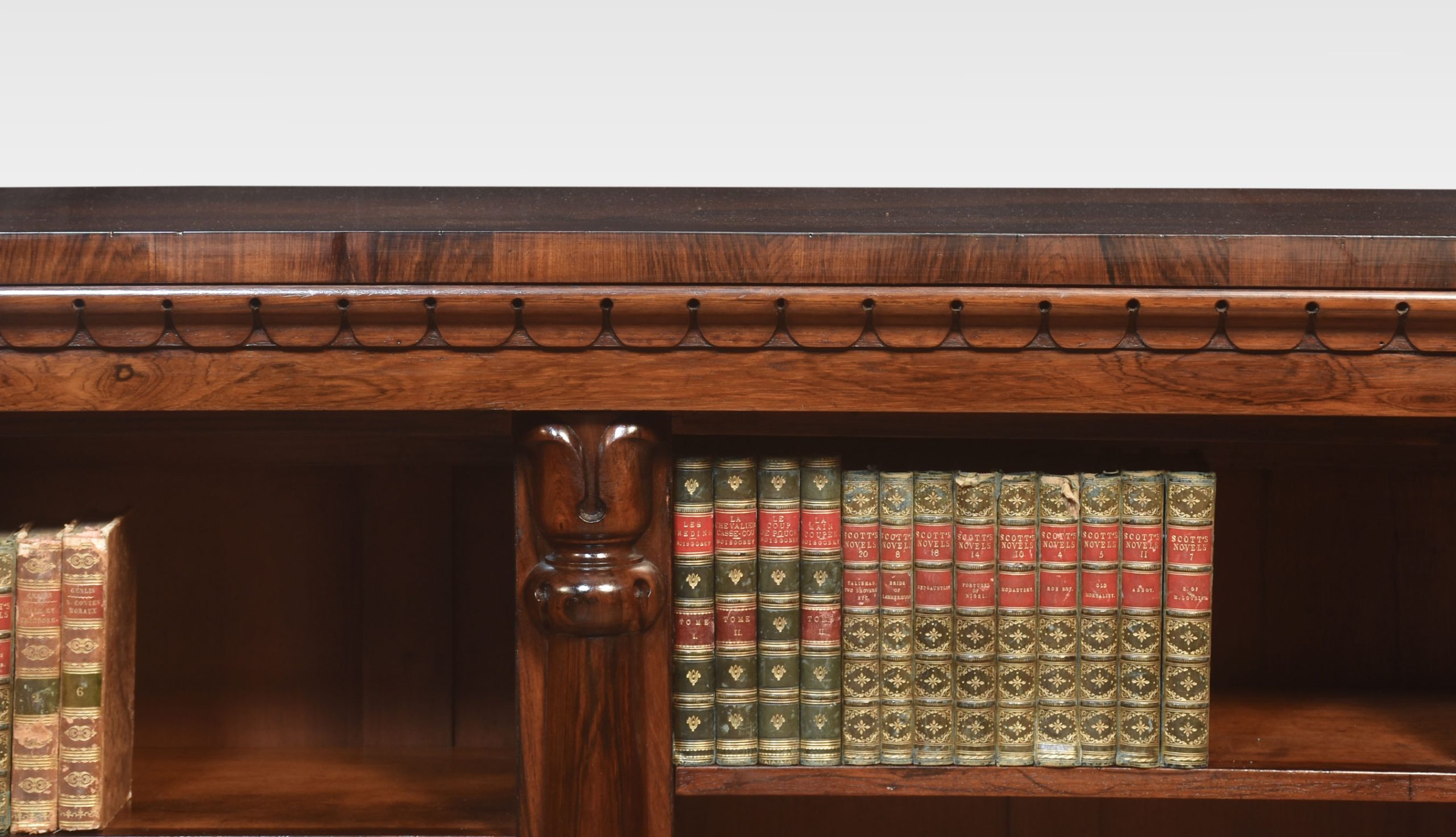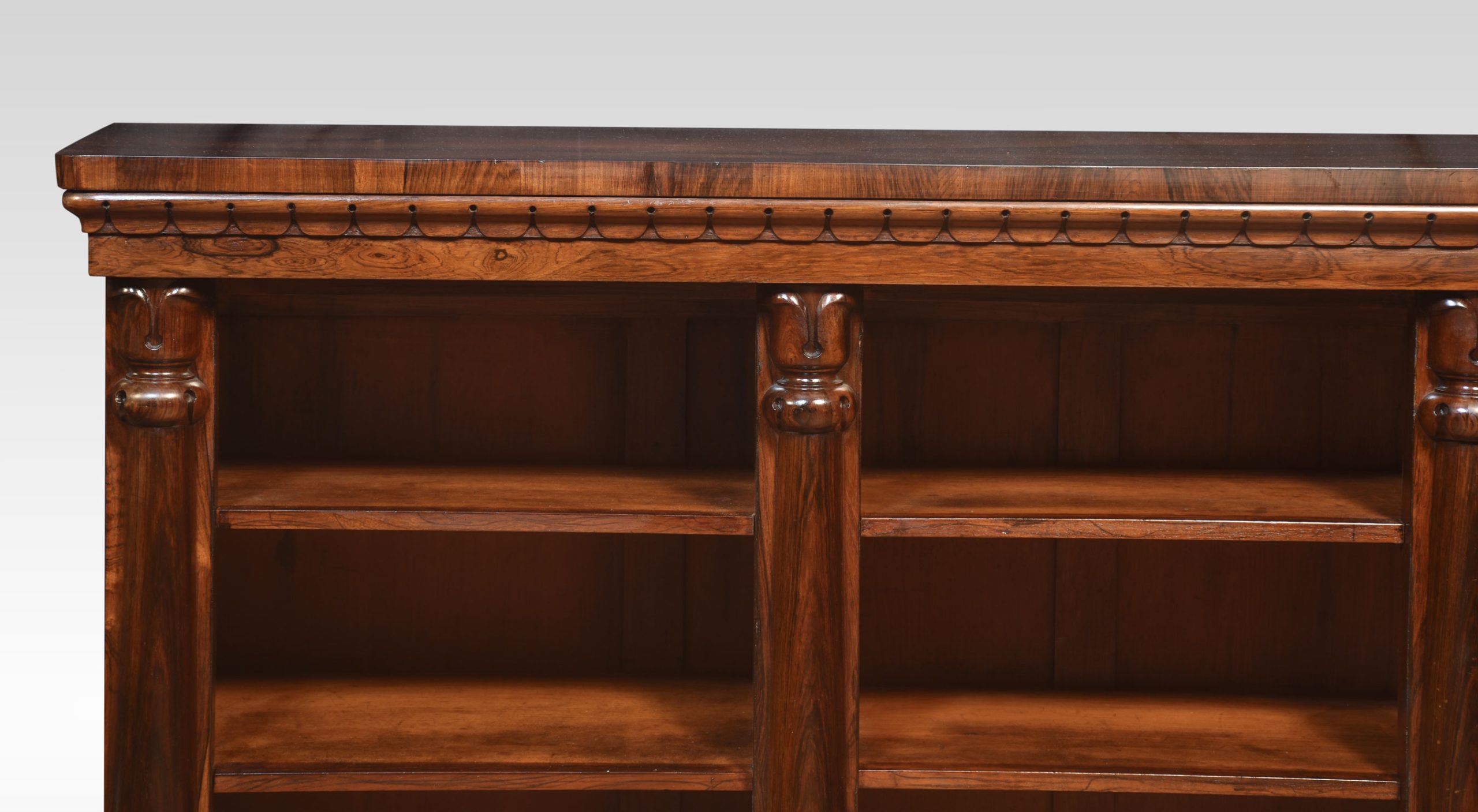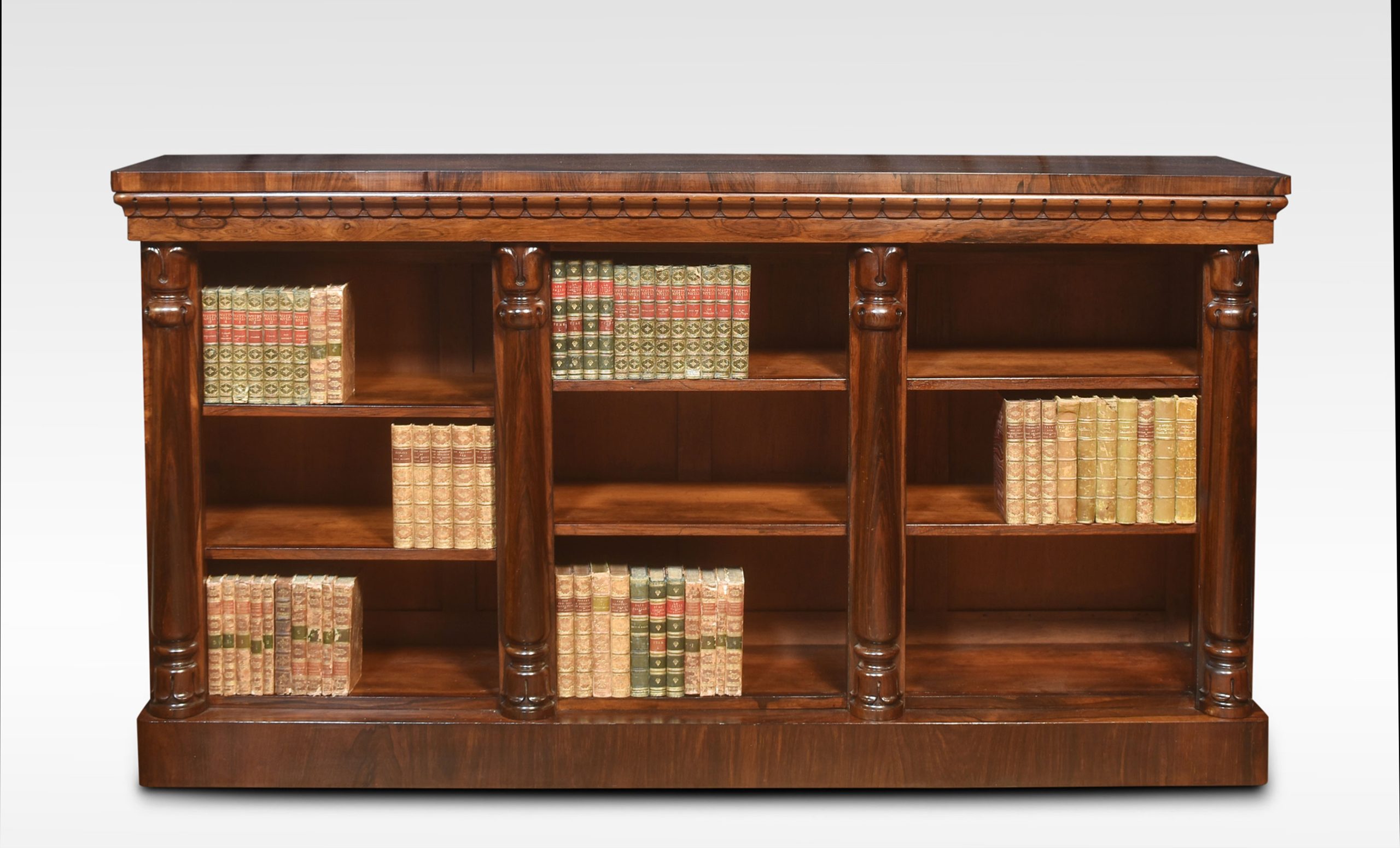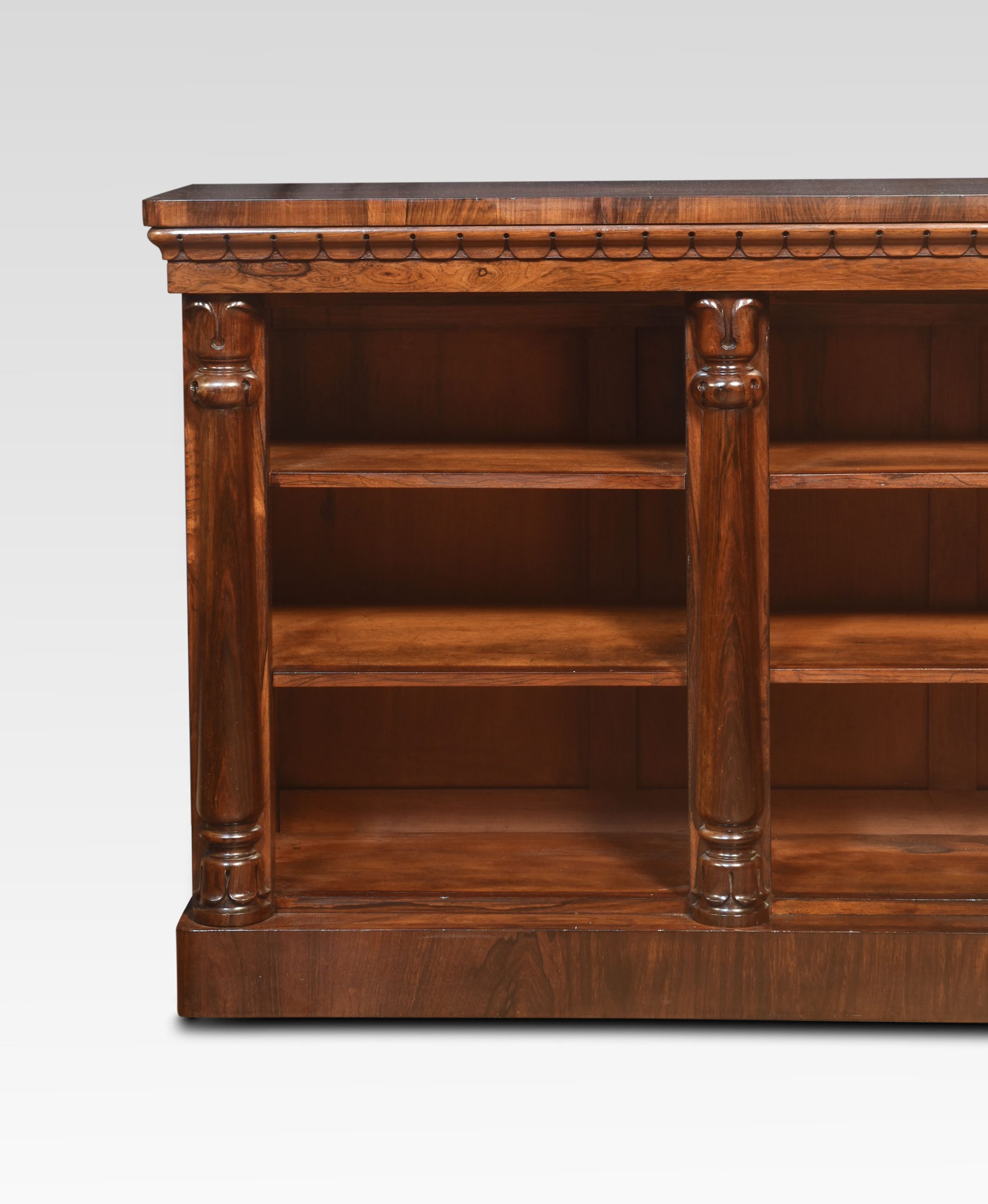 Rosewood open bookcase, the large rectangular well-figured top above three bays of adjustable shelves, divided by turned column pilasters. All raised up on a plinth base.