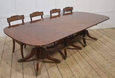 Rosewood library table, the rectangular top with rounded corners, above a frieze drawer, raised on tapering columns and trestle ends, terminating in scrolling toes with recessed castors.