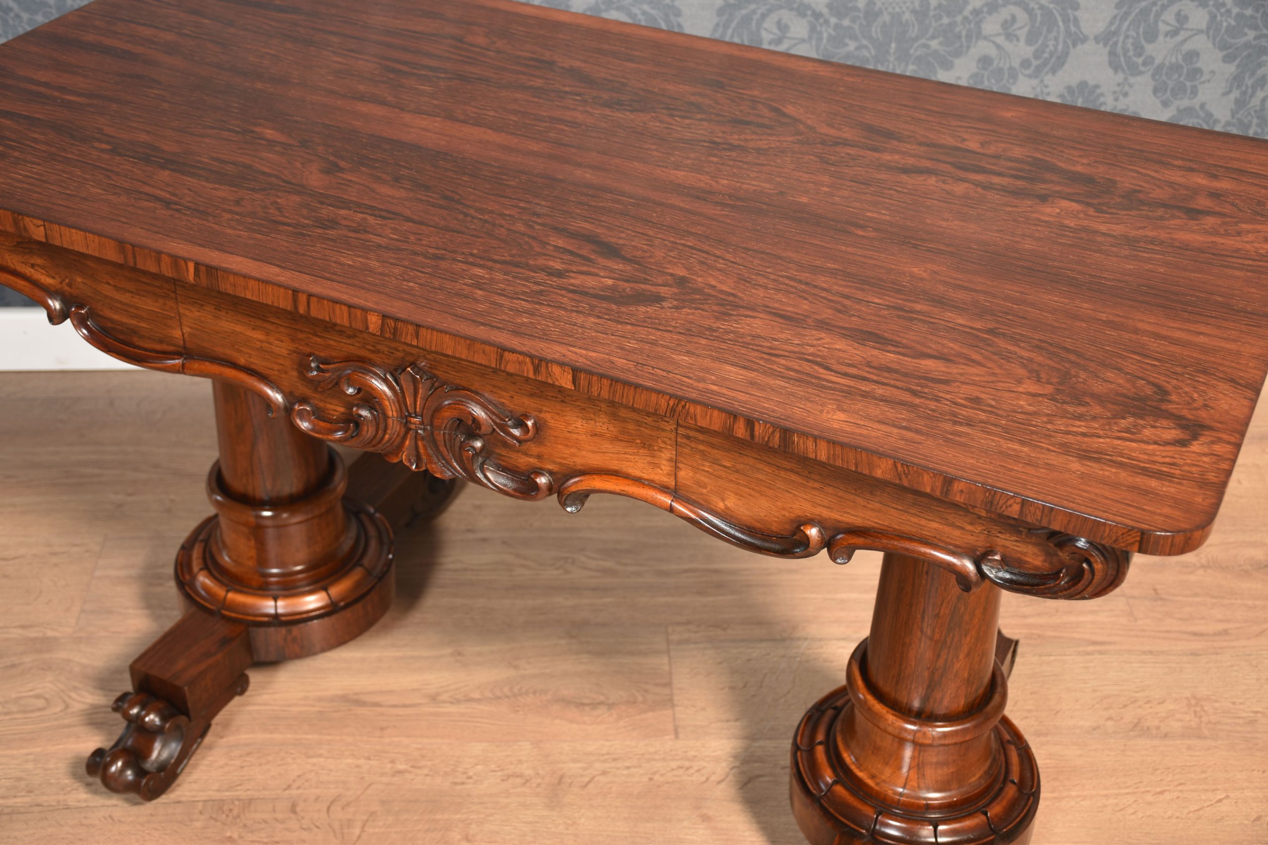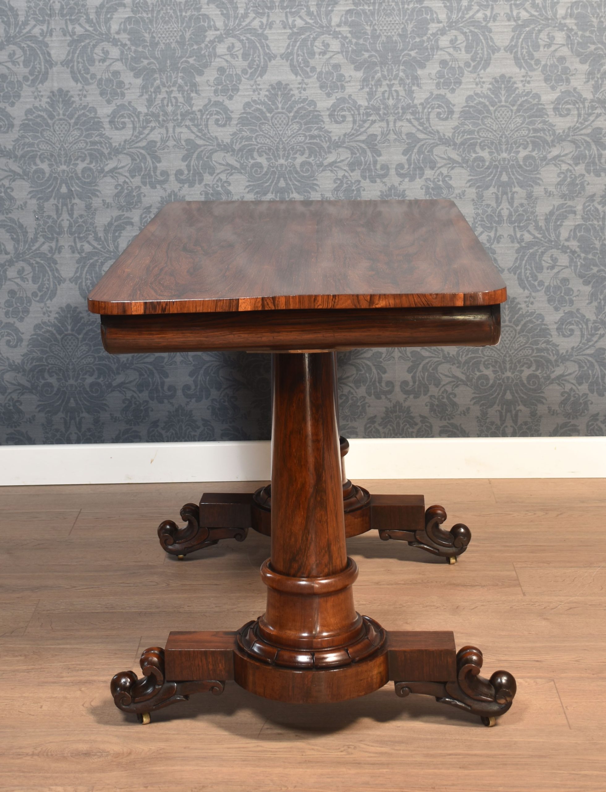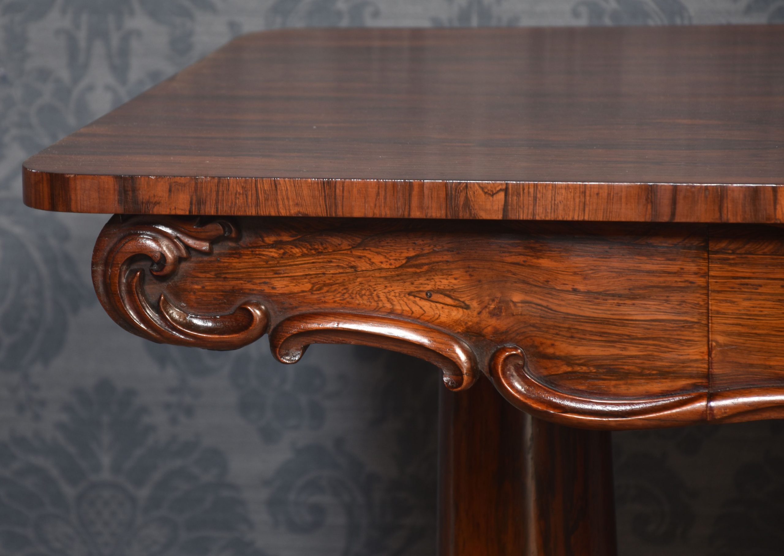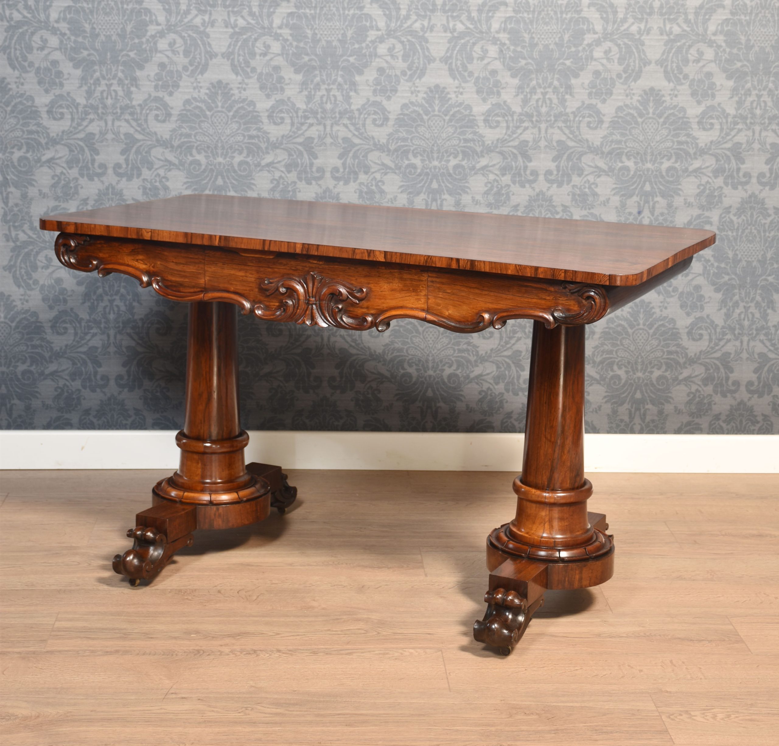 Rosewood library table, the rectangular top with rounded corners, above a frieze drawer, raised on tapering columns and trestle ends, terminating in scrolling toes with recessed castors.