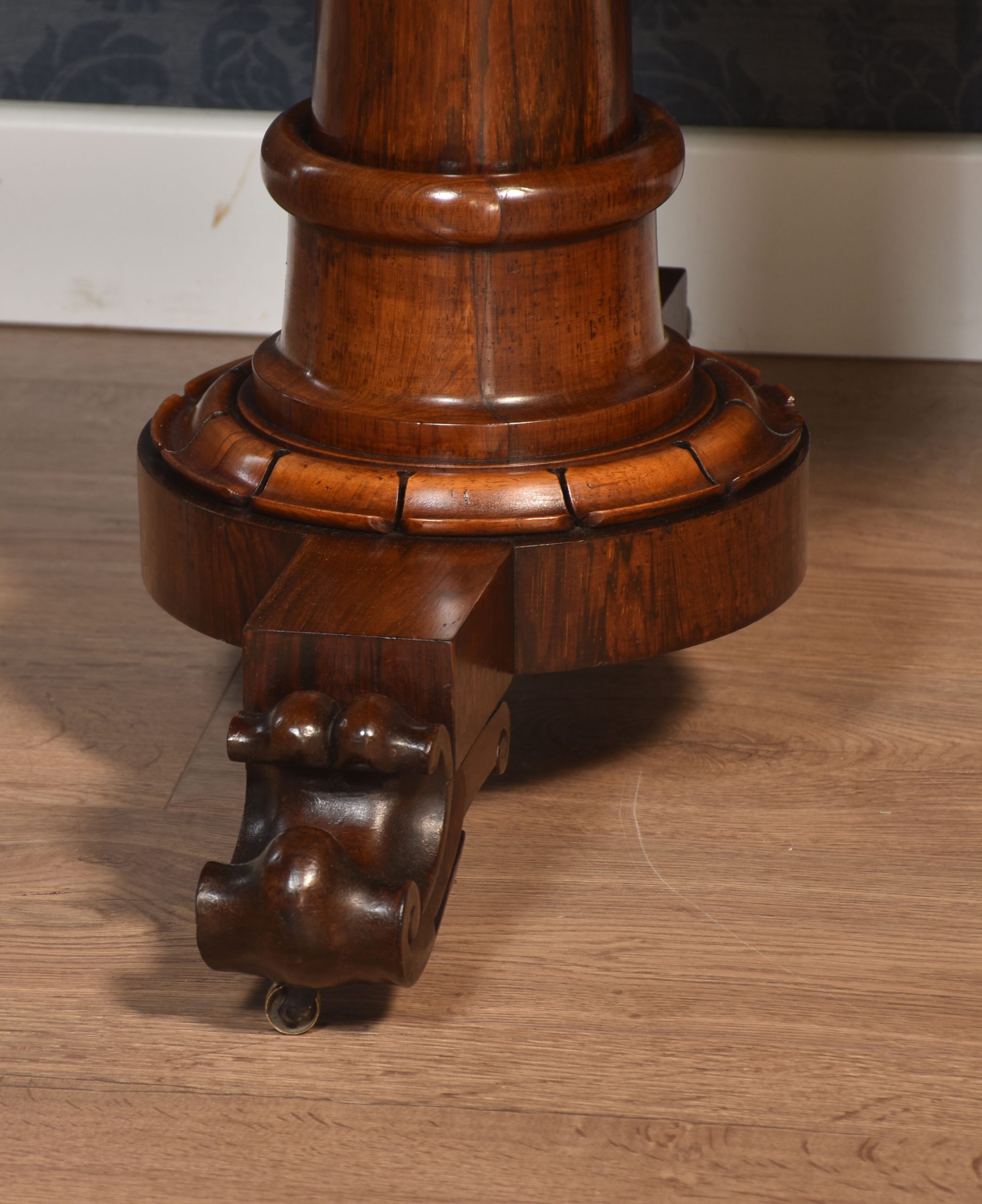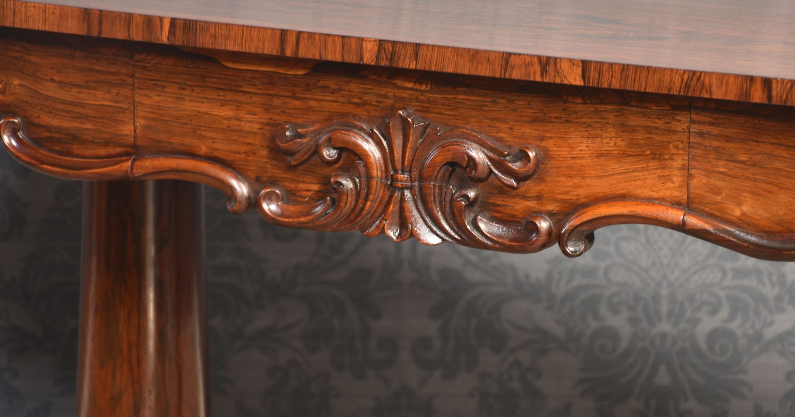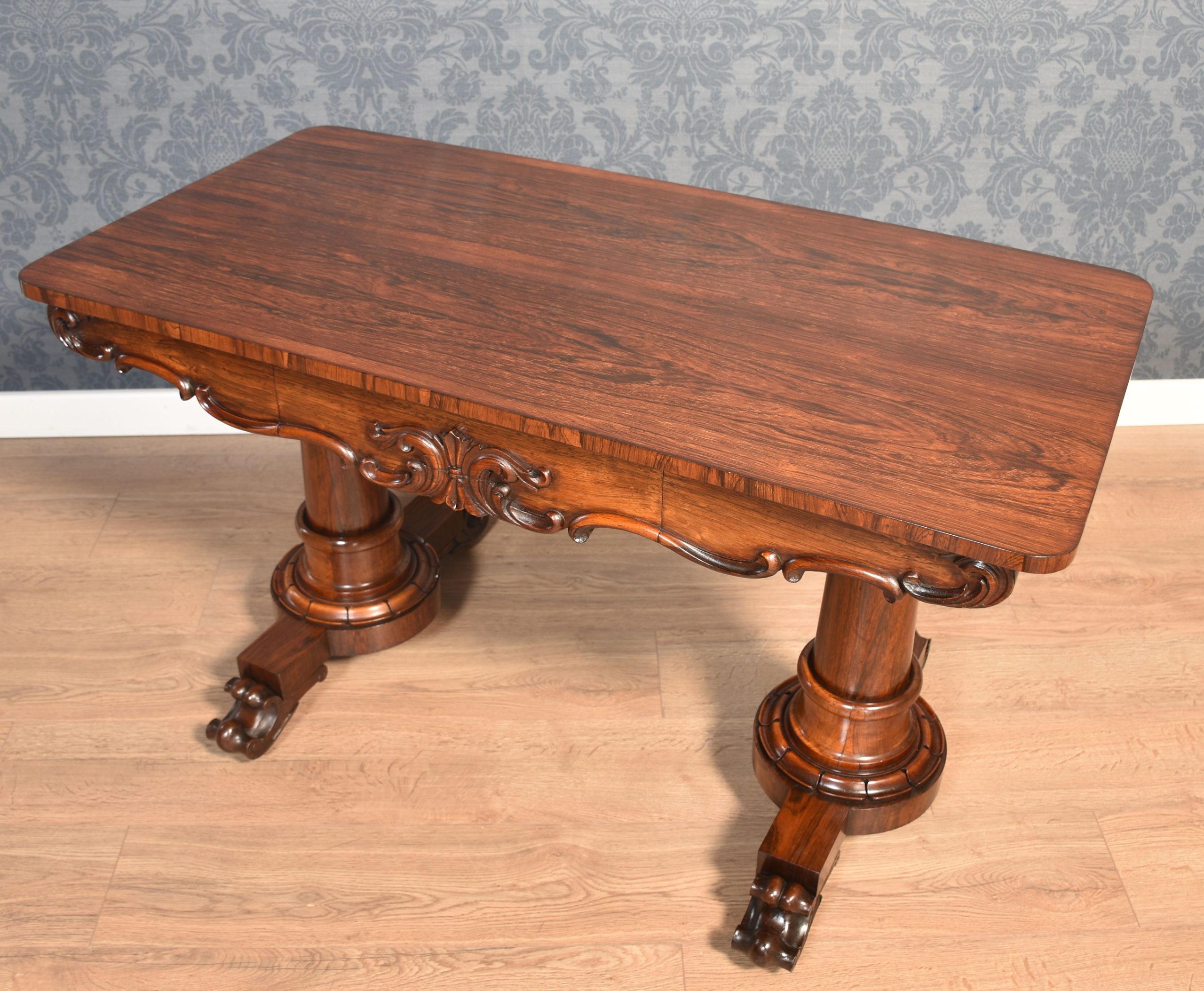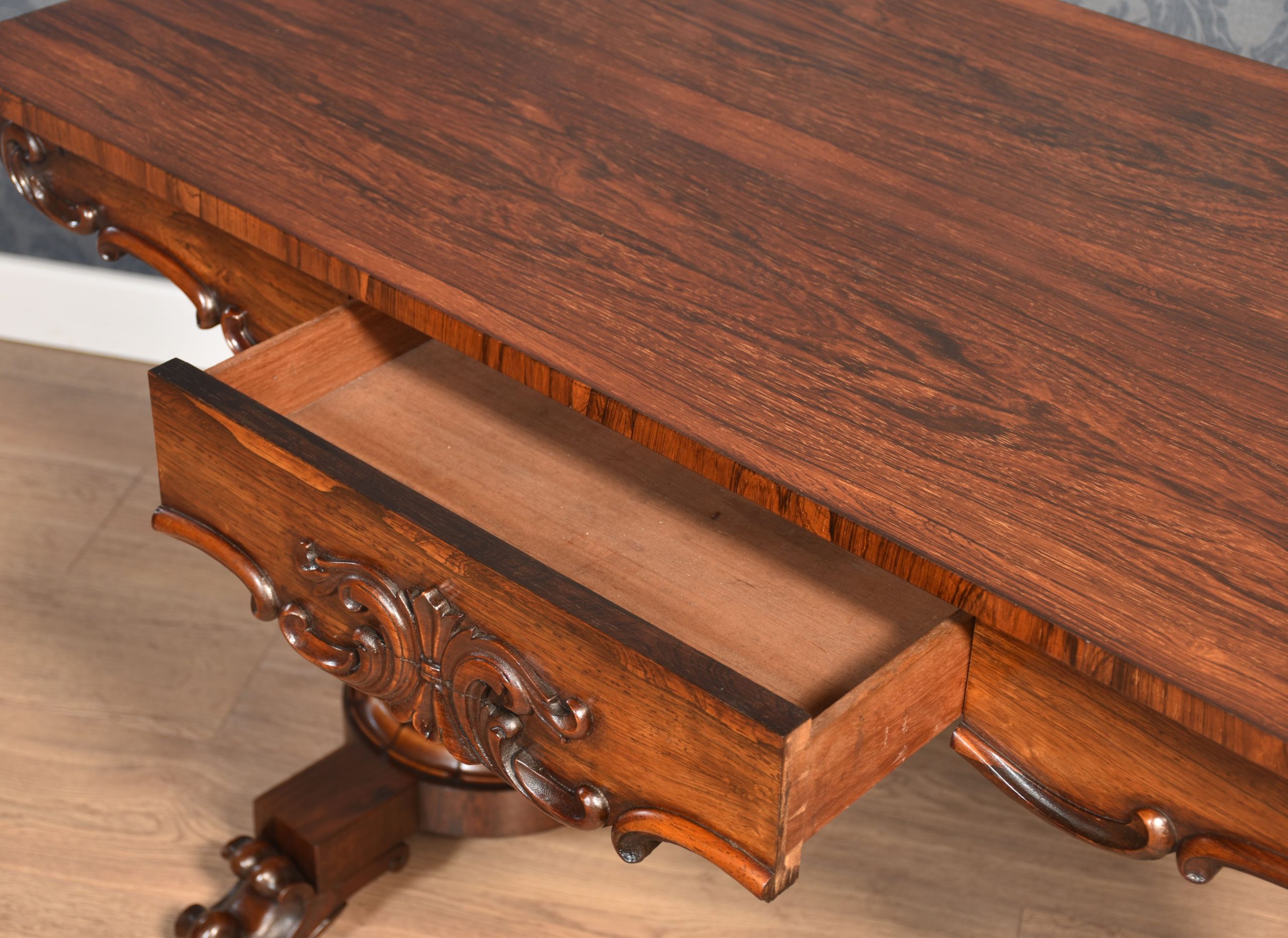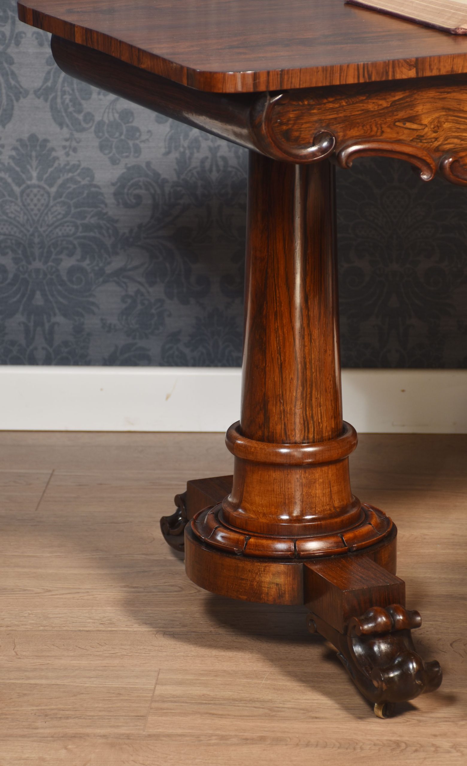 Rosewood library table, the rectangular top with rounded corners, above a frieze drawer, raised on tapering columns and trestle ends, terminating in scrolling toes with recessed castors.
