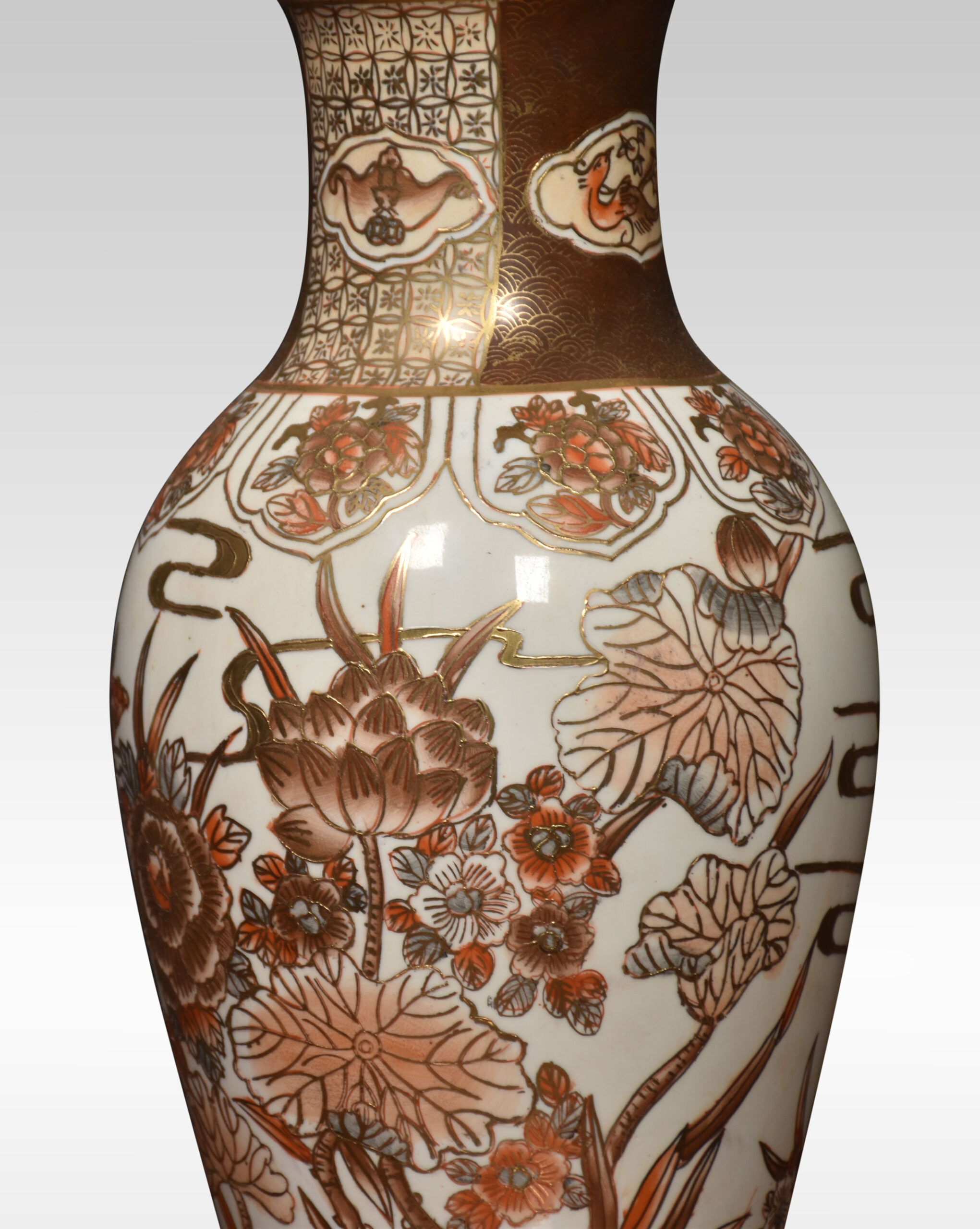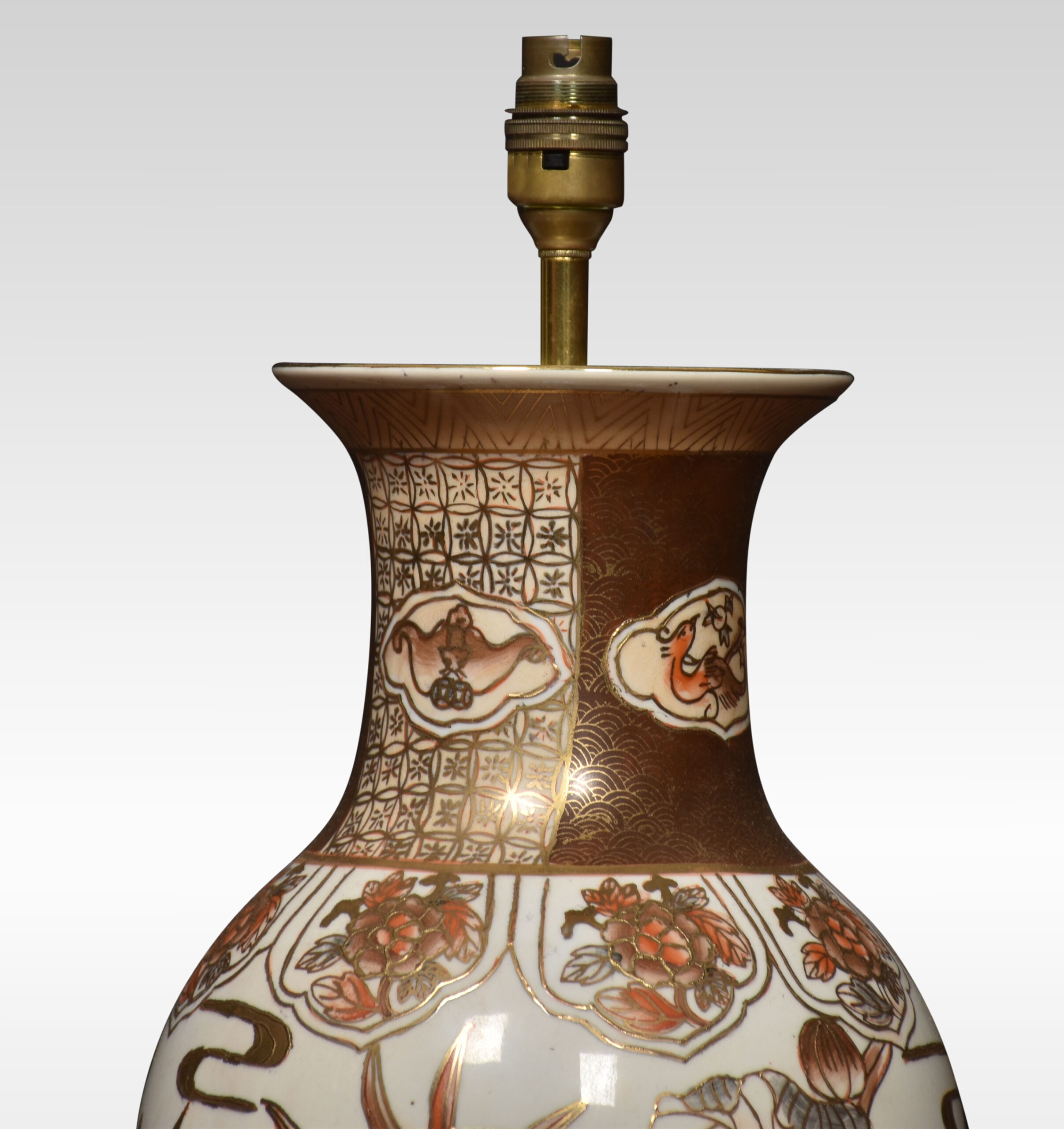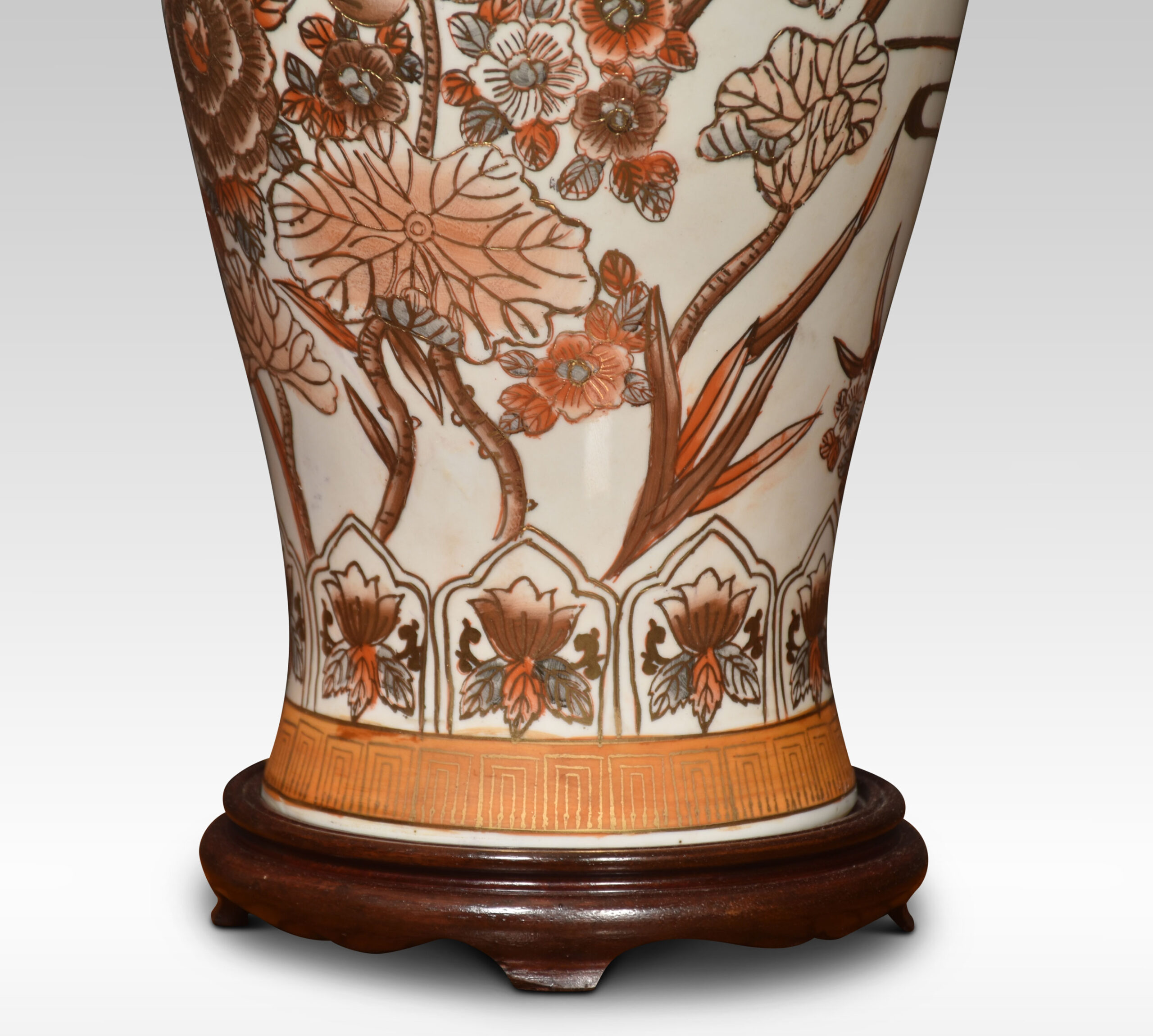 Japanese Satsuma porcelain vases lamp of baluster form raised up on stepped wooden base. The lampshade is not included.