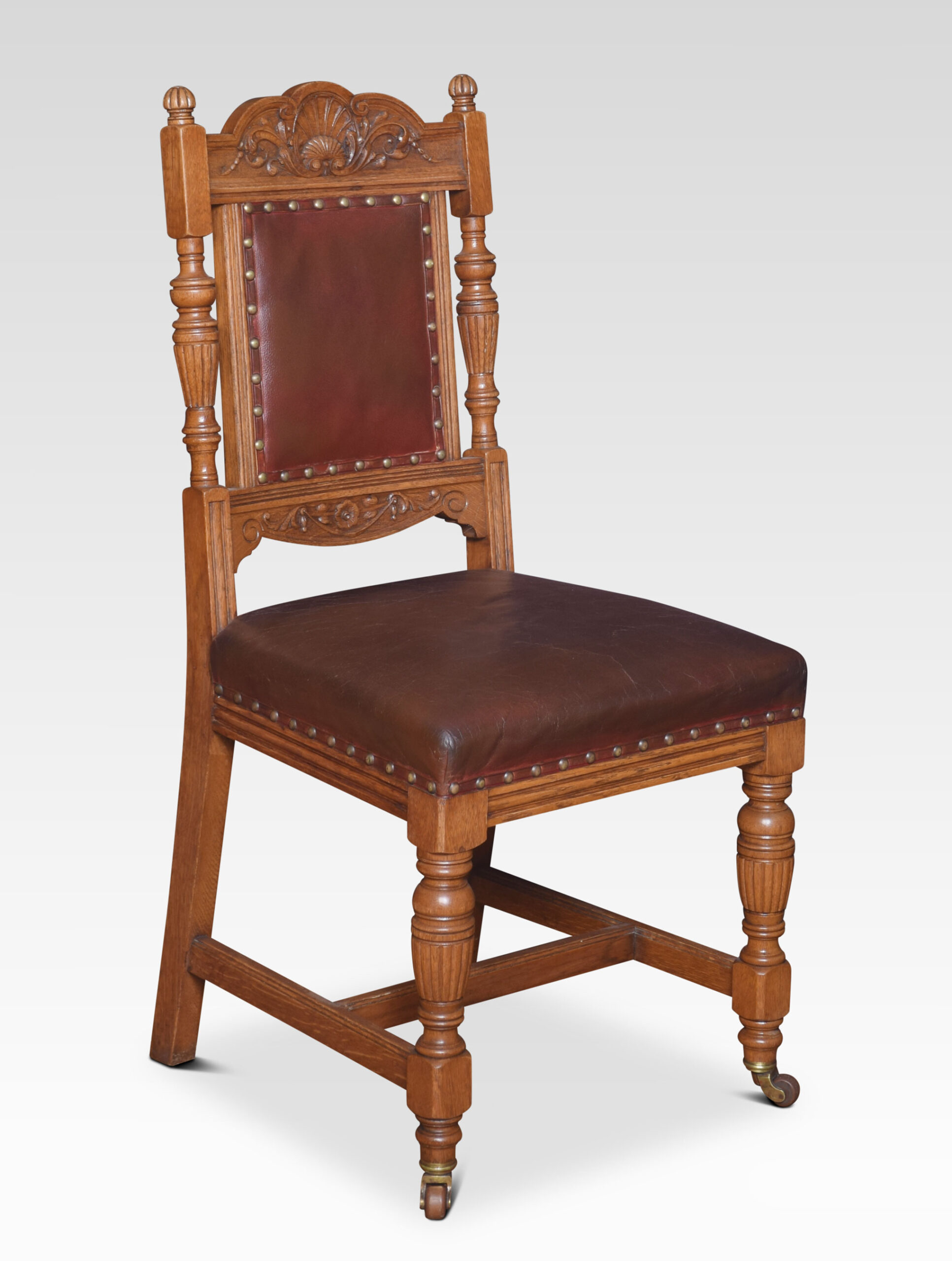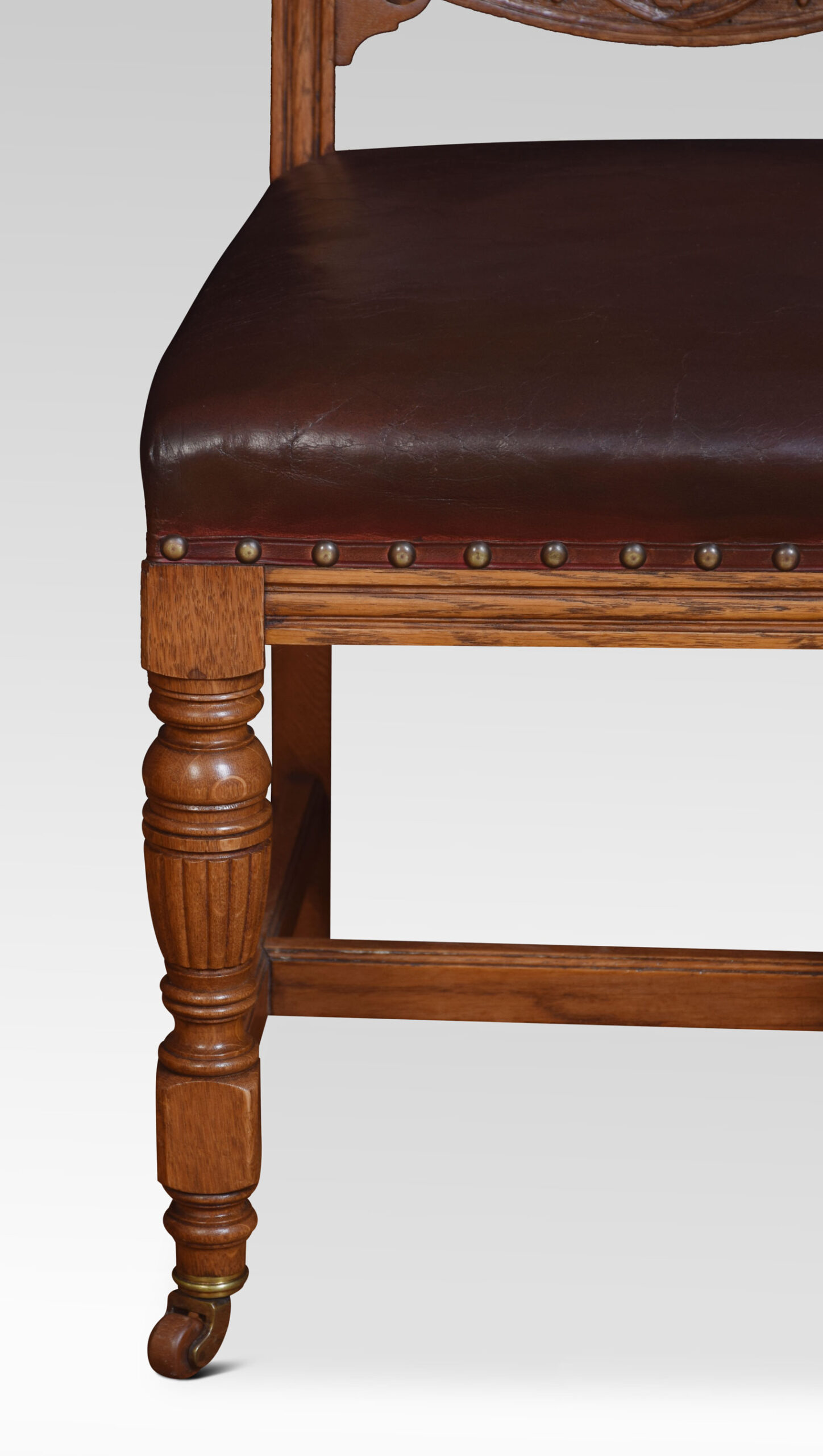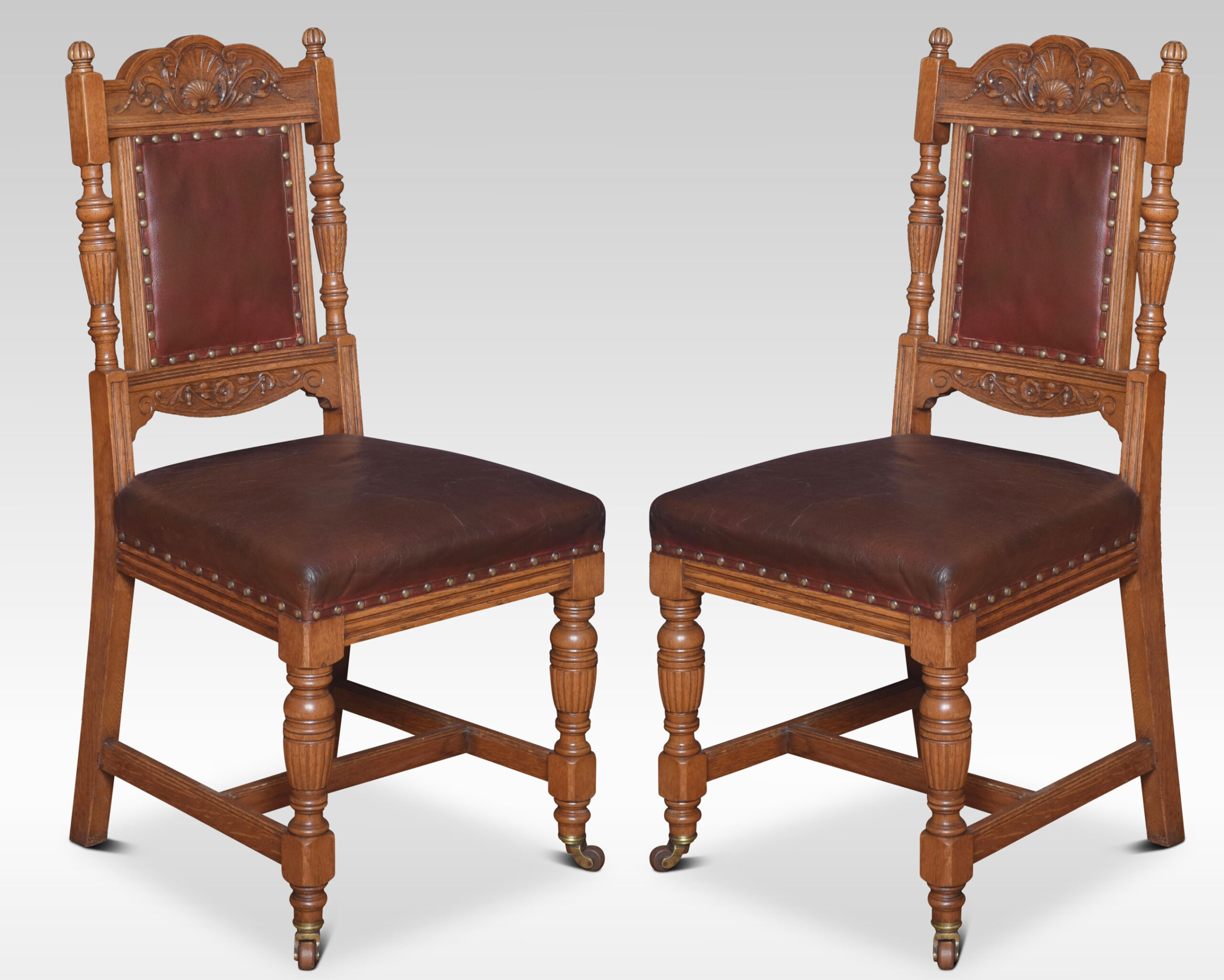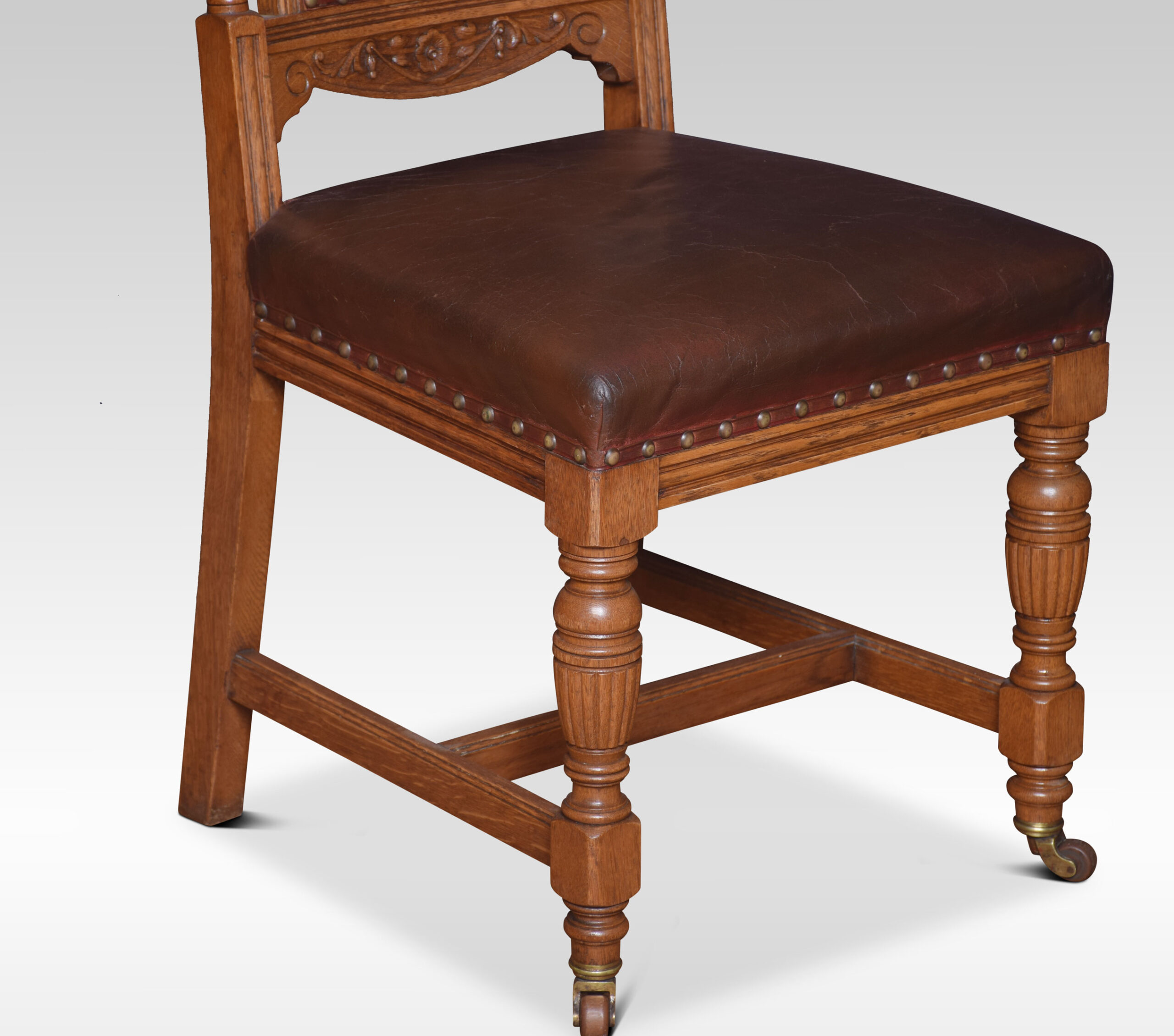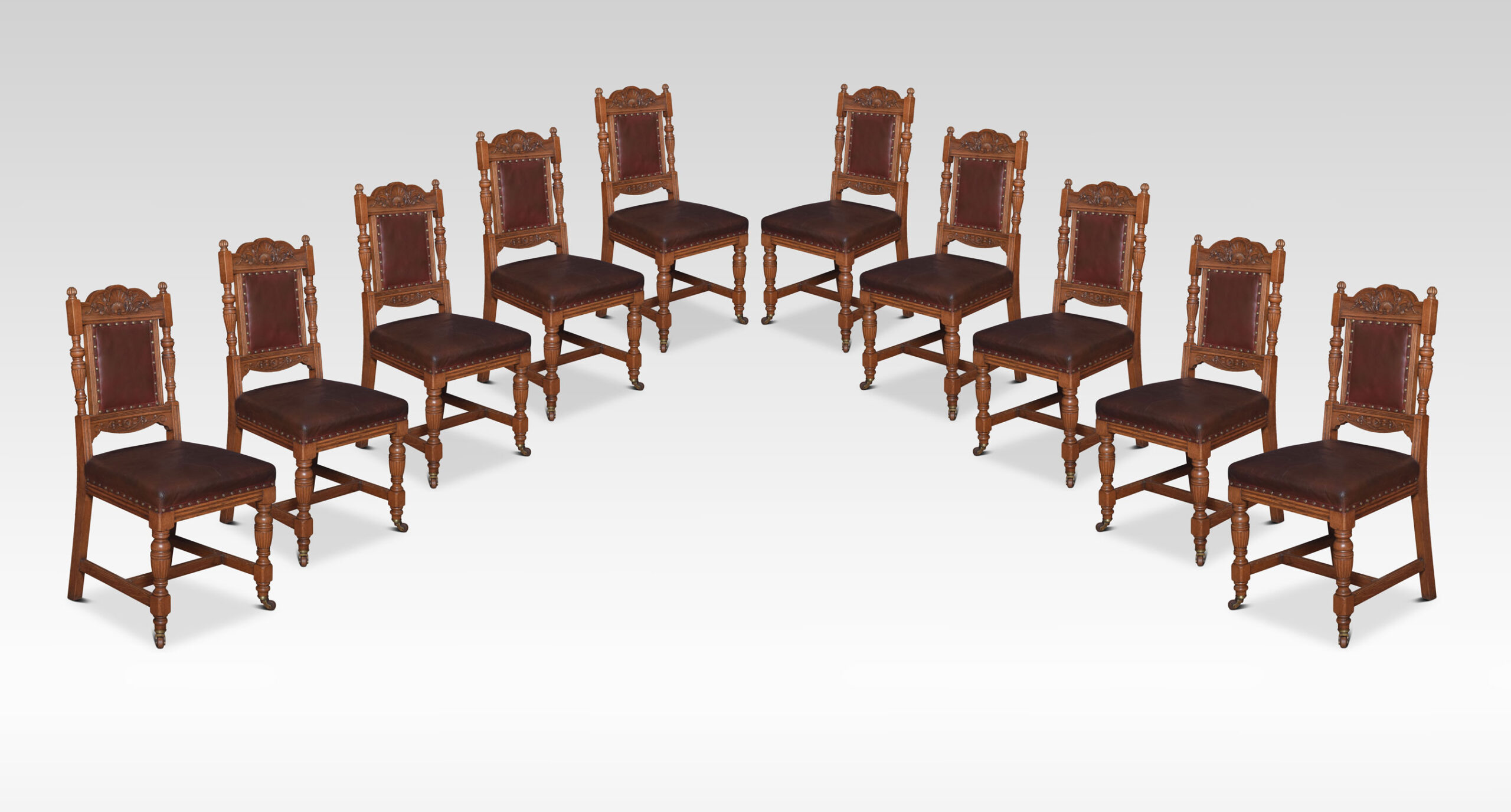 Set of ten oak dining chairs, each with scallop shell and leaf carved cresting rails, padded backs, and stuff over seats, each raised upon lobed fluted vase supports and casters joined by H stretcher.