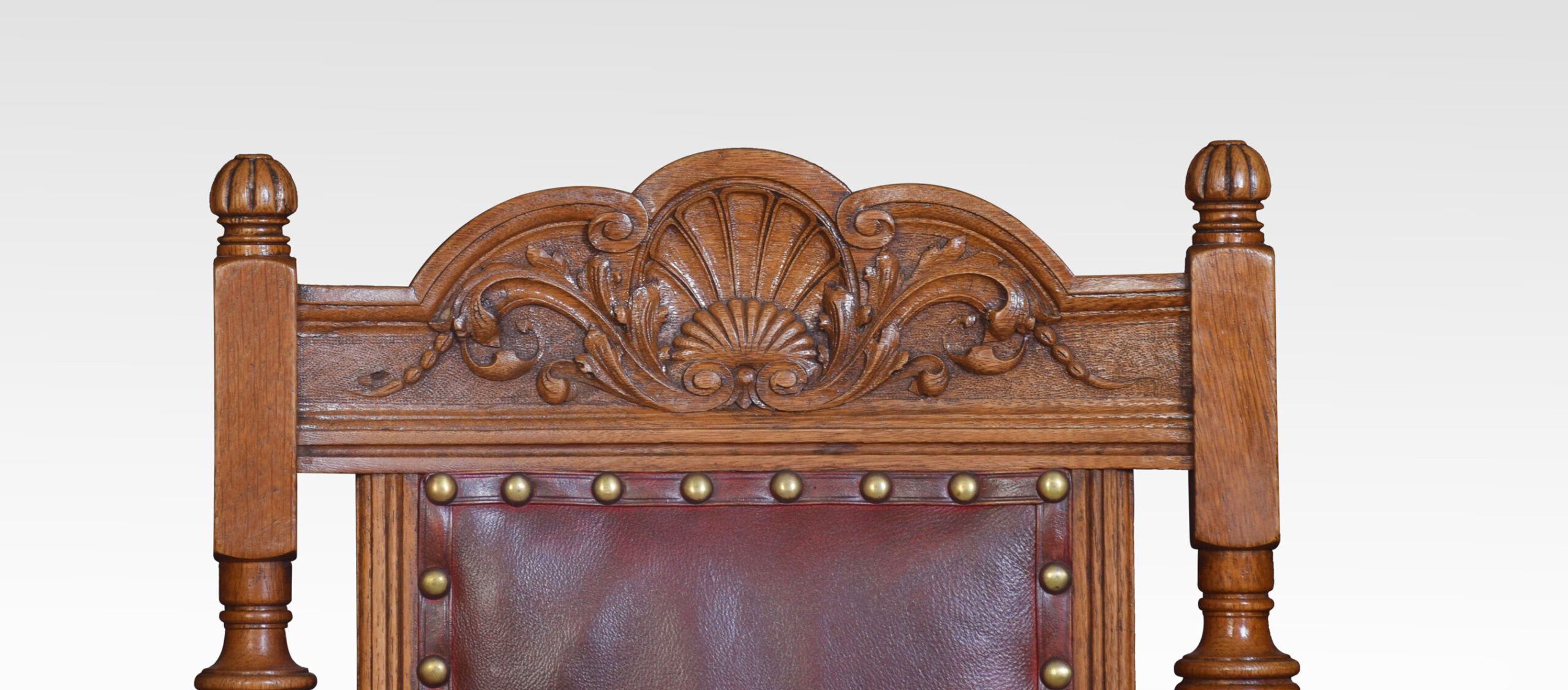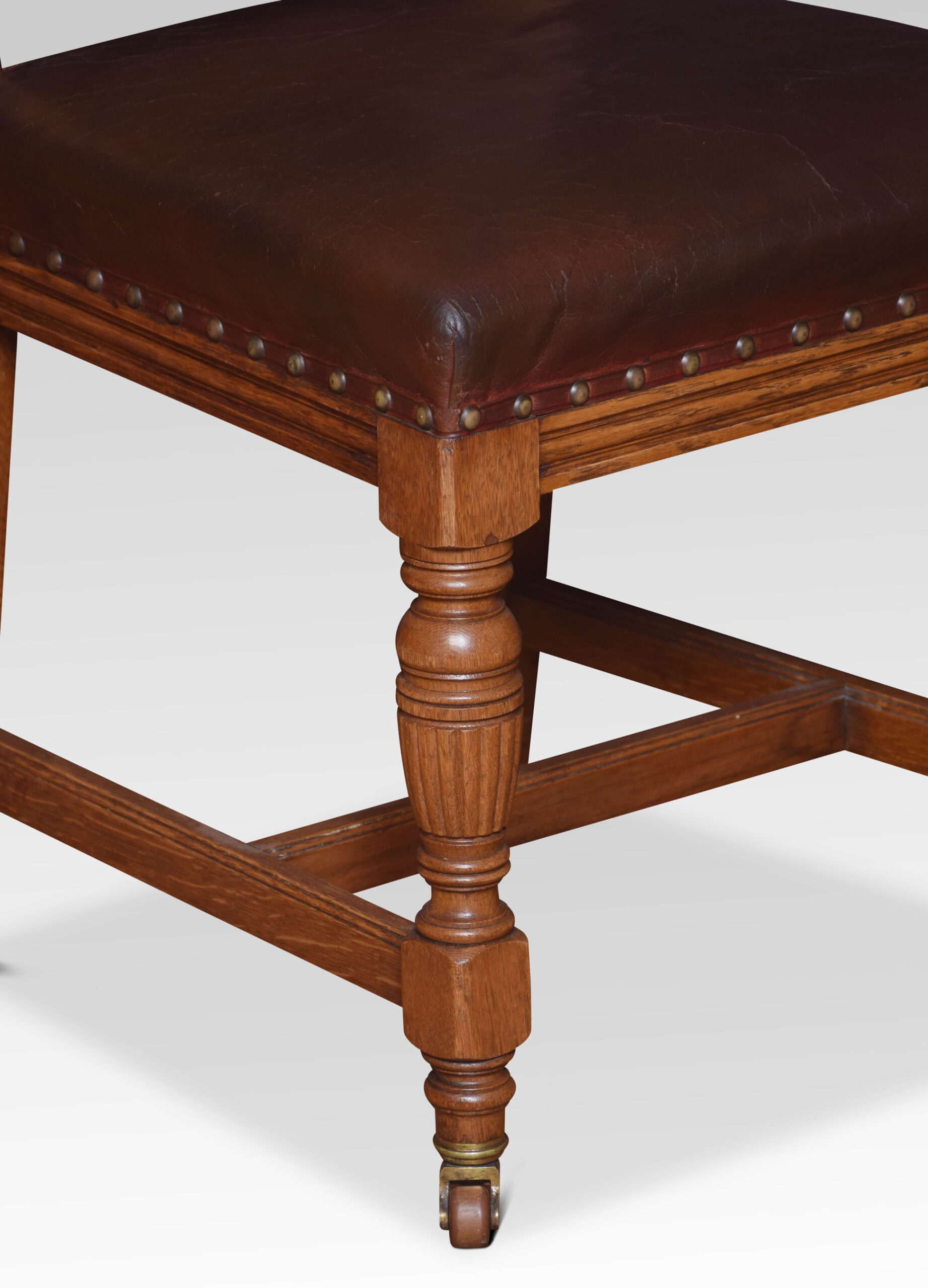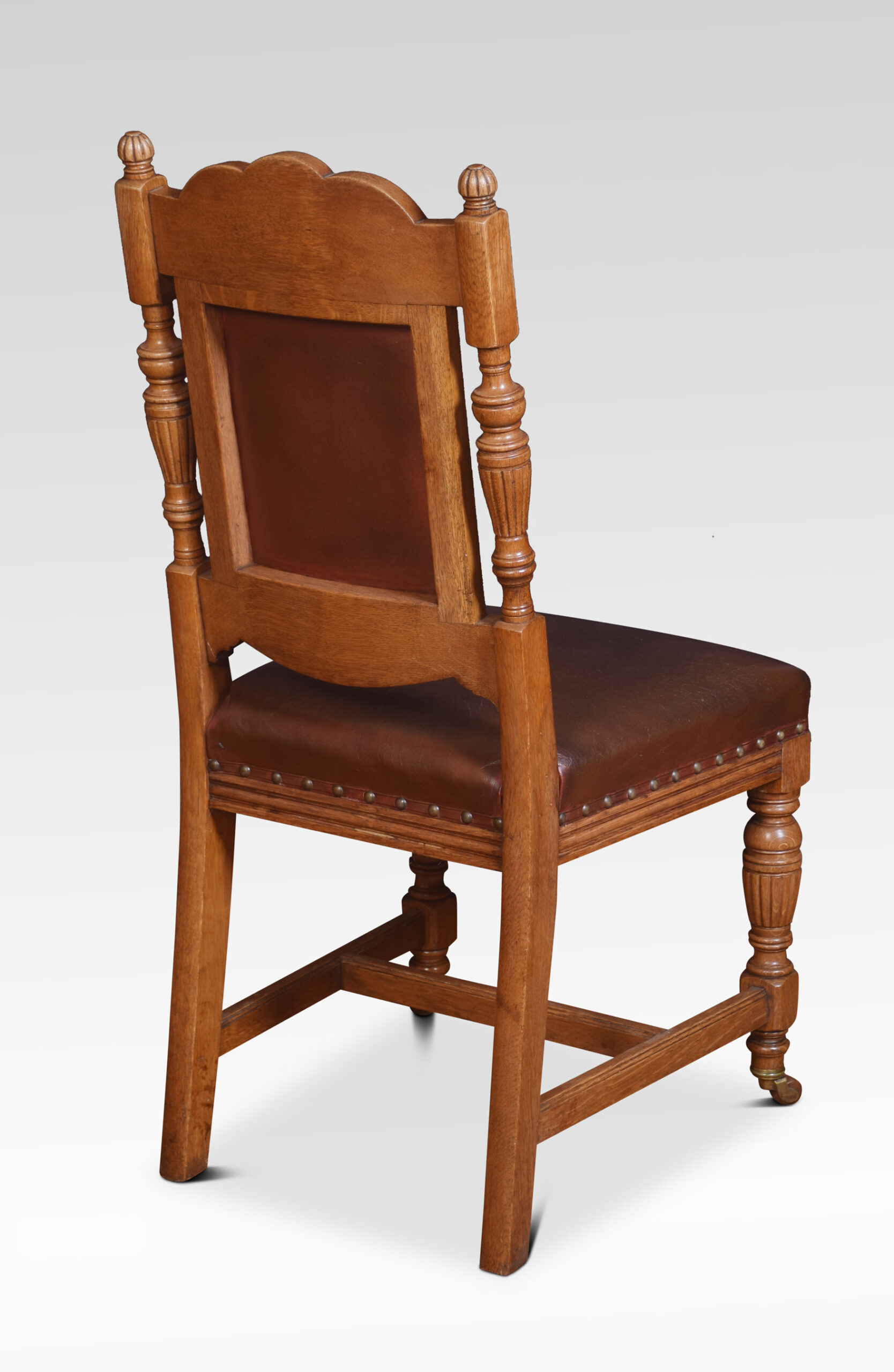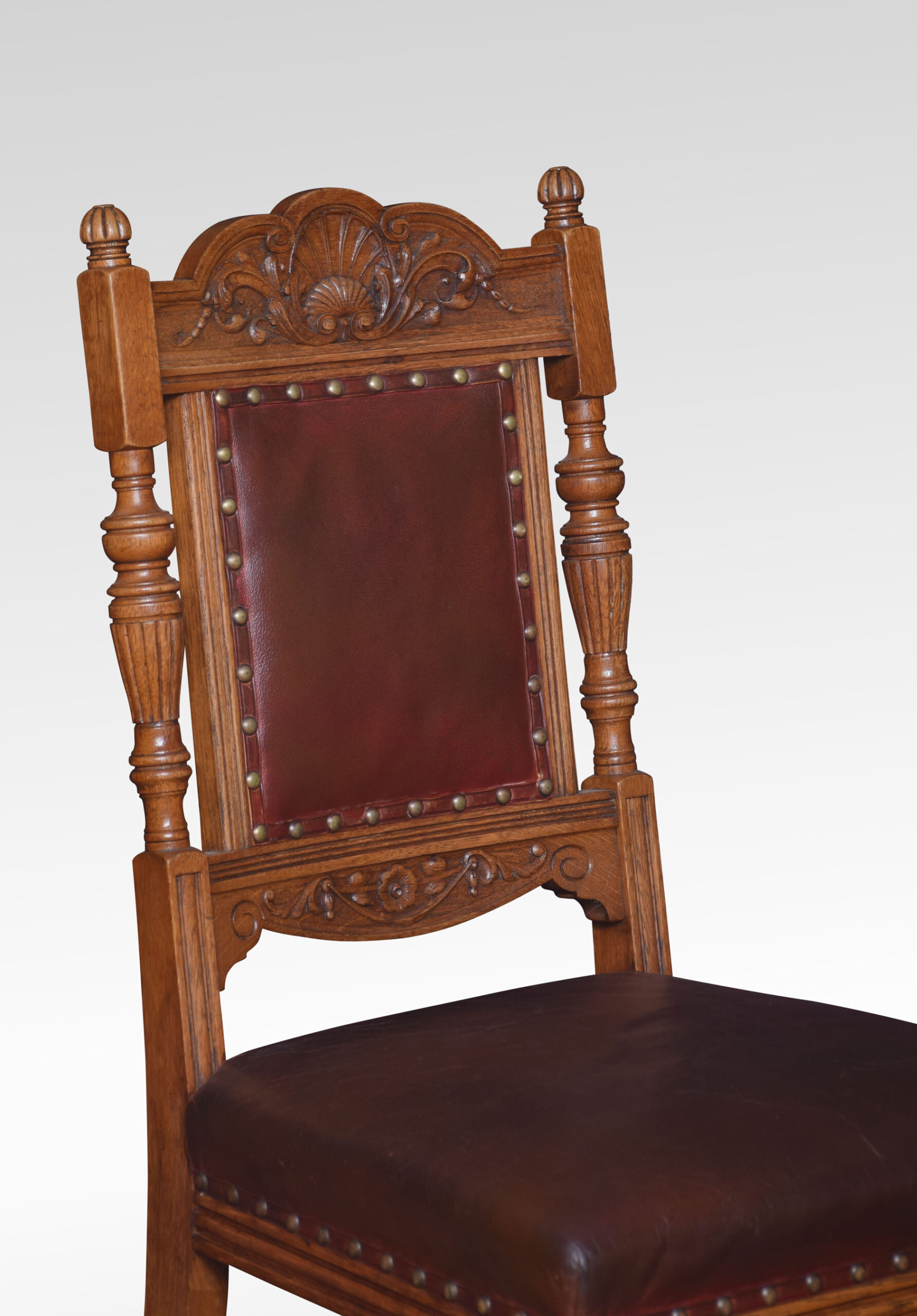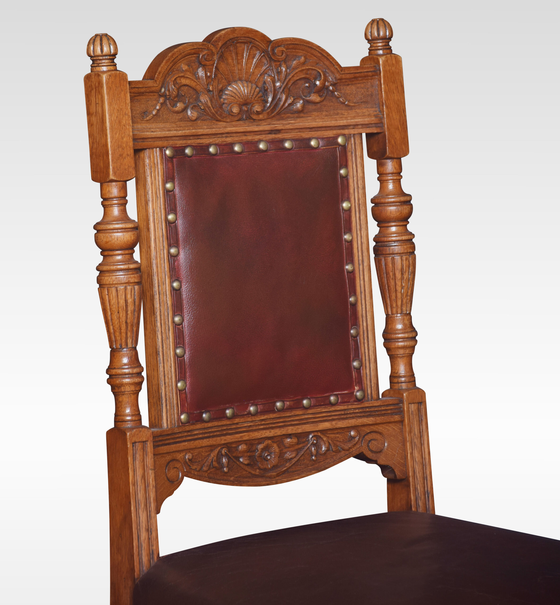Set of ten oak dining chairs, each with scallop shell and leaf carved cresting rails, padded backs, and stuff over seats, each raised upon lobed fluted vase supports and casters joined by H stretcher.