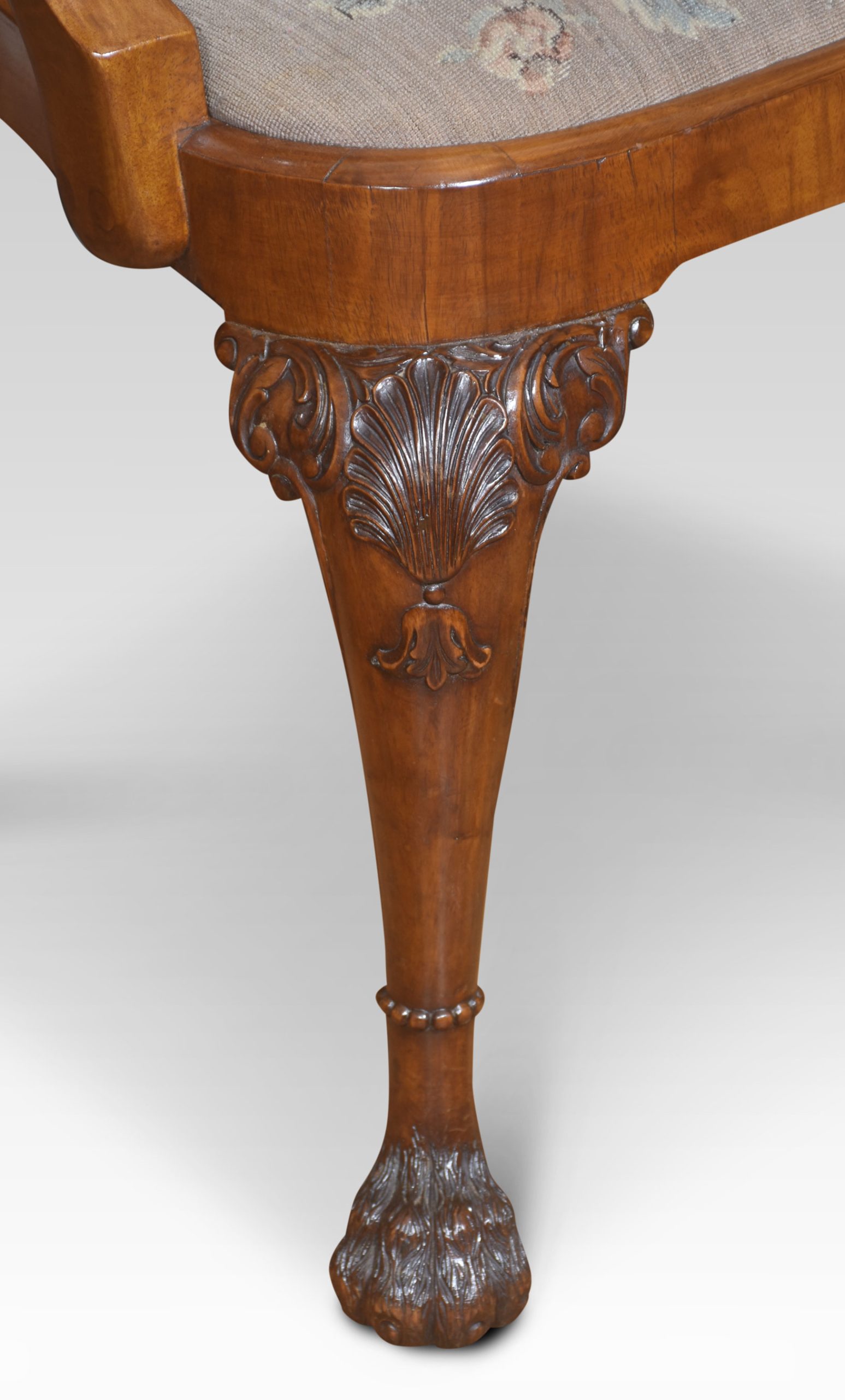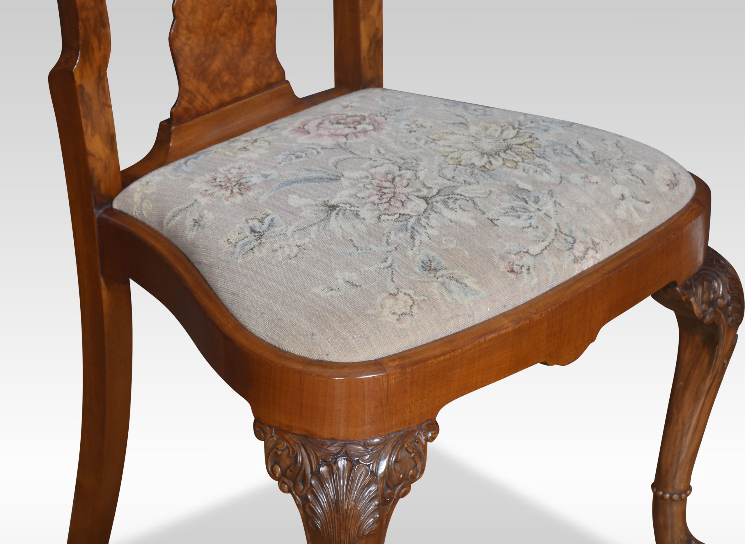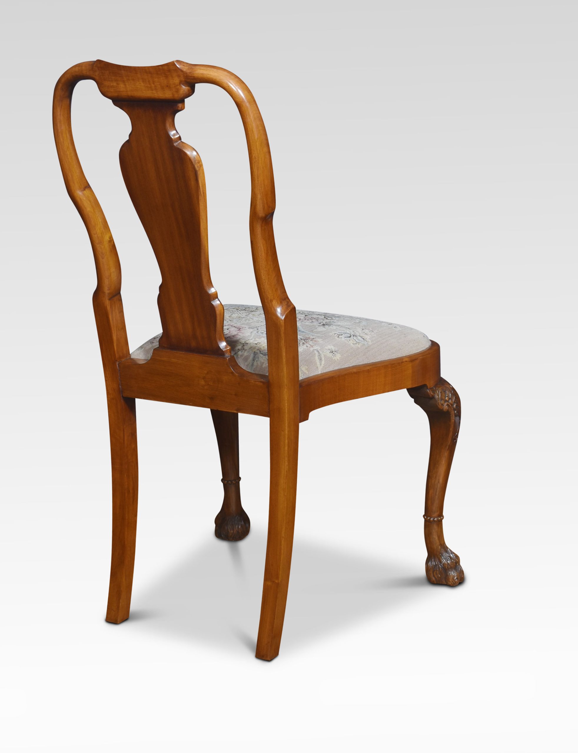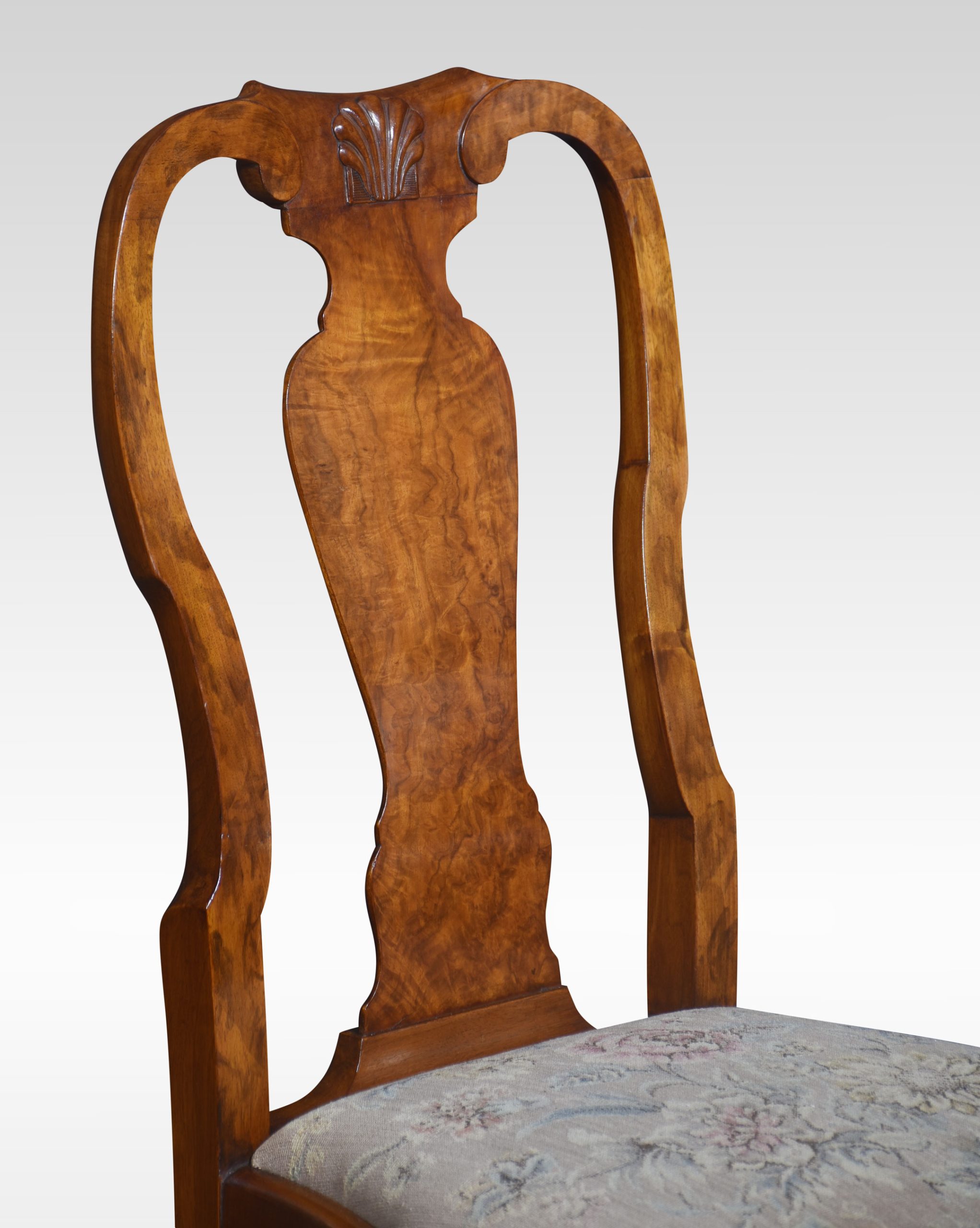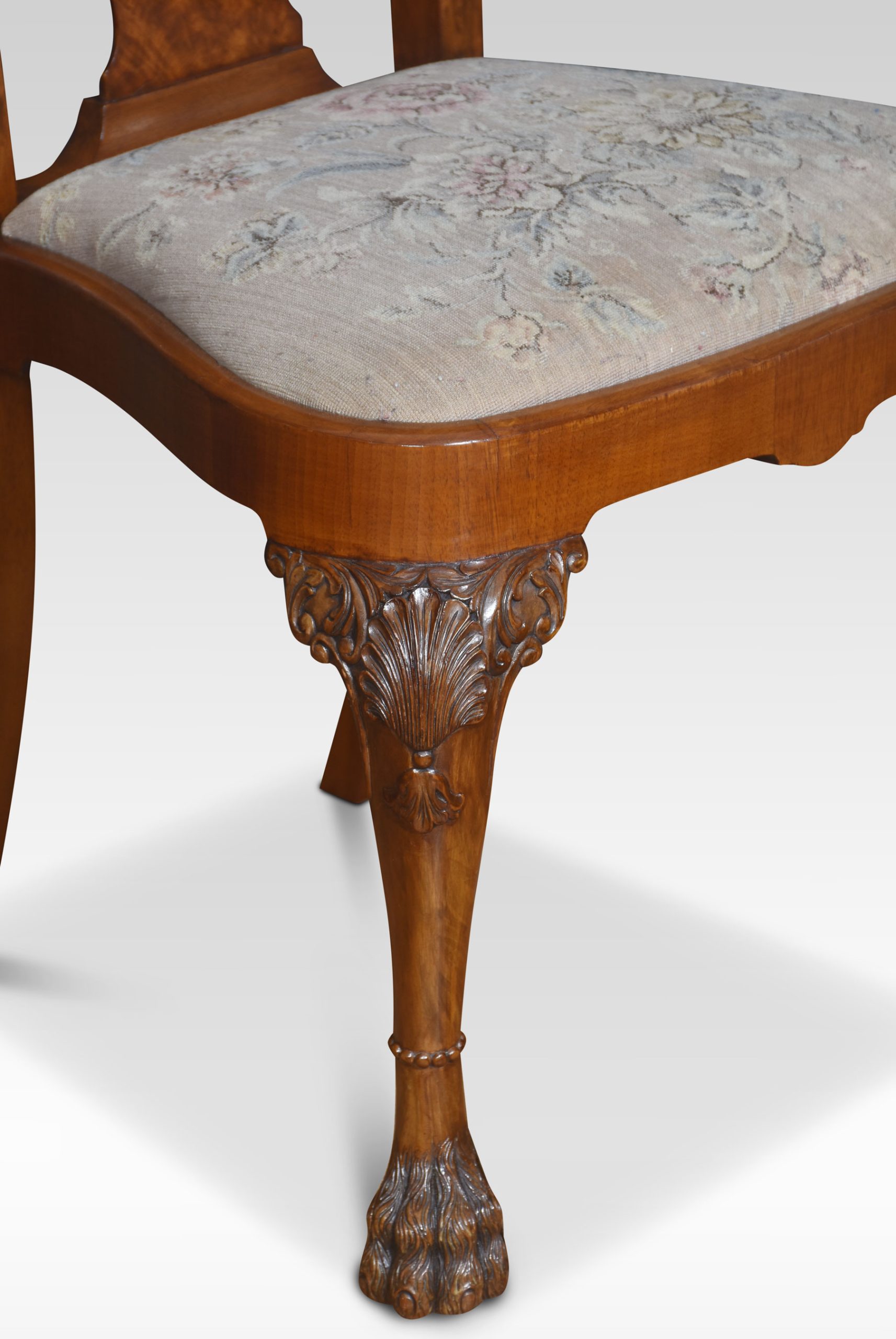 set of ten walnut dining chairs comprising of, two armchairs and eight chairs, each with shaped top rails above a vase-shaped vertical splat, with a drop-in seat above scallop-shell headed cabriole front legs terminating in hairy paw feet.