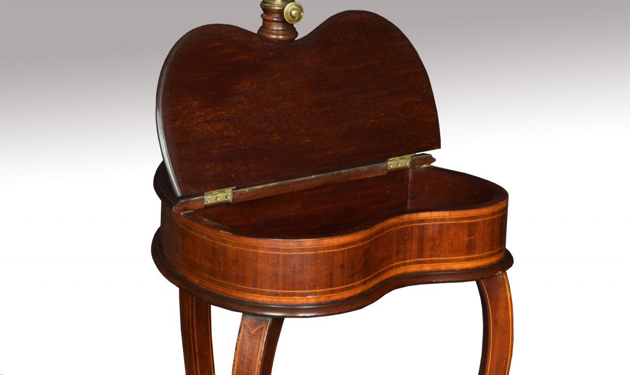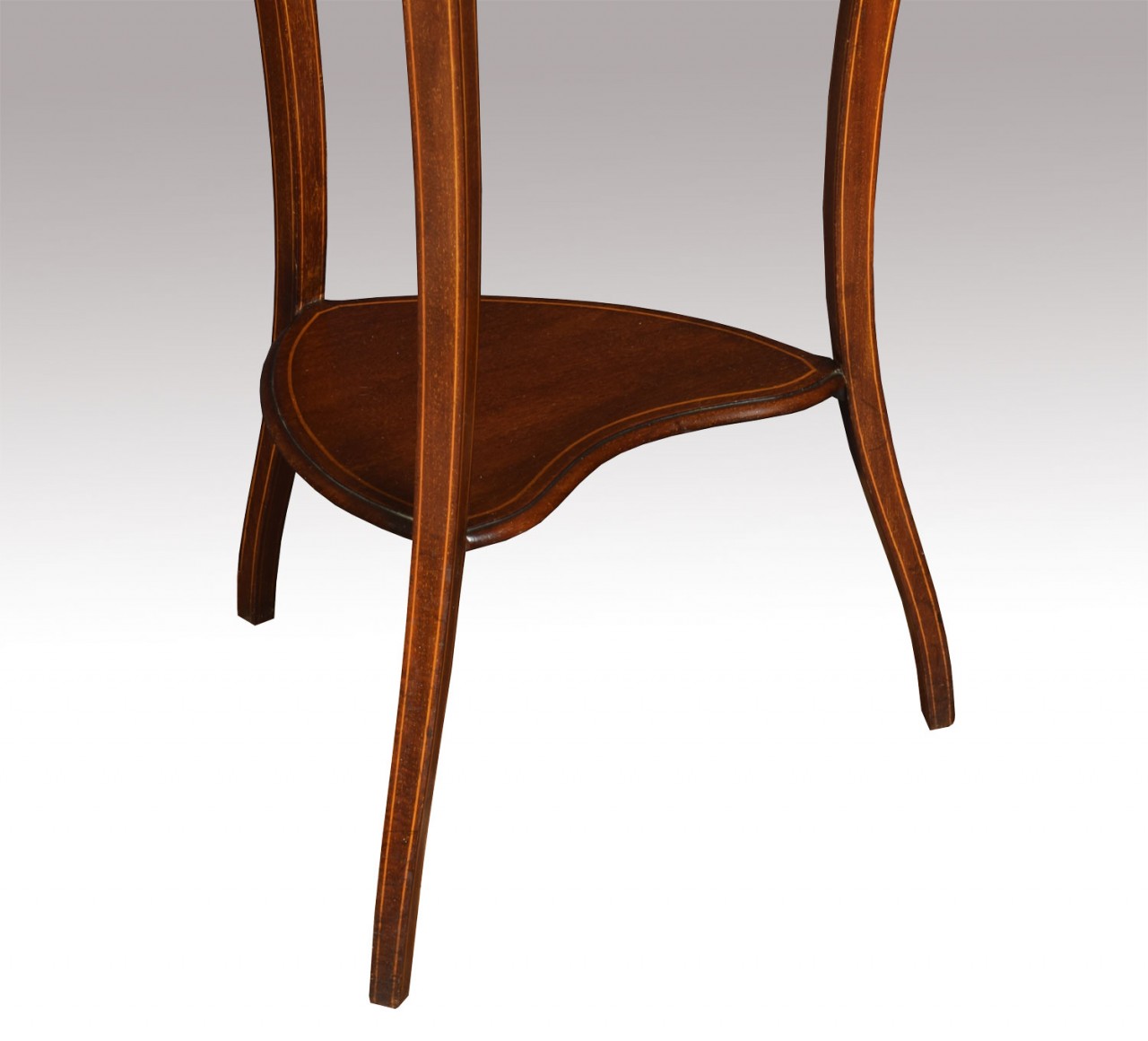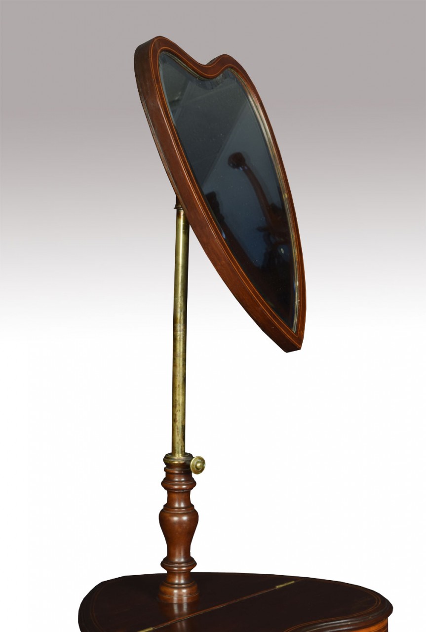 Sheraton revival mahogany shaving stand, the shield shaped bevelled mirror on brass adjustable pole, above shaped string inlaid section with lidded compartment all raised up on turned stem with three slender cabriole legs united by under tier