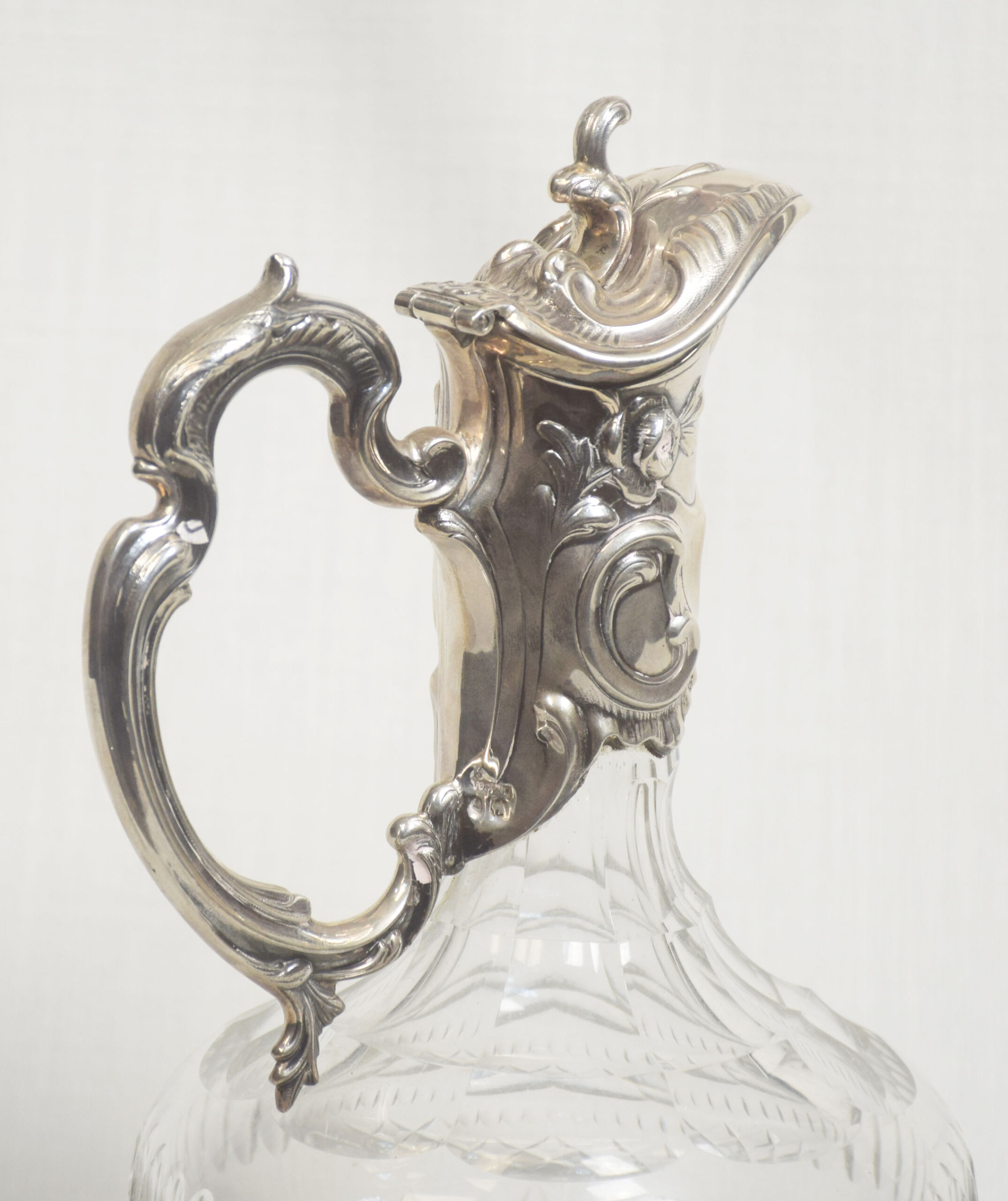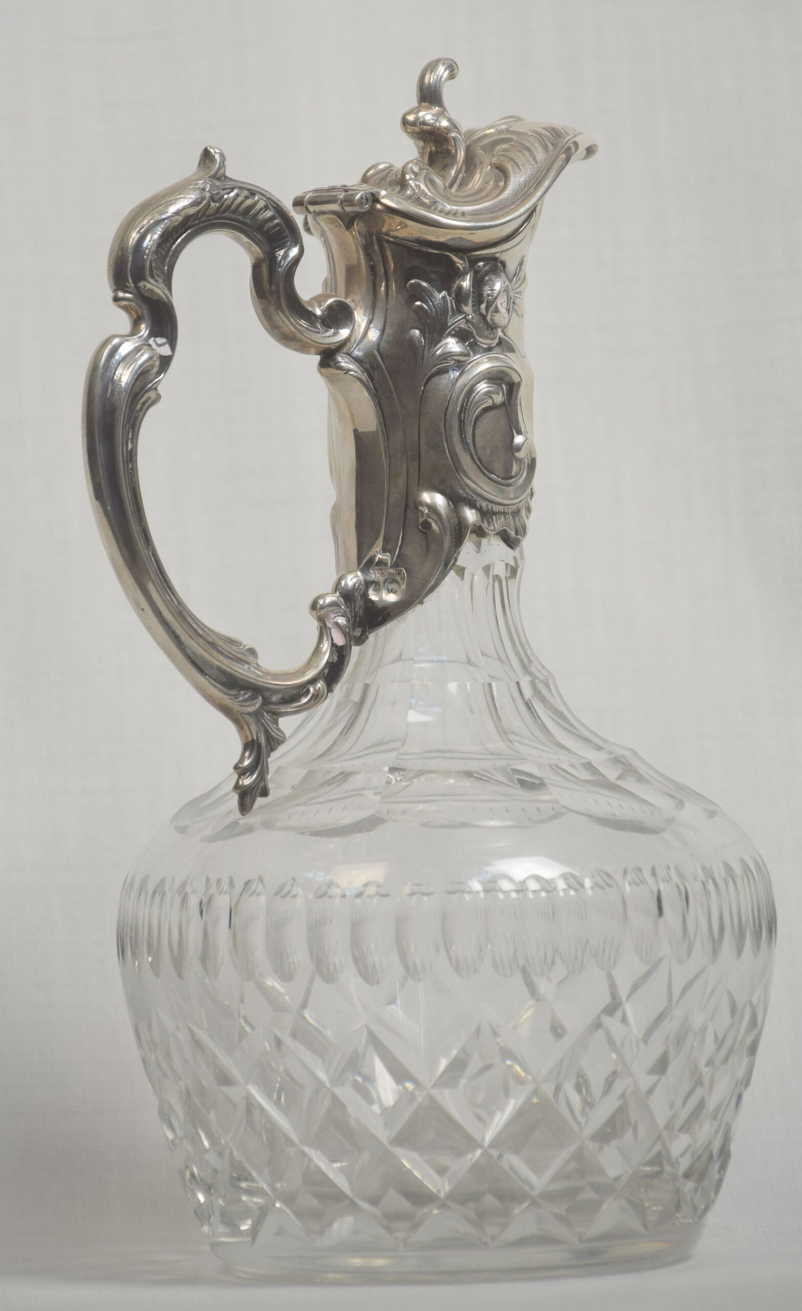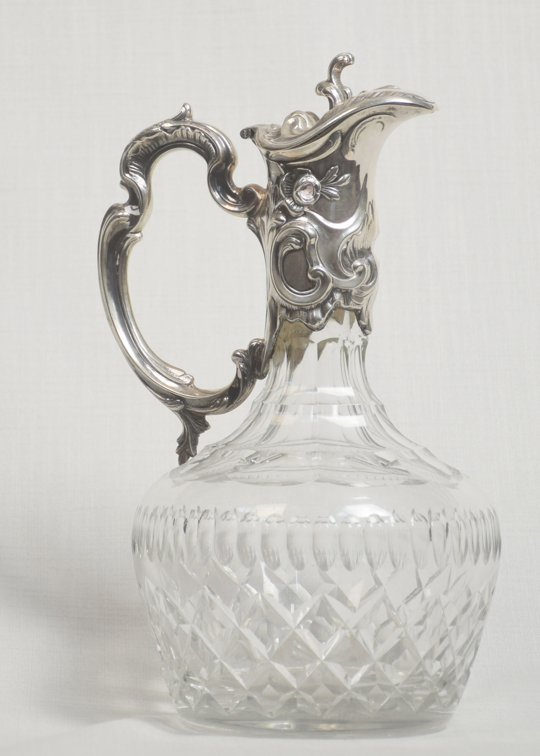 Sivered Ewer/ Claret jug, embossed with rococo type foliage over a faceted baluster glass bowl.