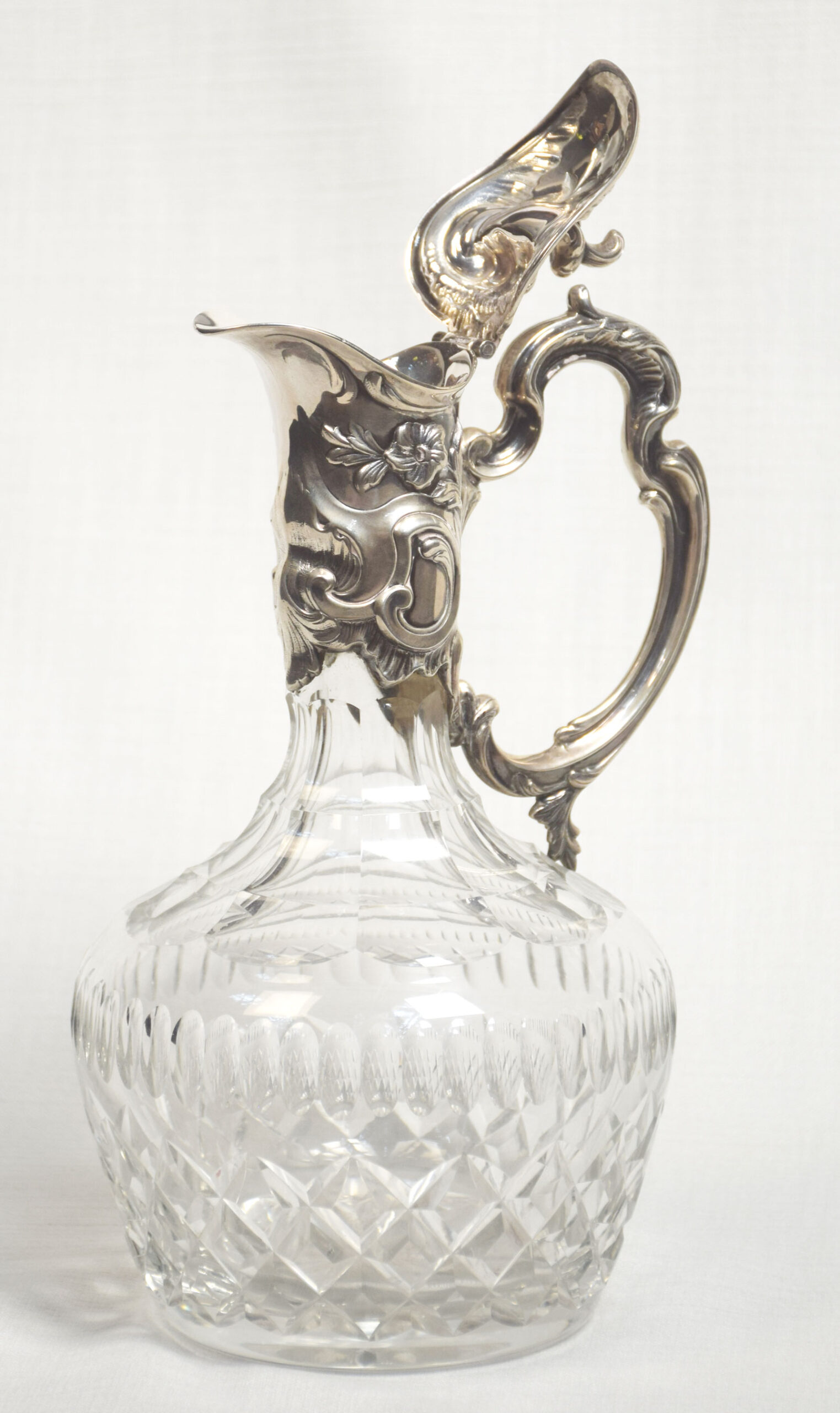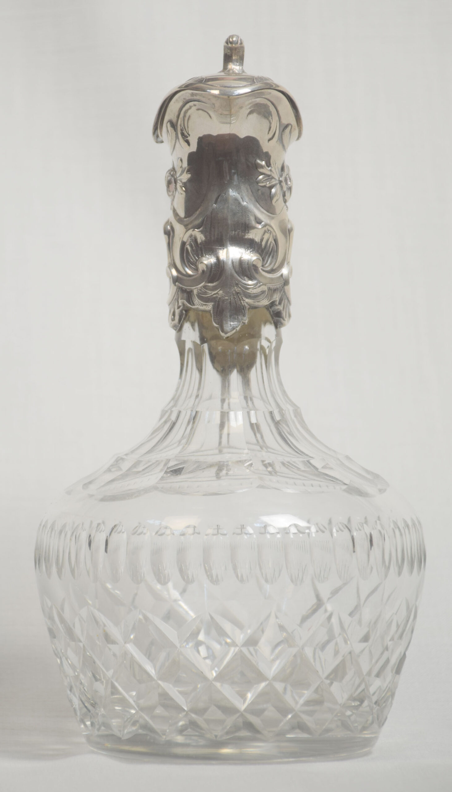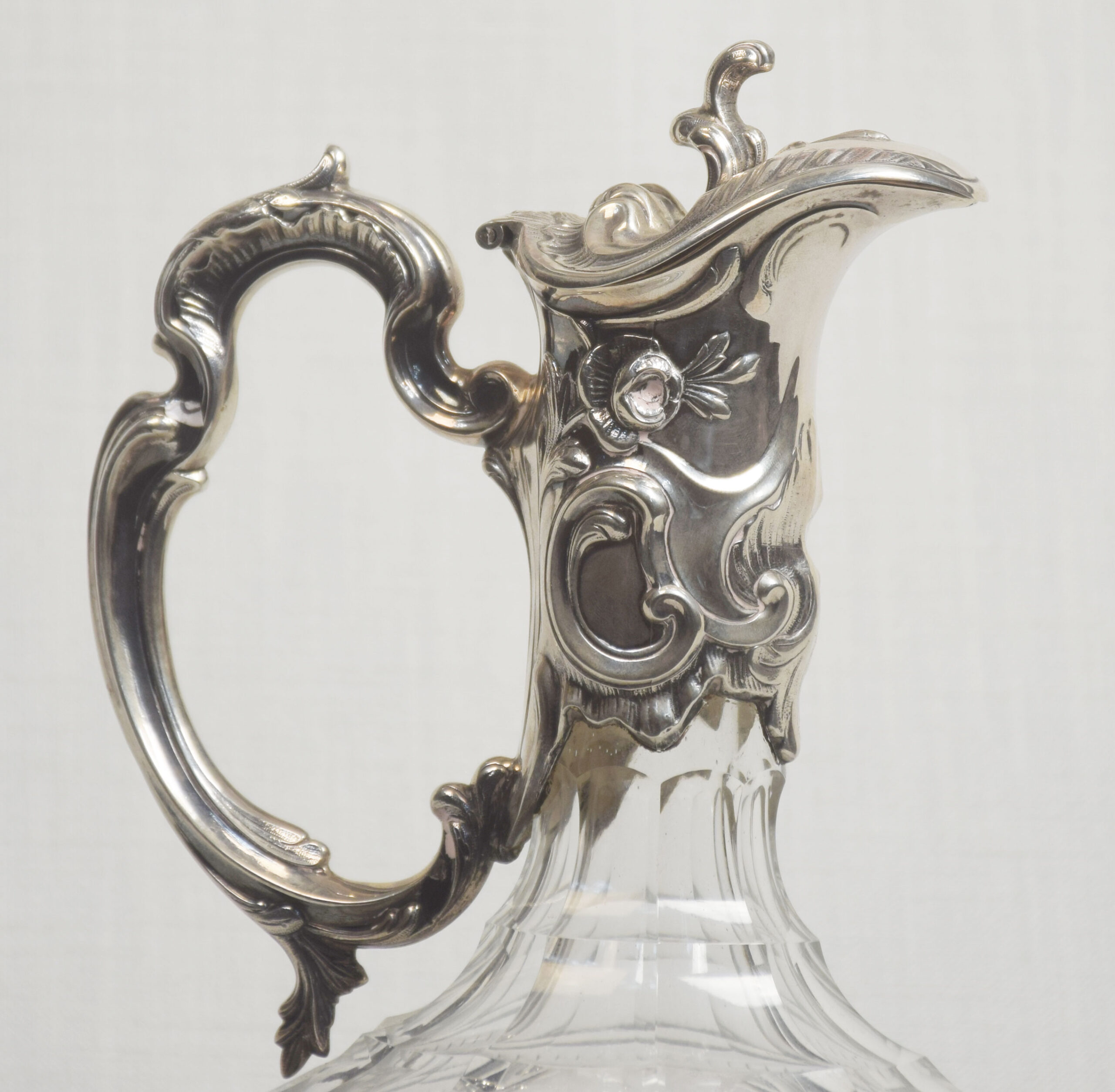 Sivered Ewer/ Claret jug, embossed with rococo type foliage over a faceted baluster glass bowl.