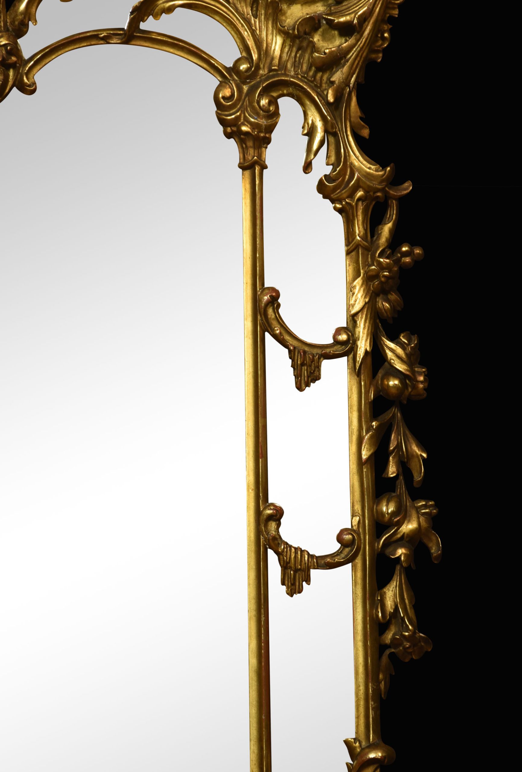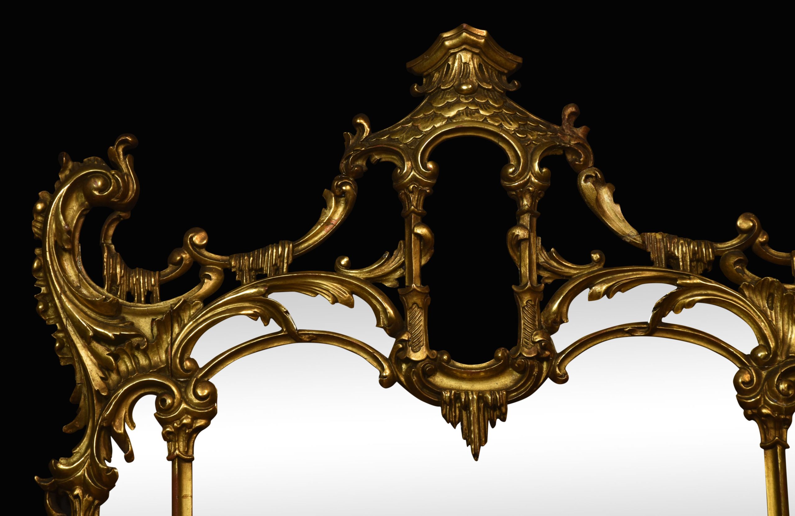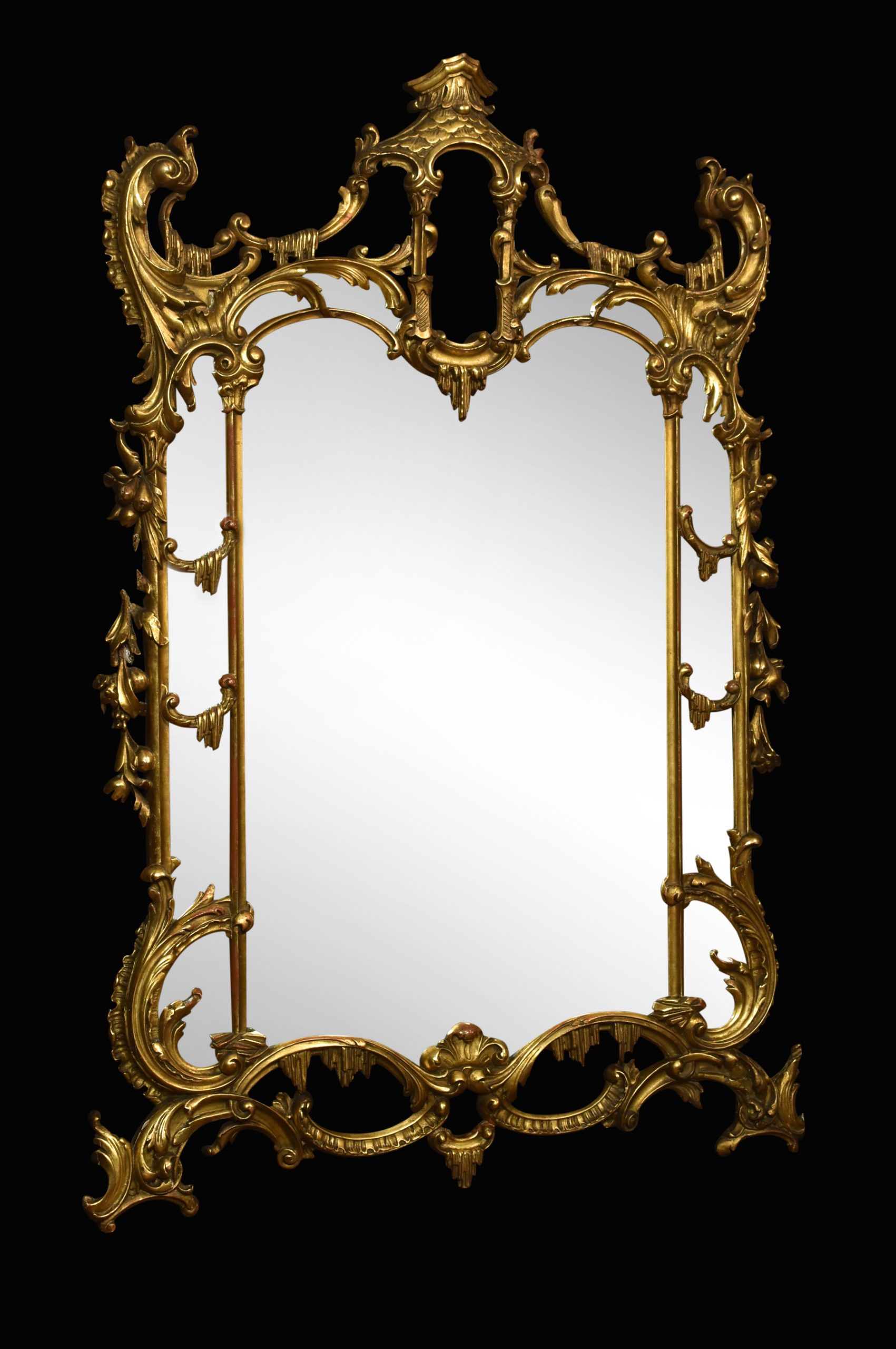 Chippendale style gilt wall mirror. The original arched plate is surrounded by a pagoda top above a gilt-wood C scroll acanthus and floral frame.