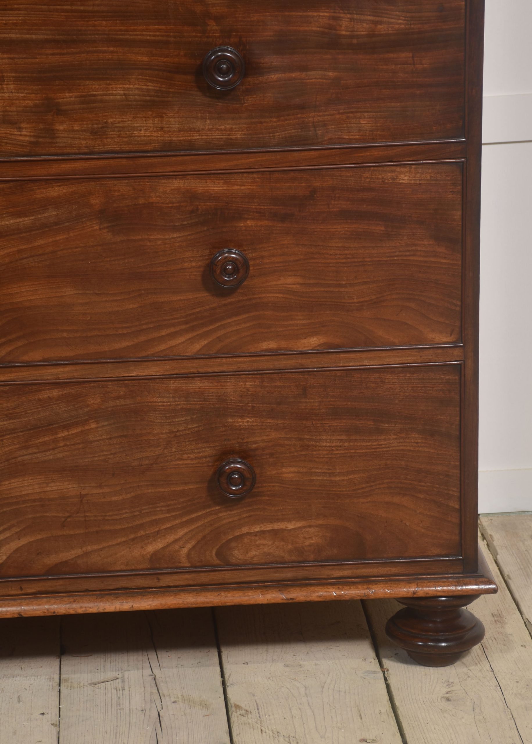 Tall mahogany chest of drawers, the rectangular top above two short and five long mahogany lined graduated drawers, all with turned mahogany knob handles. Raised up on bun feet.