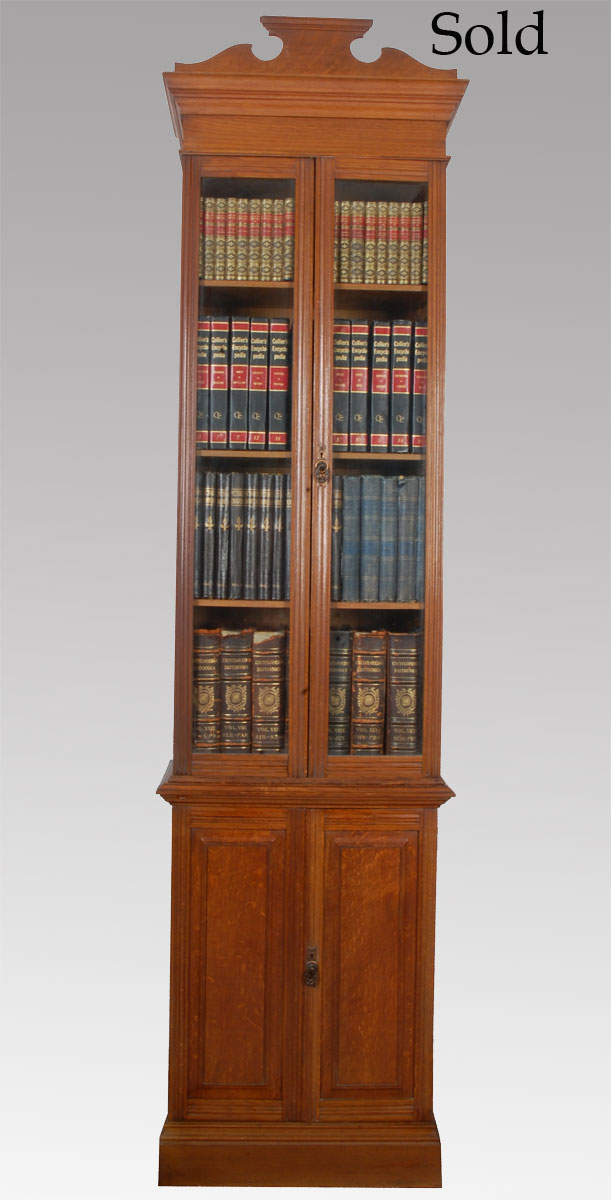A tall oak two door bookcase having shaped cornice above two tall narrow glazed doors opening to reveal five adjustable shelves, to the cupboard base having two oak panned doors opening to reveal single fixed shelf raised up on plinth base.