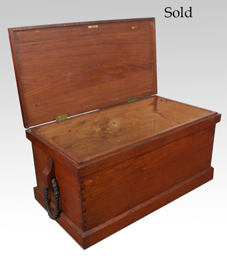A teak seaman’s chest the hinged lid opening to reveal large storage area, haing original brass lock with rope side carrying handles