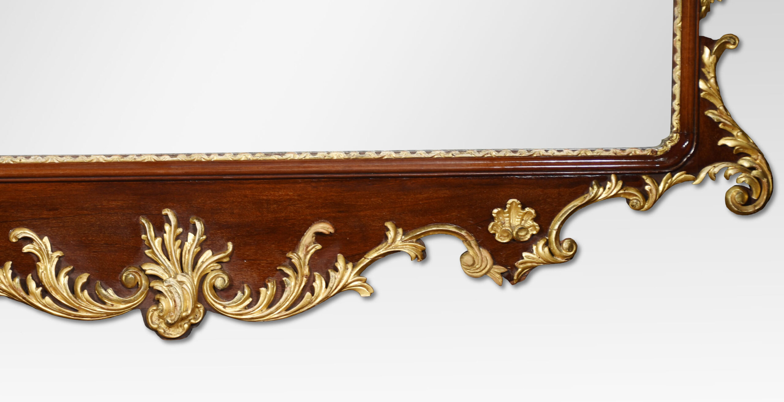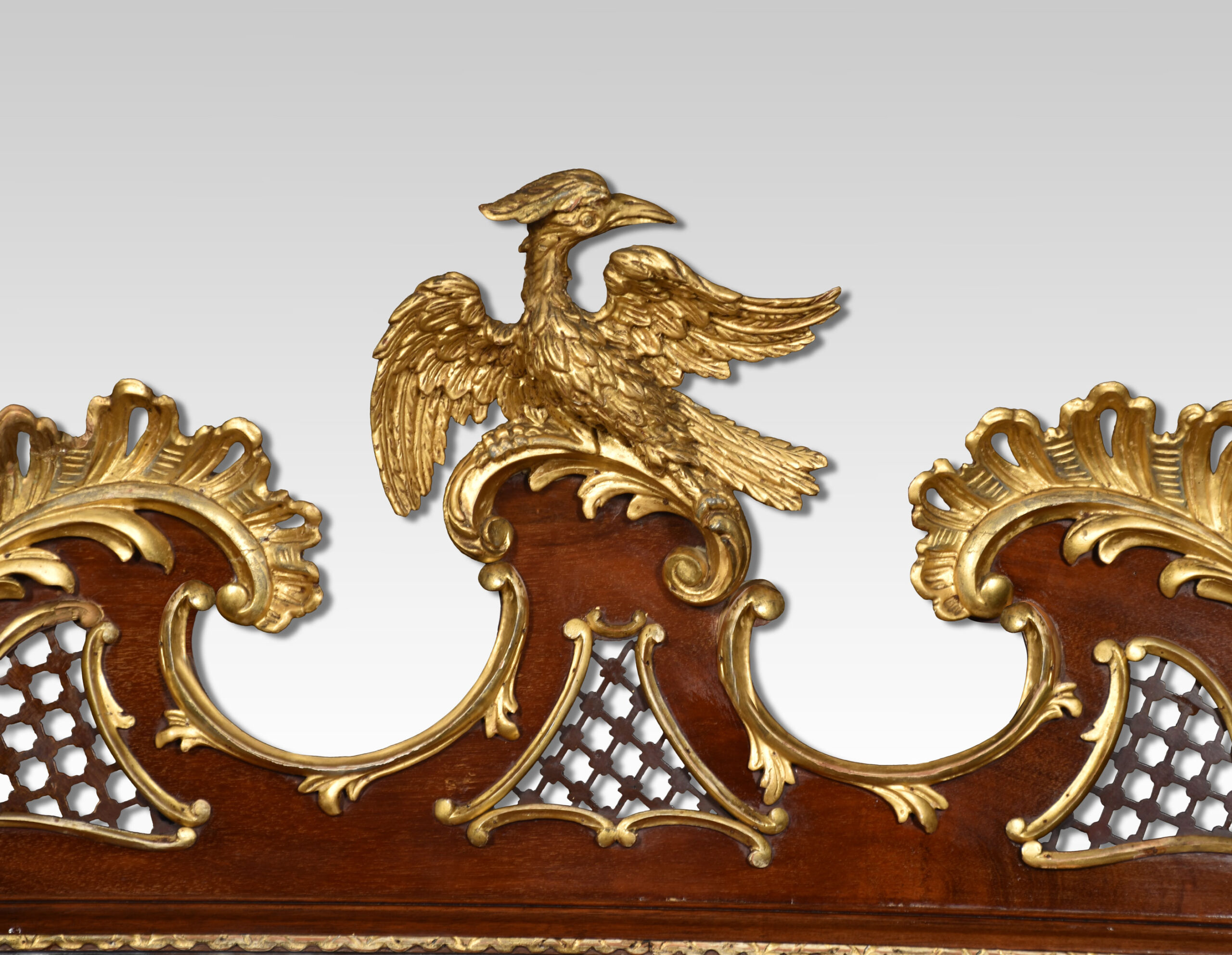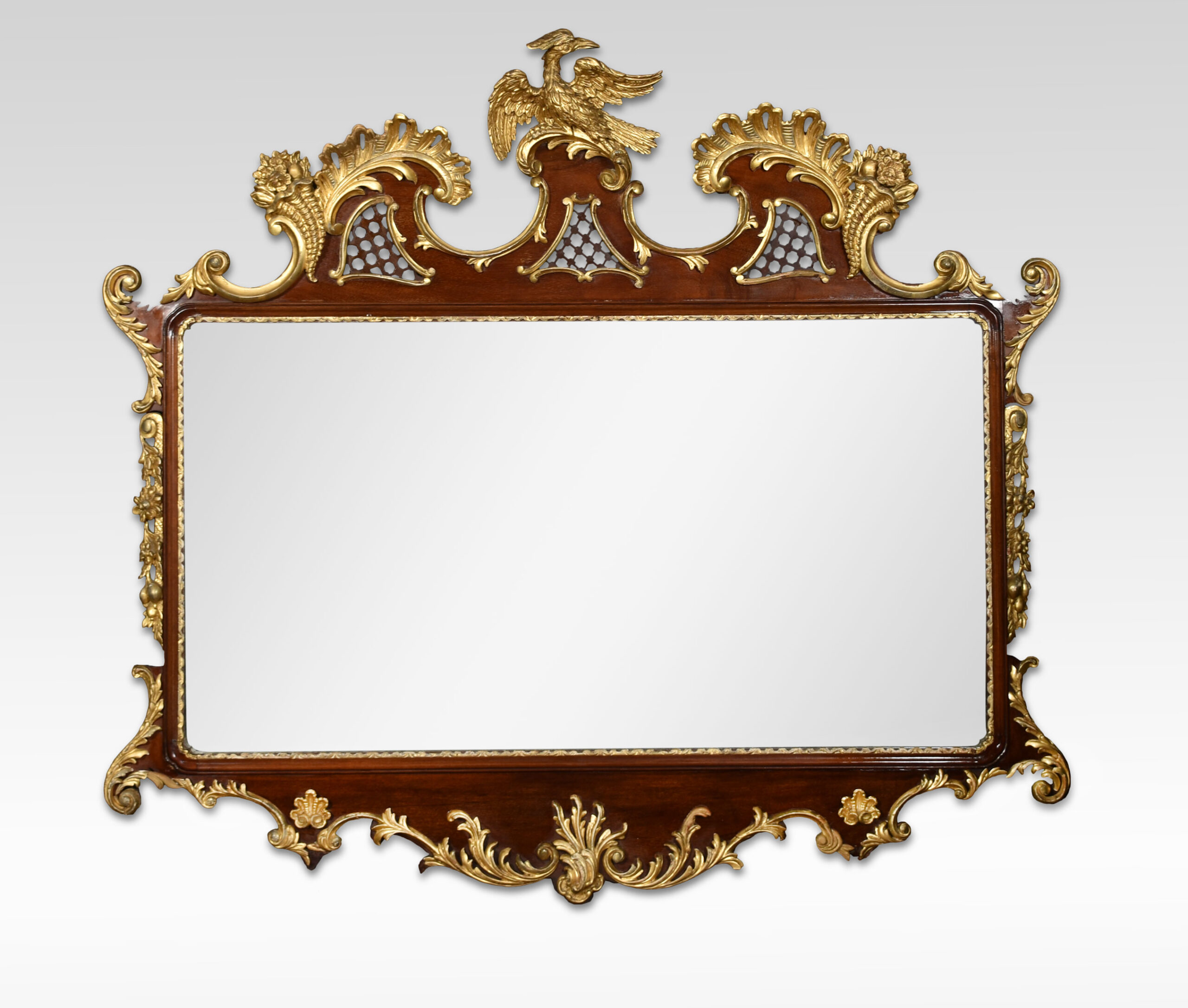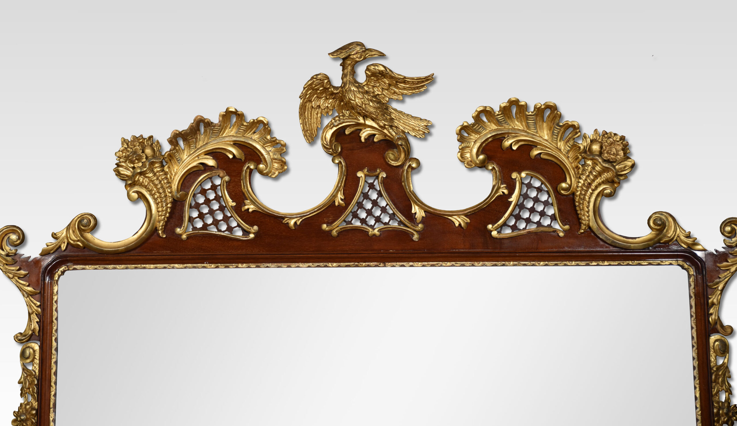 18th-century style mahogany and gilt wall mirror, the shaped and pierced top with gilt hoho bird cresting, a cornucopia of flowers and scrolling foliage, the shaped frame with gilt scrolling foliage and swags, surrounding the original rectangular plate.The gilt slips with re-entrant corners.