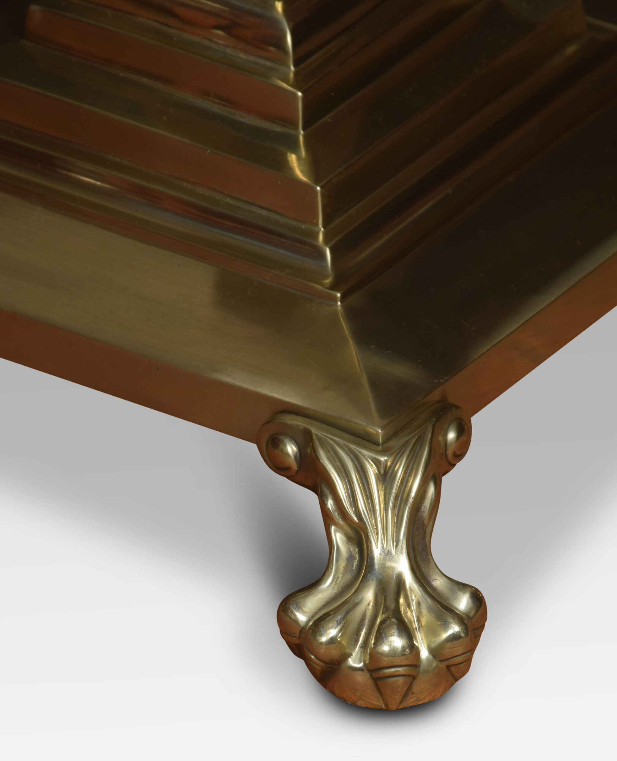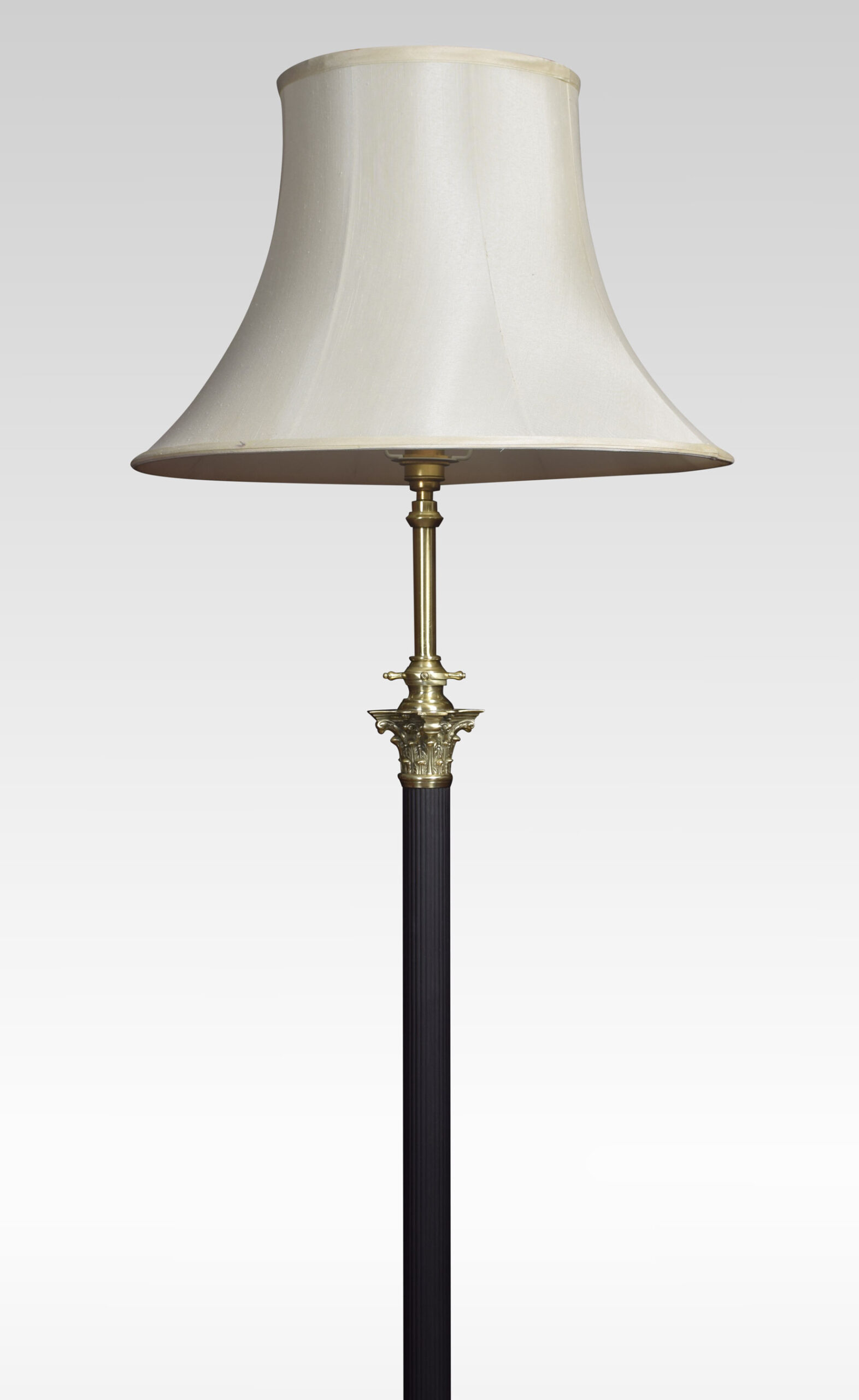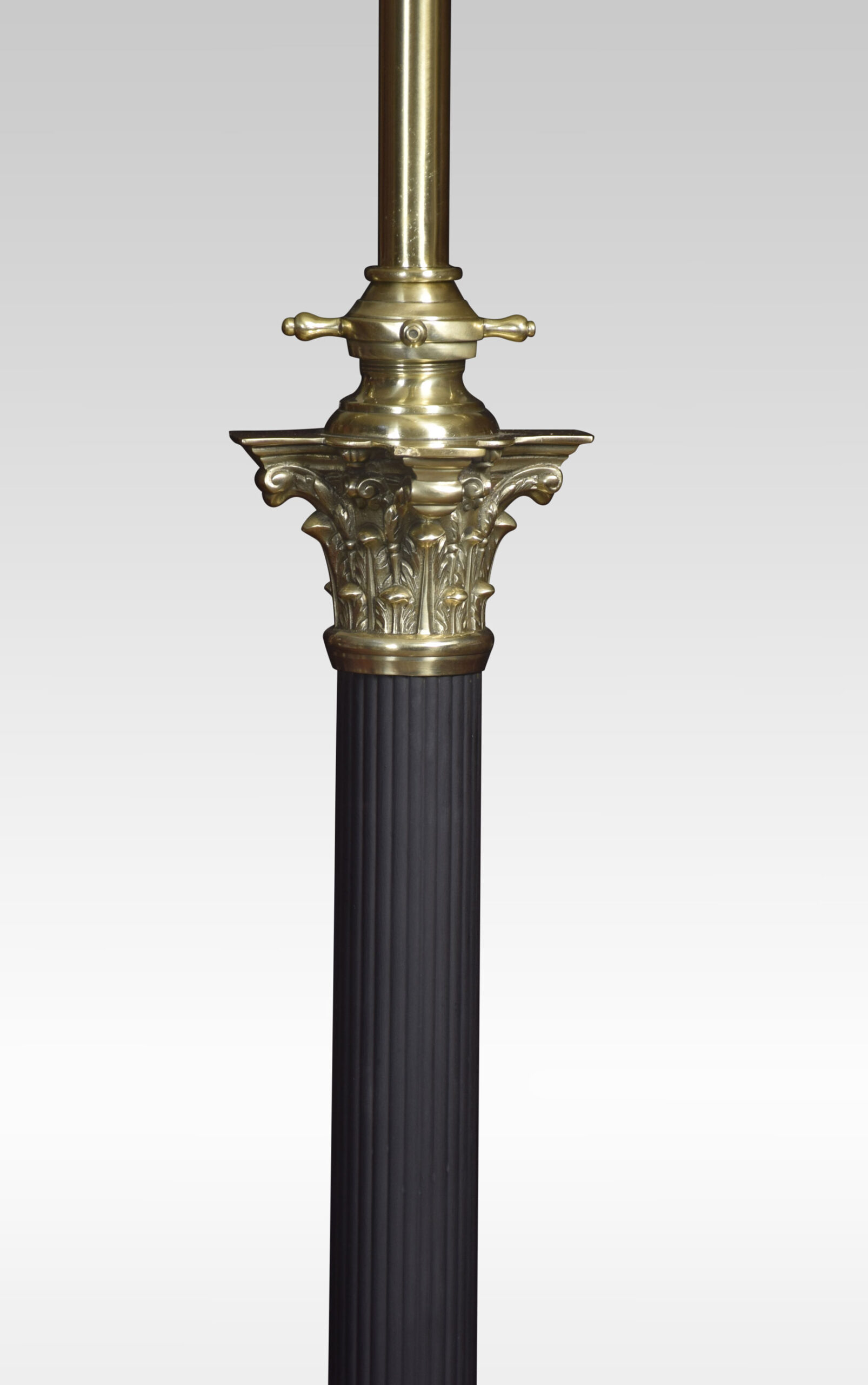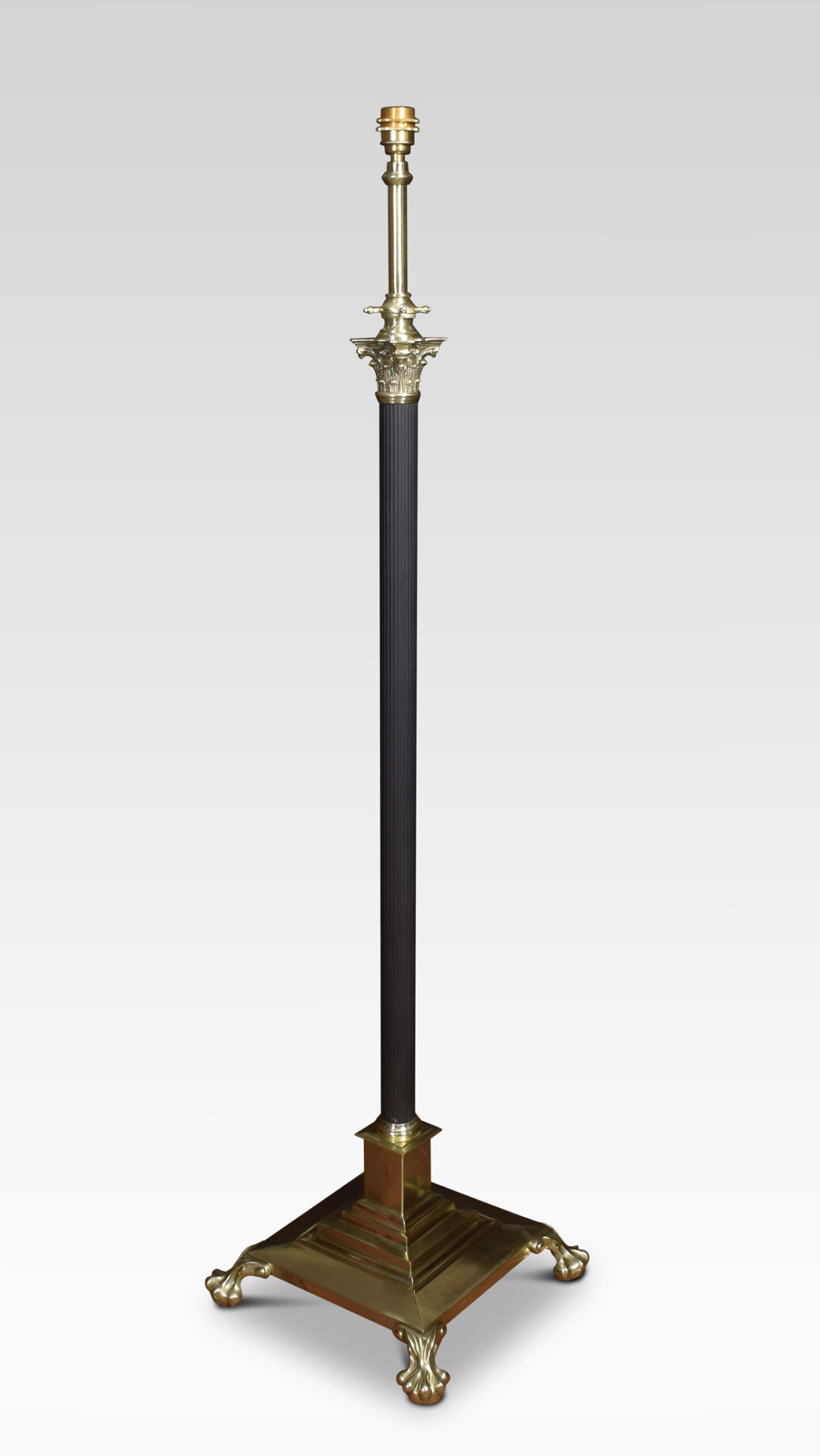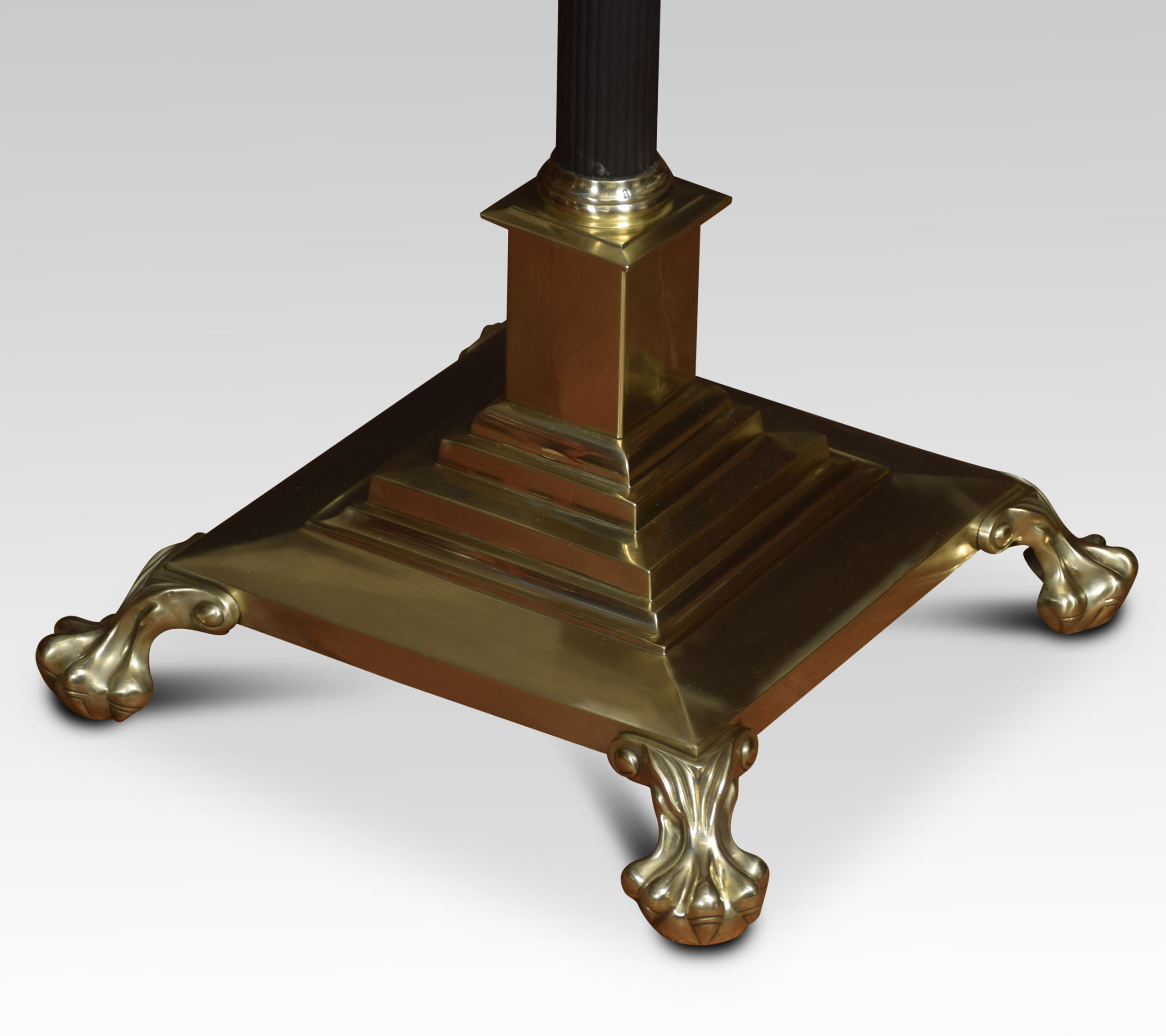 19th Century brass standard lamp. Having ebonised Corinthian column and unusually long adjustable stem, on a stepped square base with paw feet. Together with a lampshade. The lamp has been rewired.