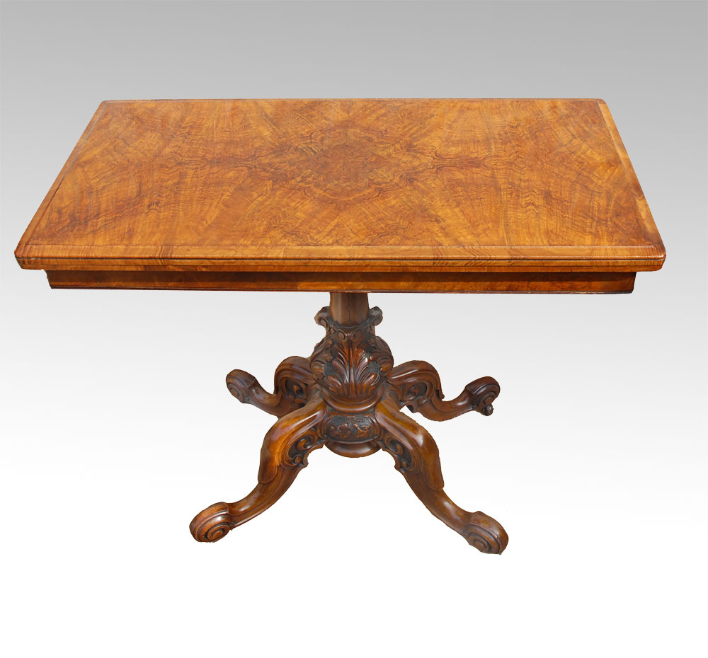A Victorian antique burr walnut card table with rounded rectangular swivel top, with inset blue base above lobed baluster floral stem and on four splayed scroll legs with ceramic castors.