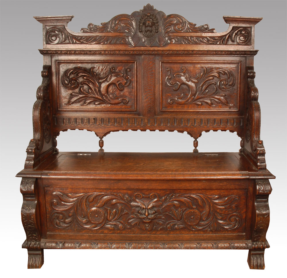 A oak box settle, the large carved oak back with central lion mask above foliate and mythical beast carved panels above hinged seat with shaped arms the base having large central carved foliated panel raised up on paw supports