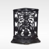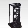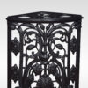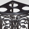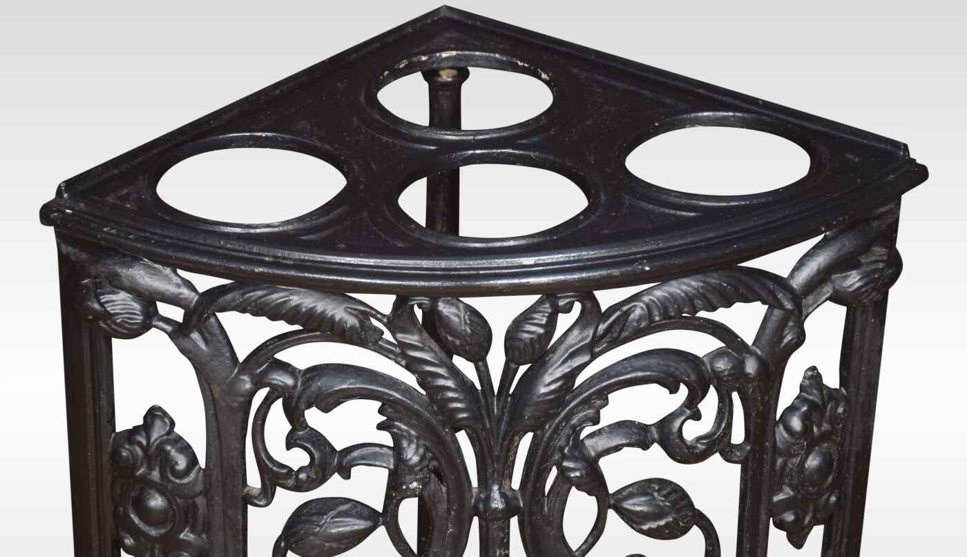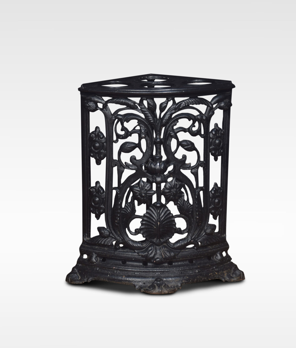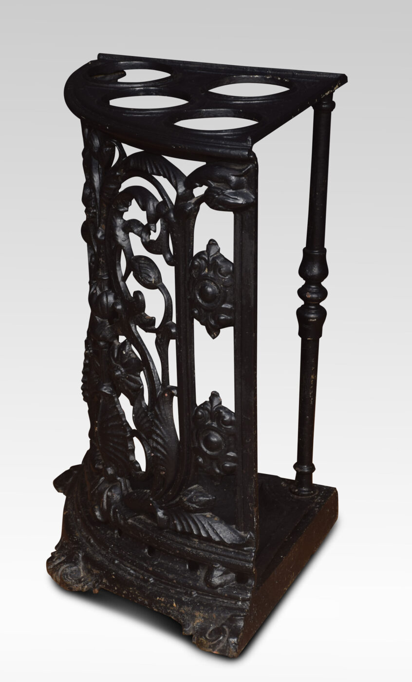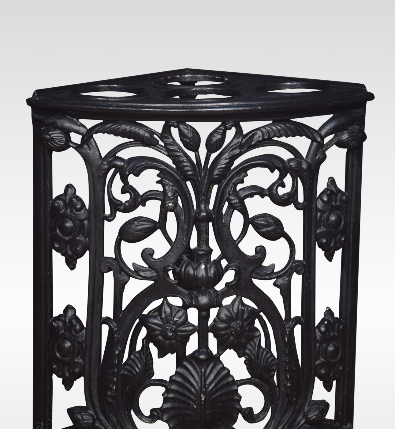Victorian cast iron corner umbrella stand, The shaped top with four holes, above cast leaf and floral scroll decoration. All raised up on scrolling feet.