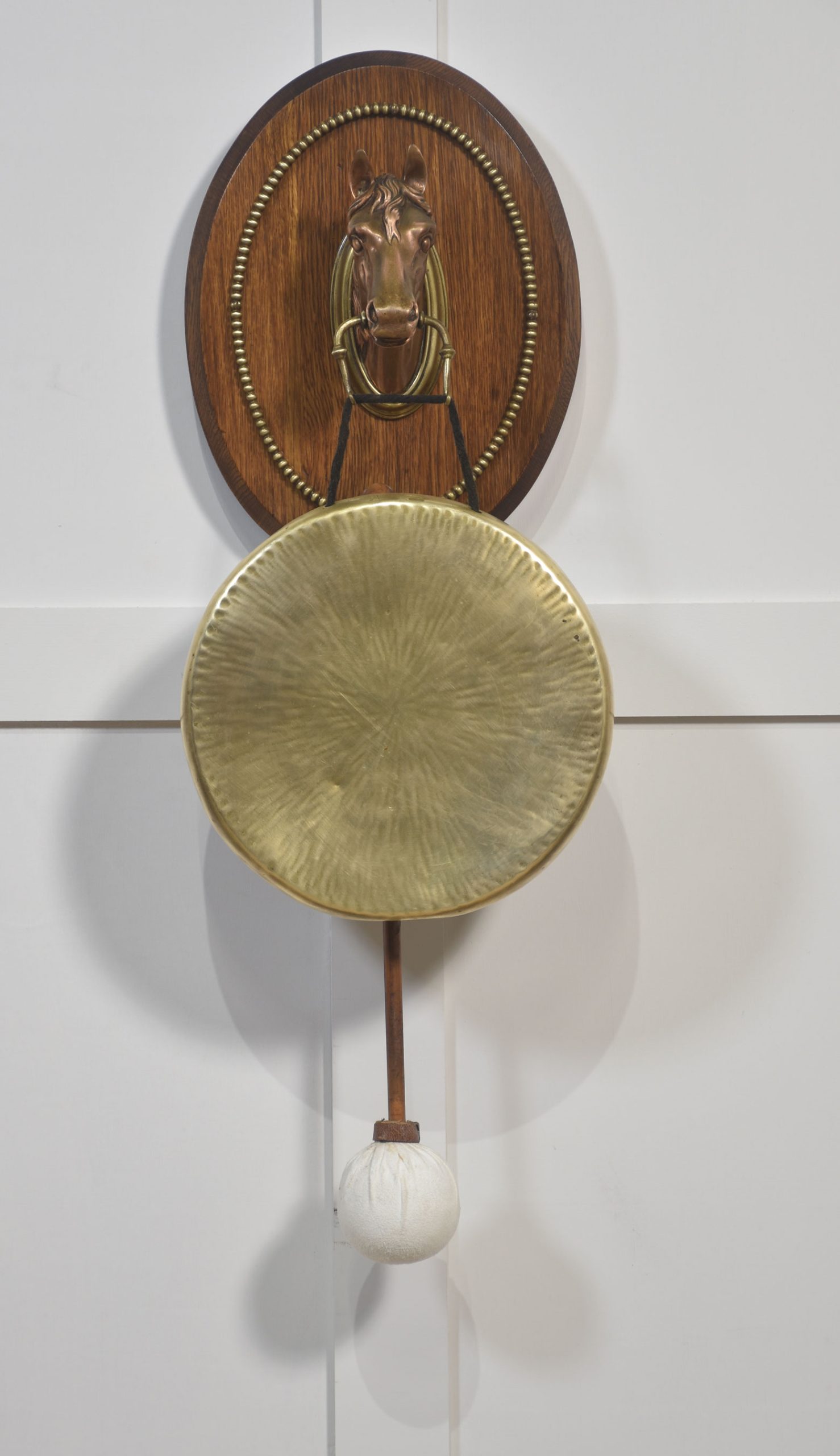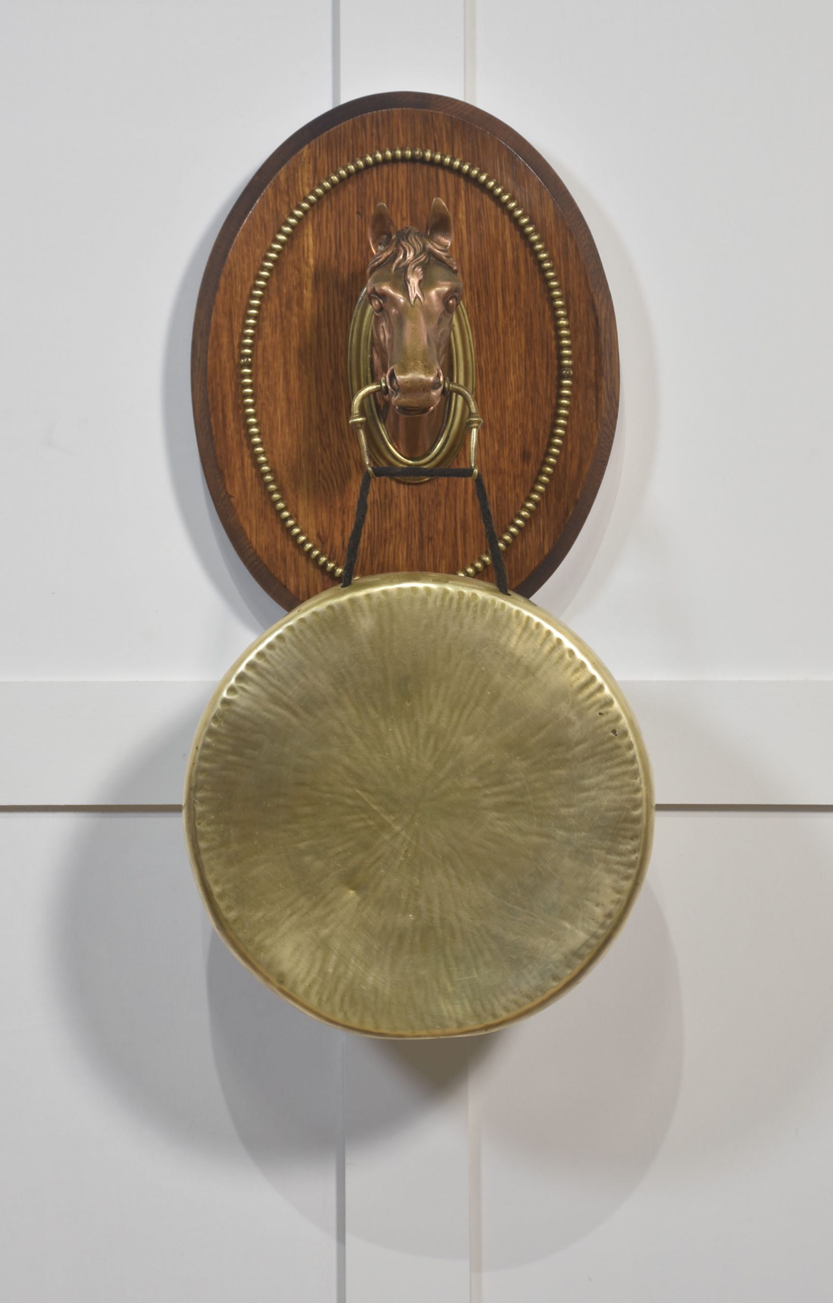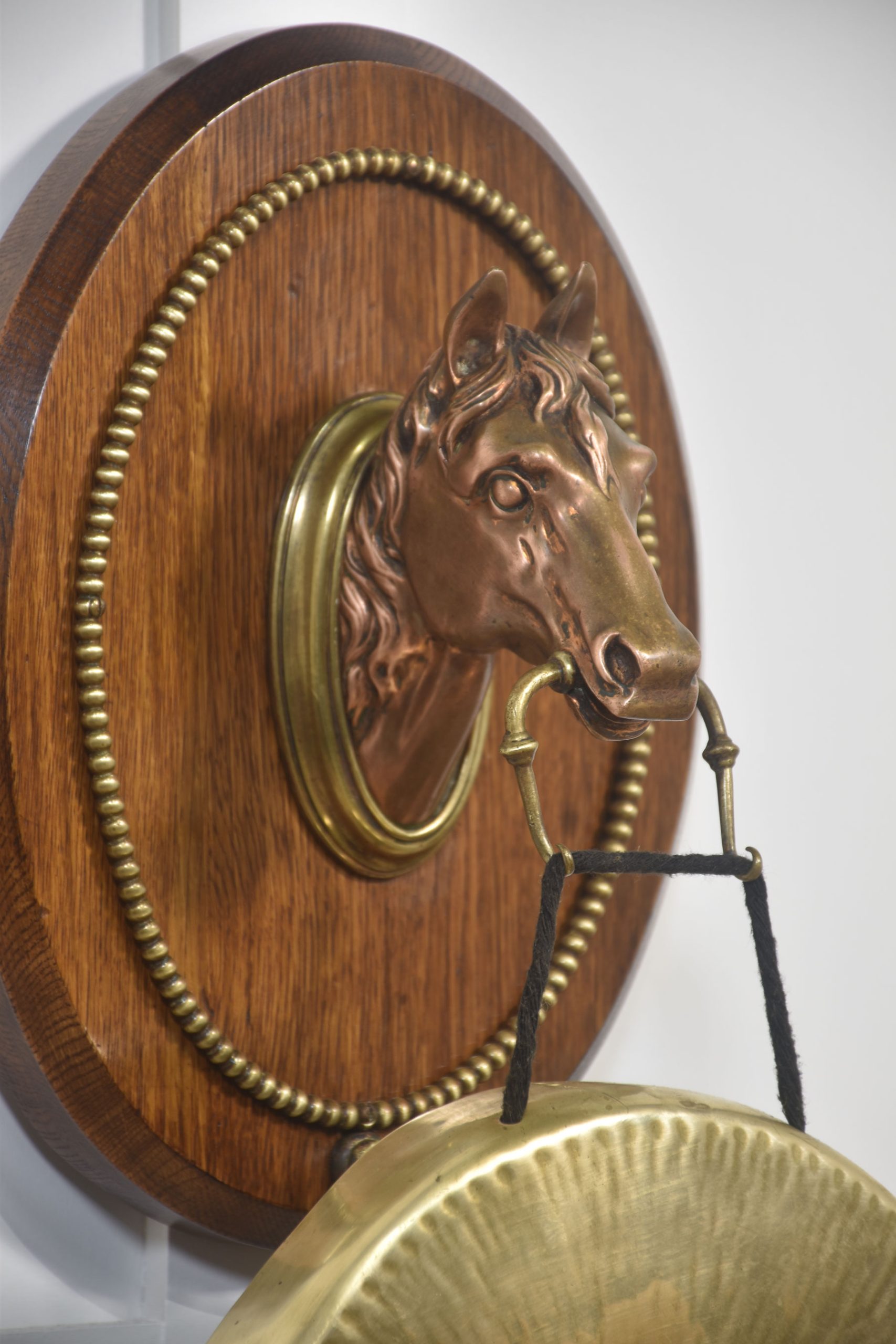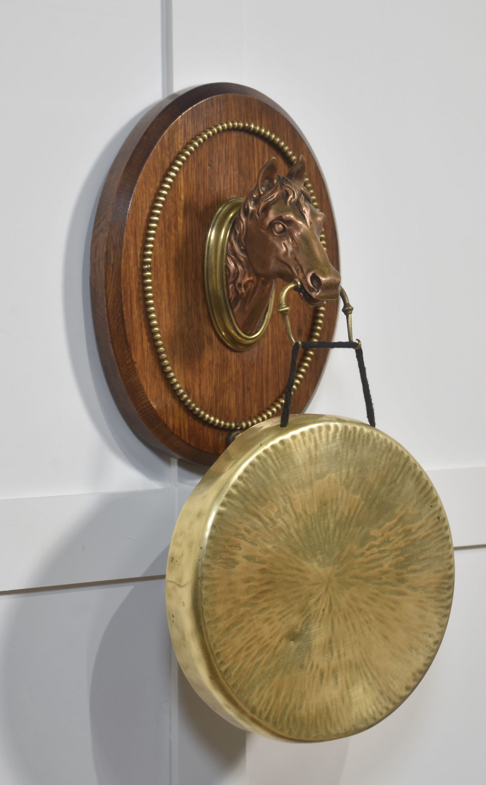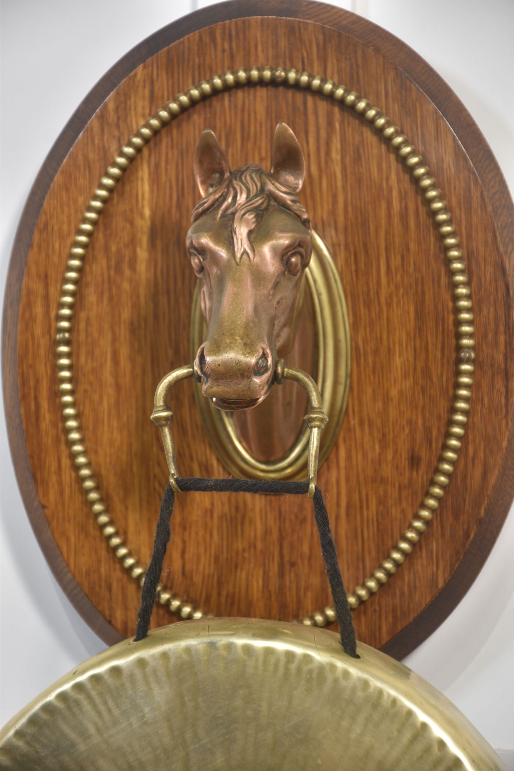 Wall hanging dinner gong, the oak backplate mounted with copper horse head supporting the circular gong. Together with a hammer.