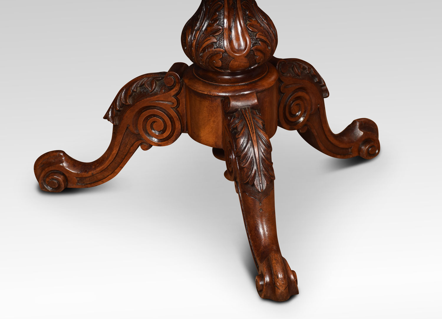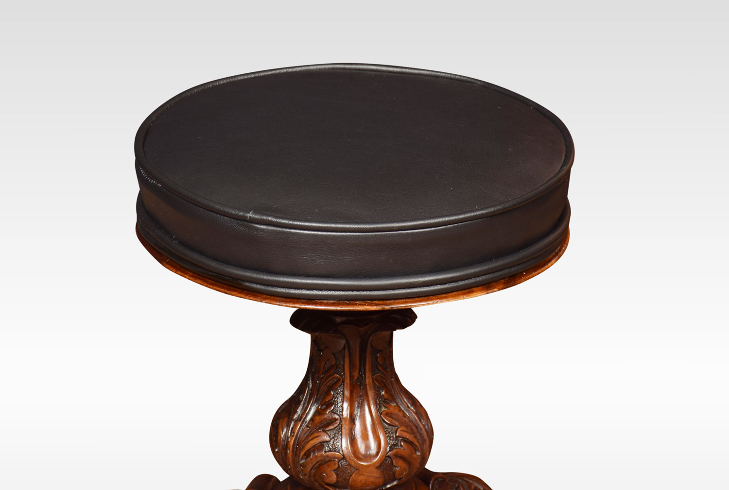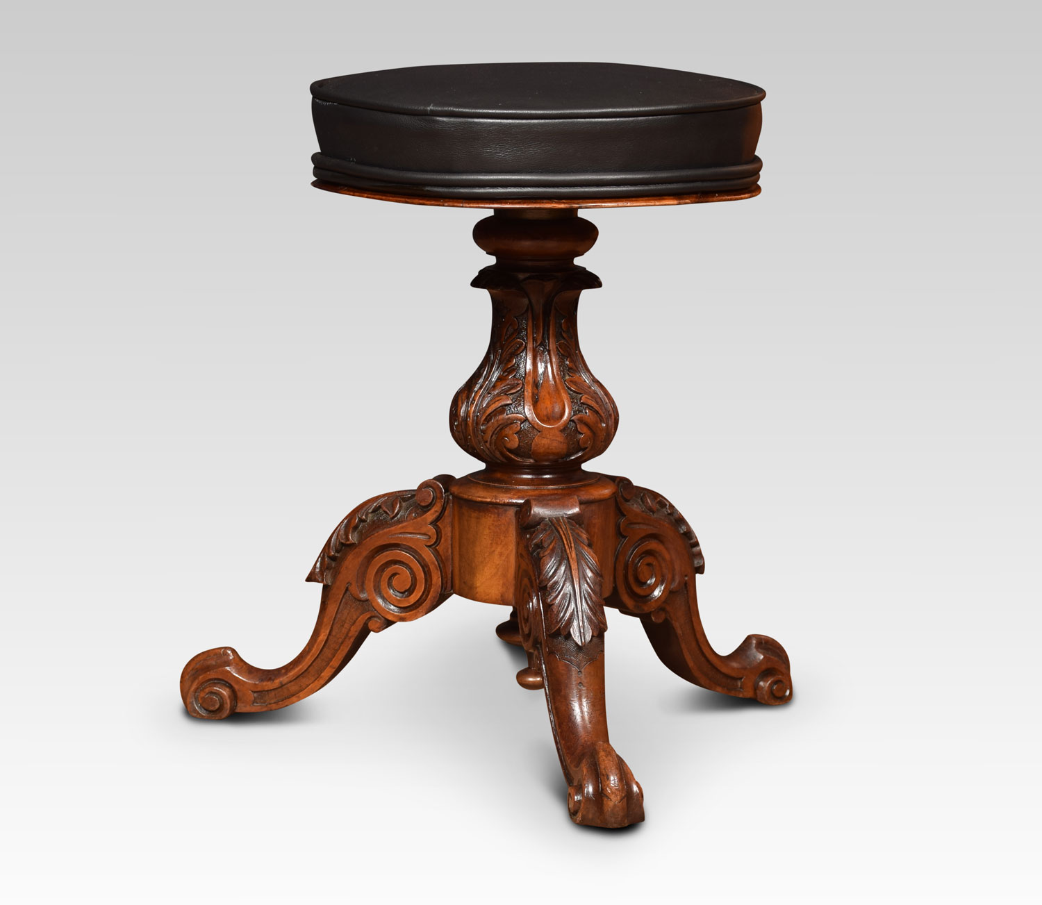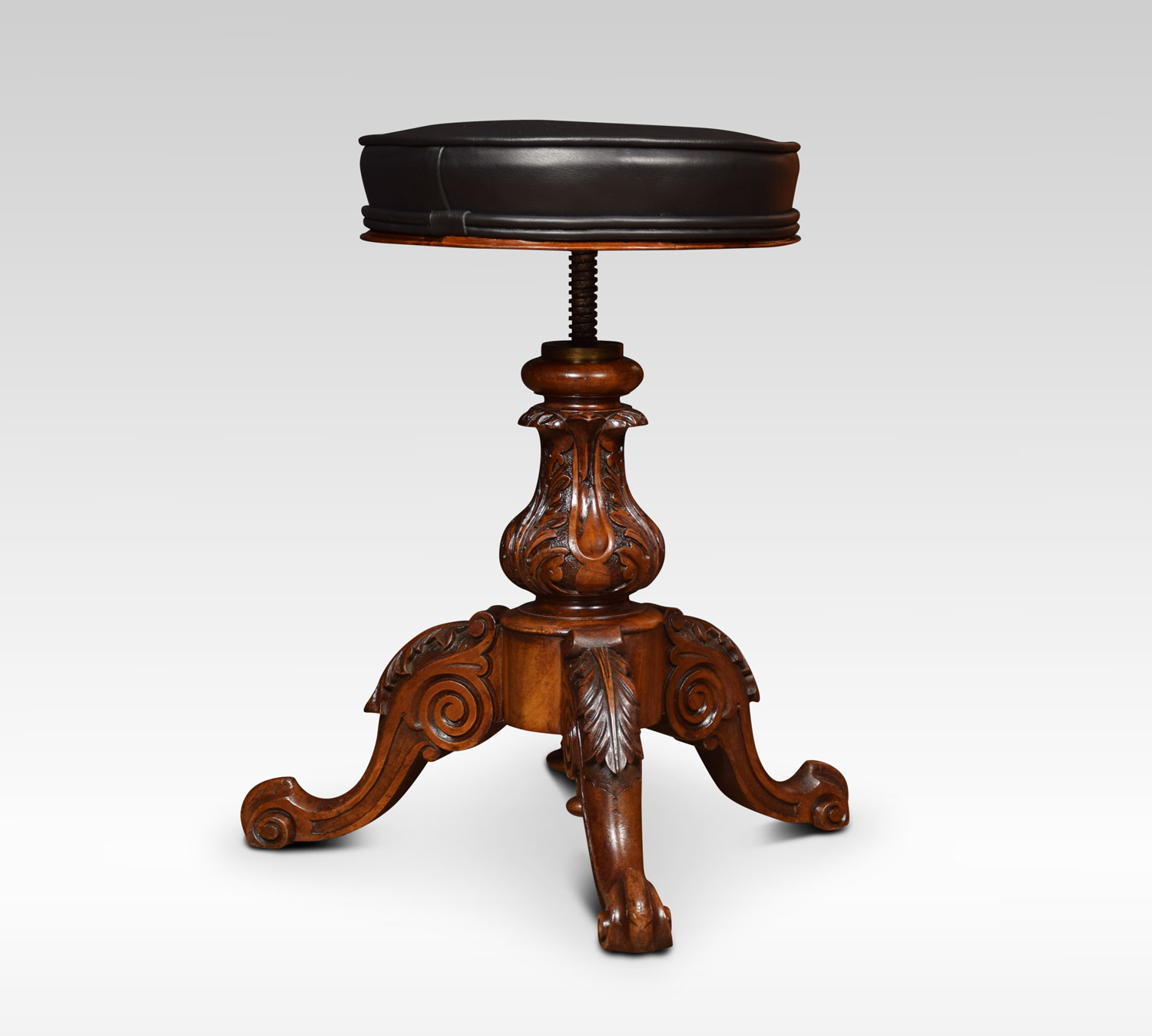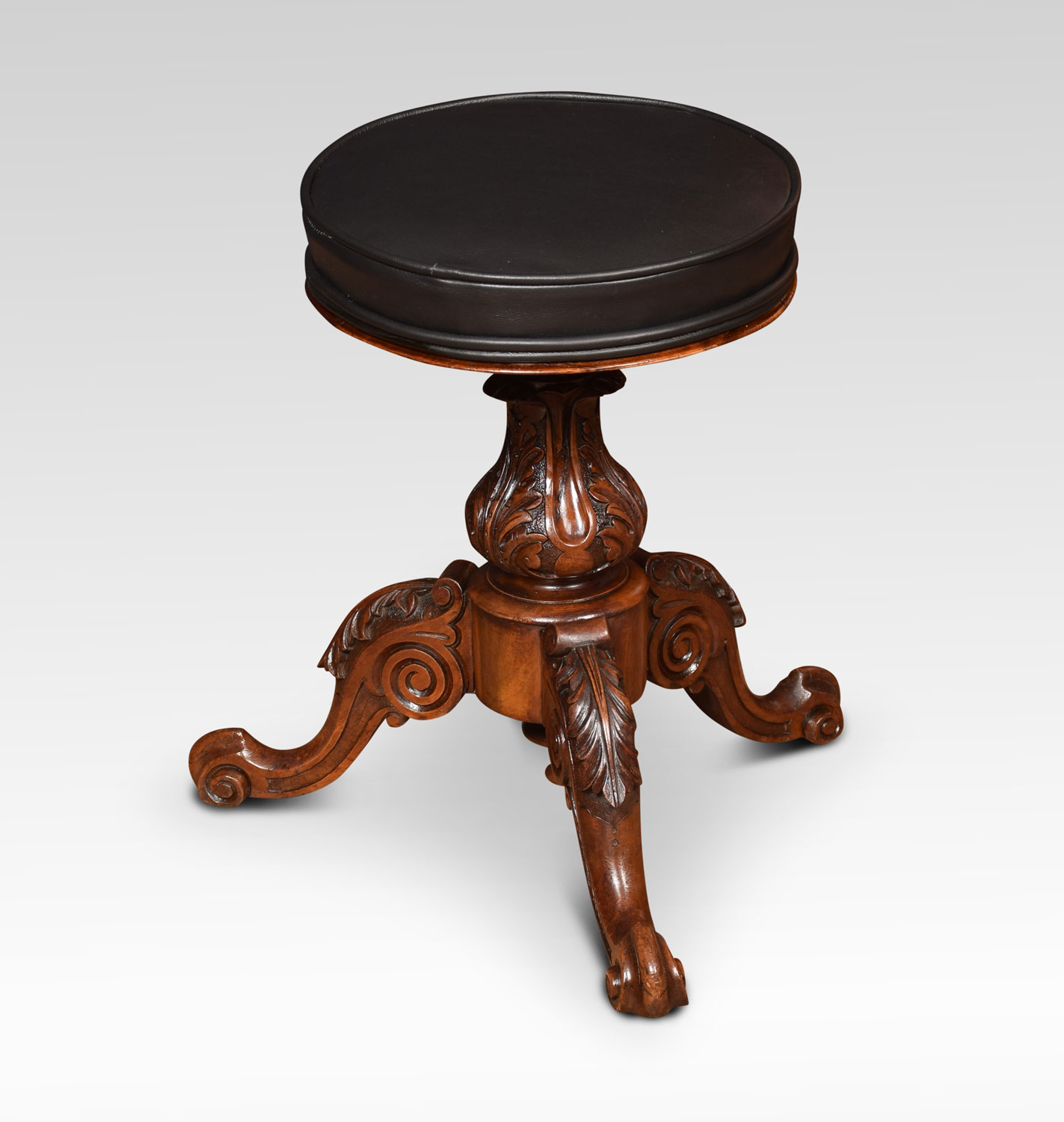 Victorian walnut adjustable piano stool with upholstered black leather seat above turned central acanthus carved column all raised up on scroll cabriole legs.