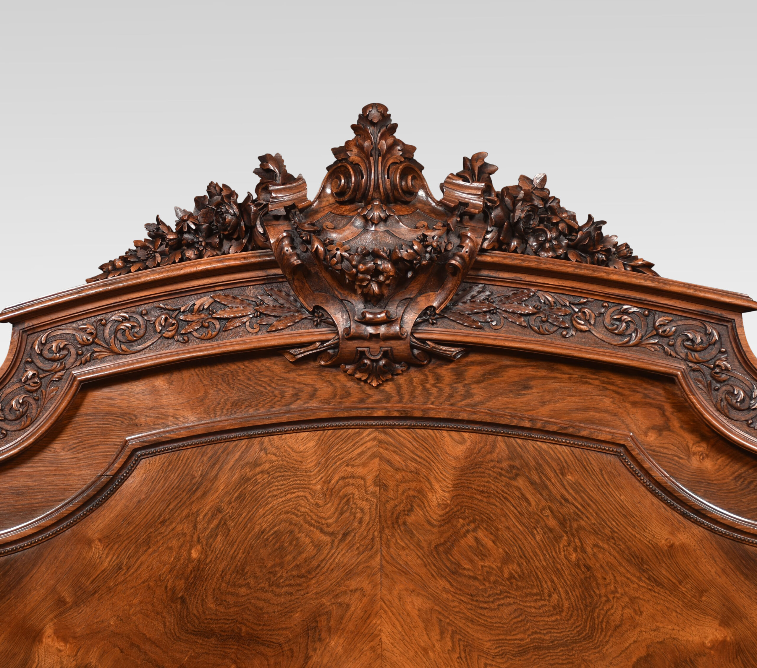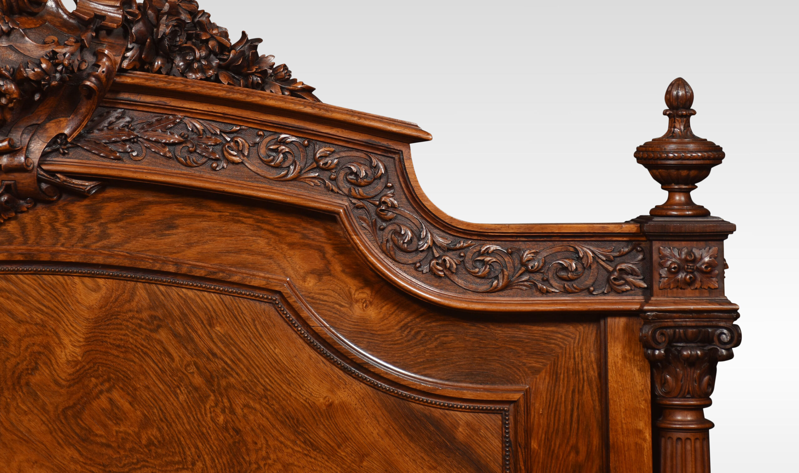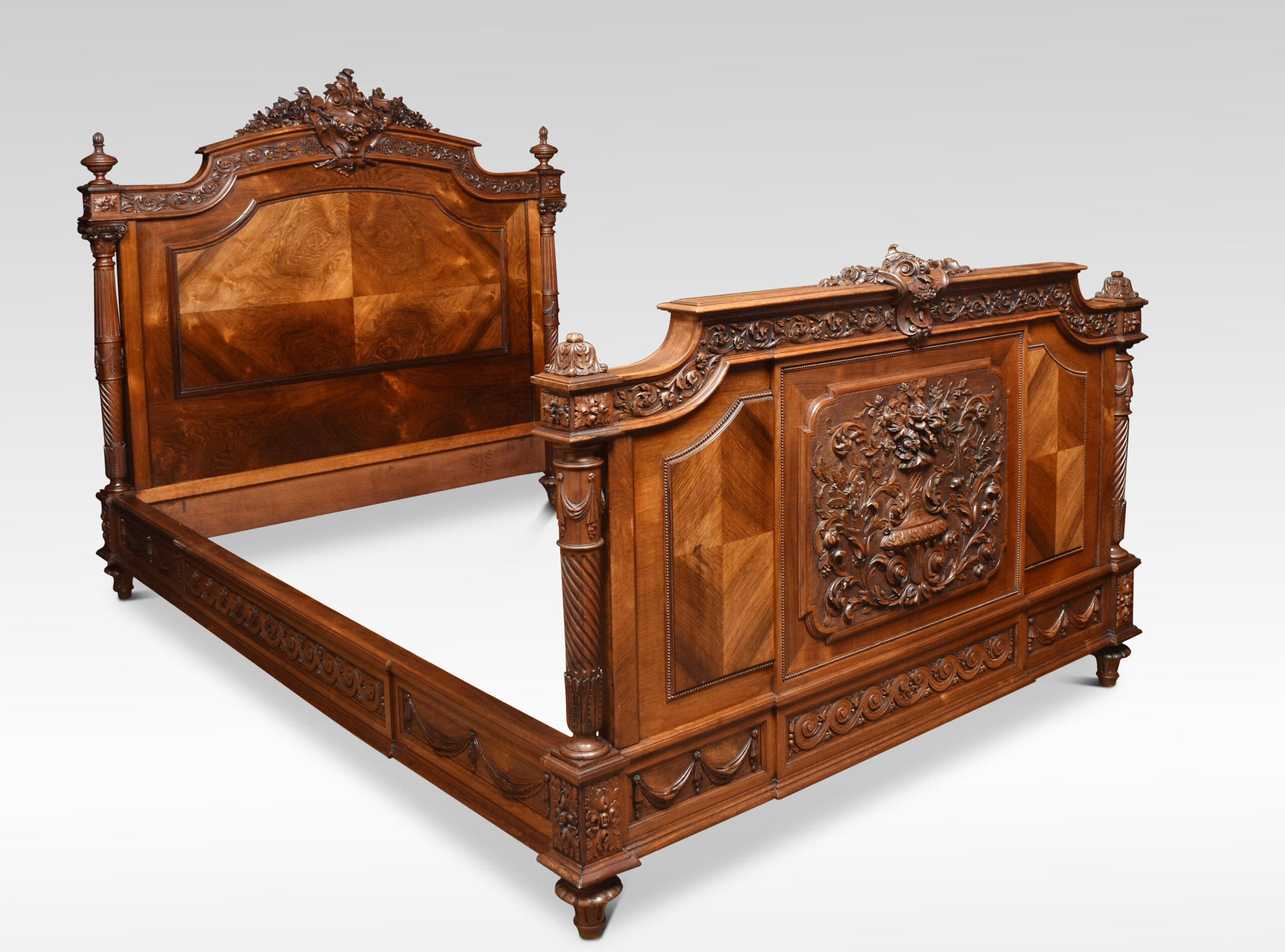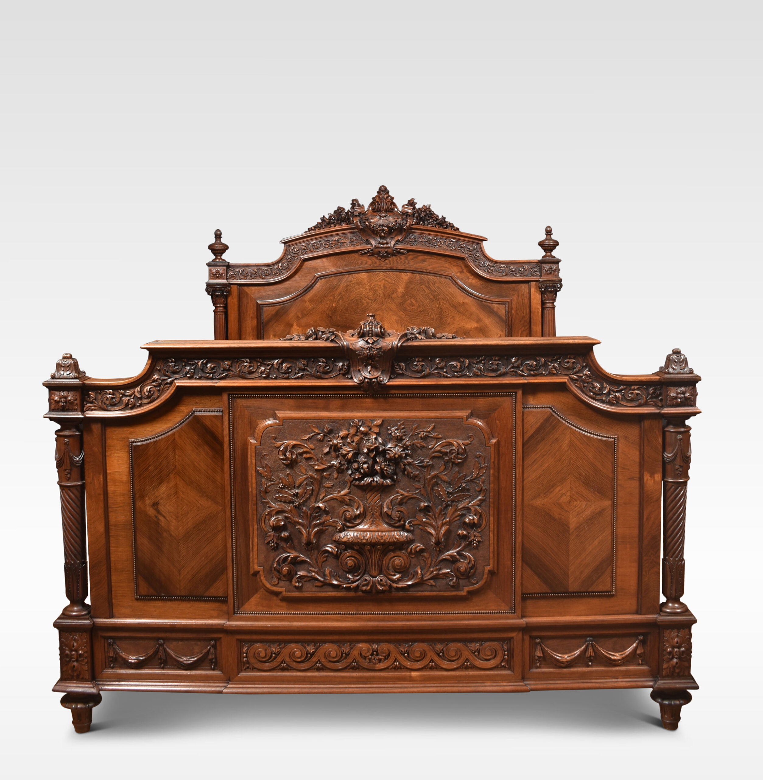 French-style walnut and rosewood double bed the ornately carved headboard flanked by reeded columns with urn capitals. To the side rails with scrolling and swag detail. The footboard with exceptional central carved panels flanked by reeded columns all raised up on turned feet.