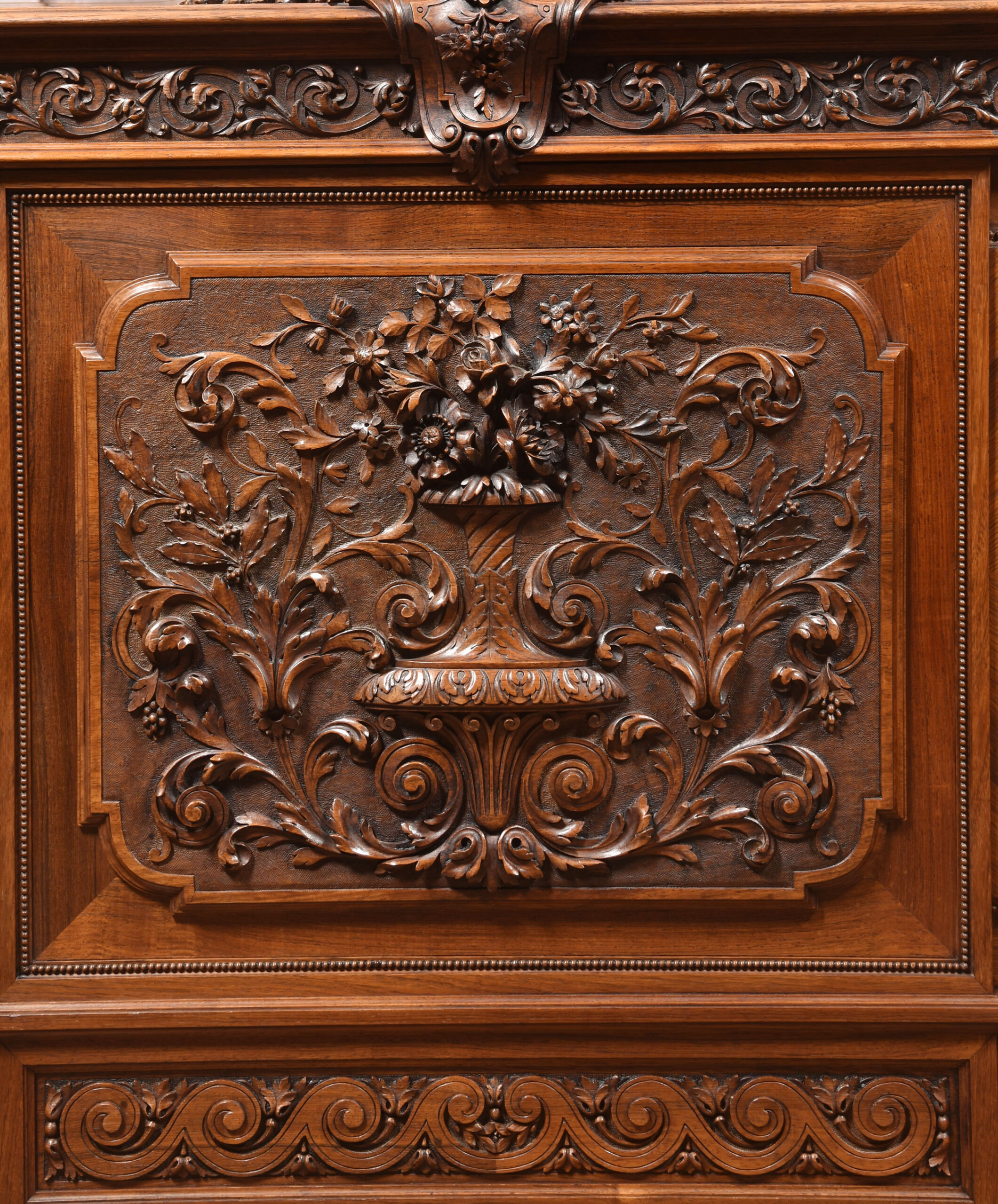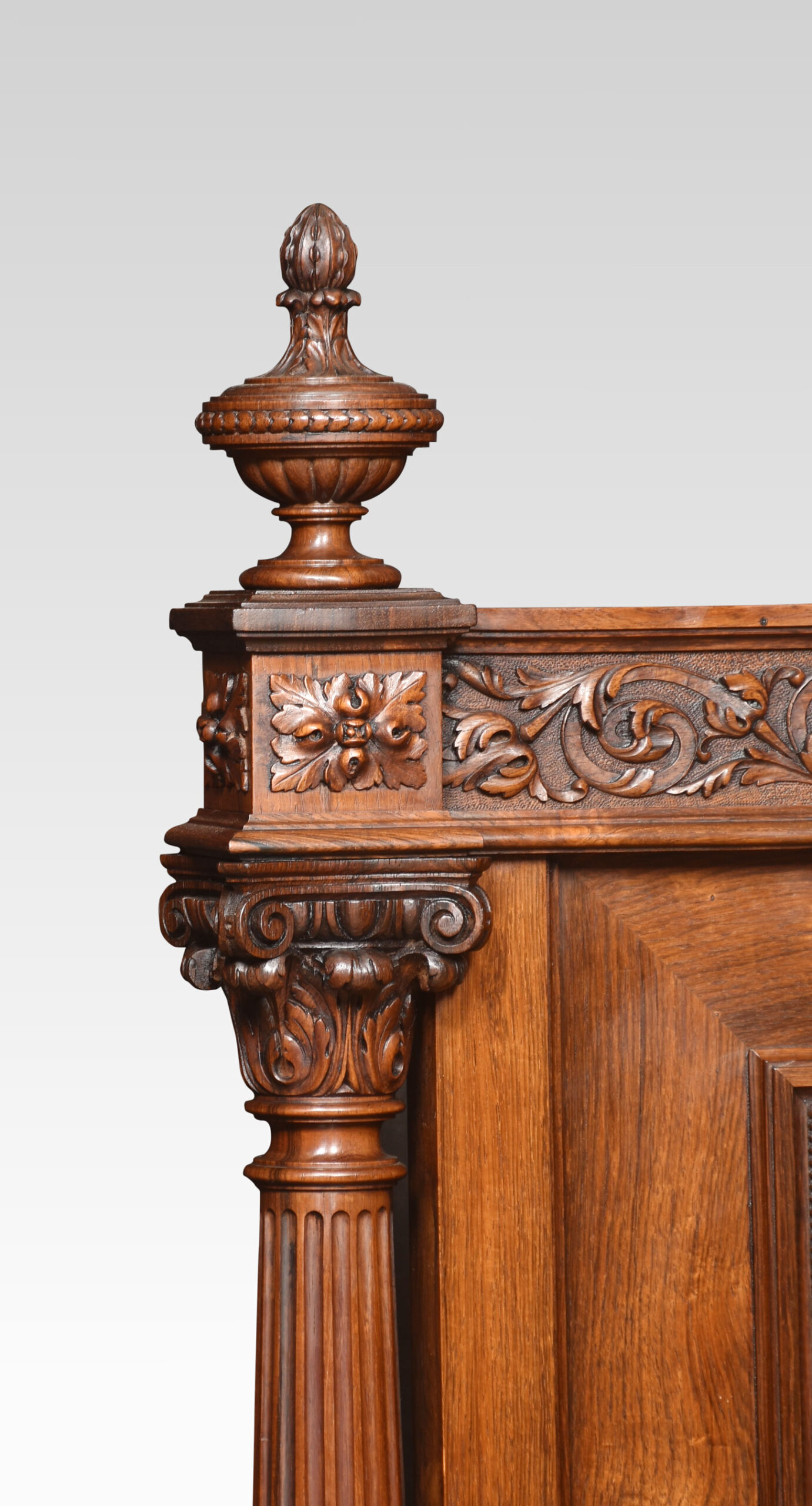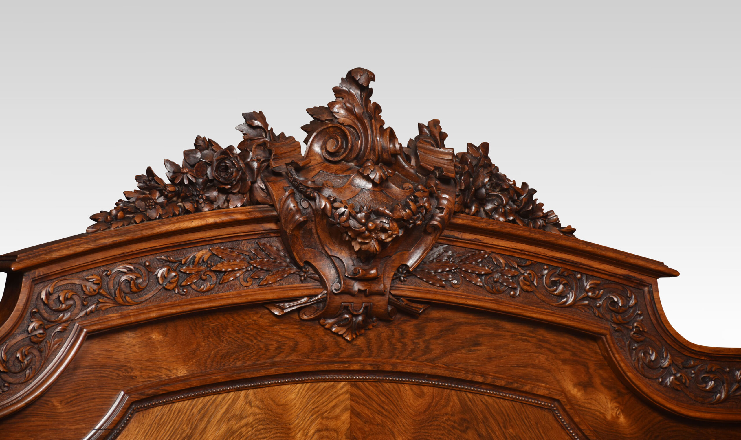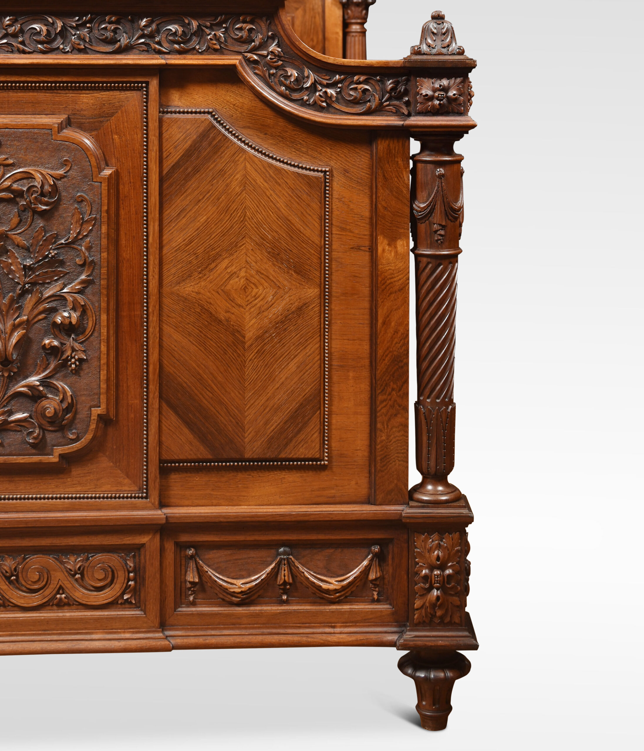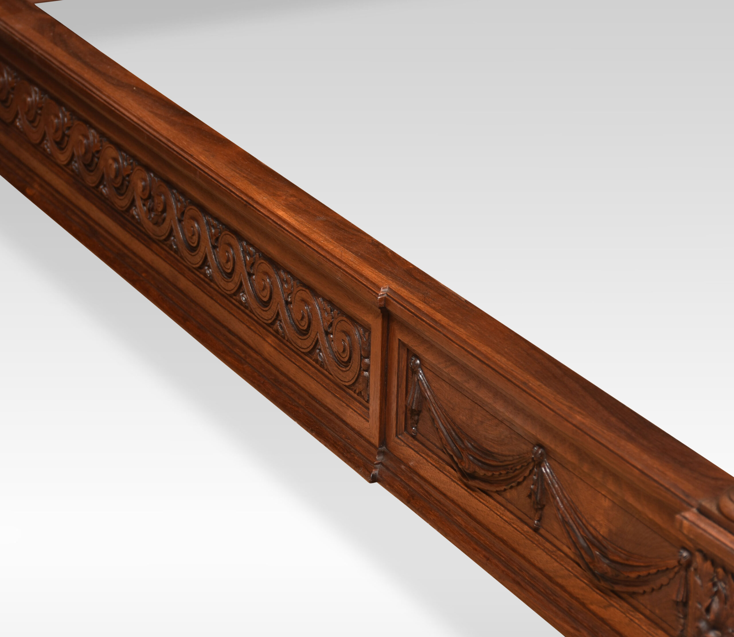 French-style walnut and rosewood double bed the ornately carved headboard flanked by reeded columns with urn capitals. To the side rails with scrolling and swag detail. The footboard with exceptional central carved panels flanked by reeded columns all raised up on turned feet.