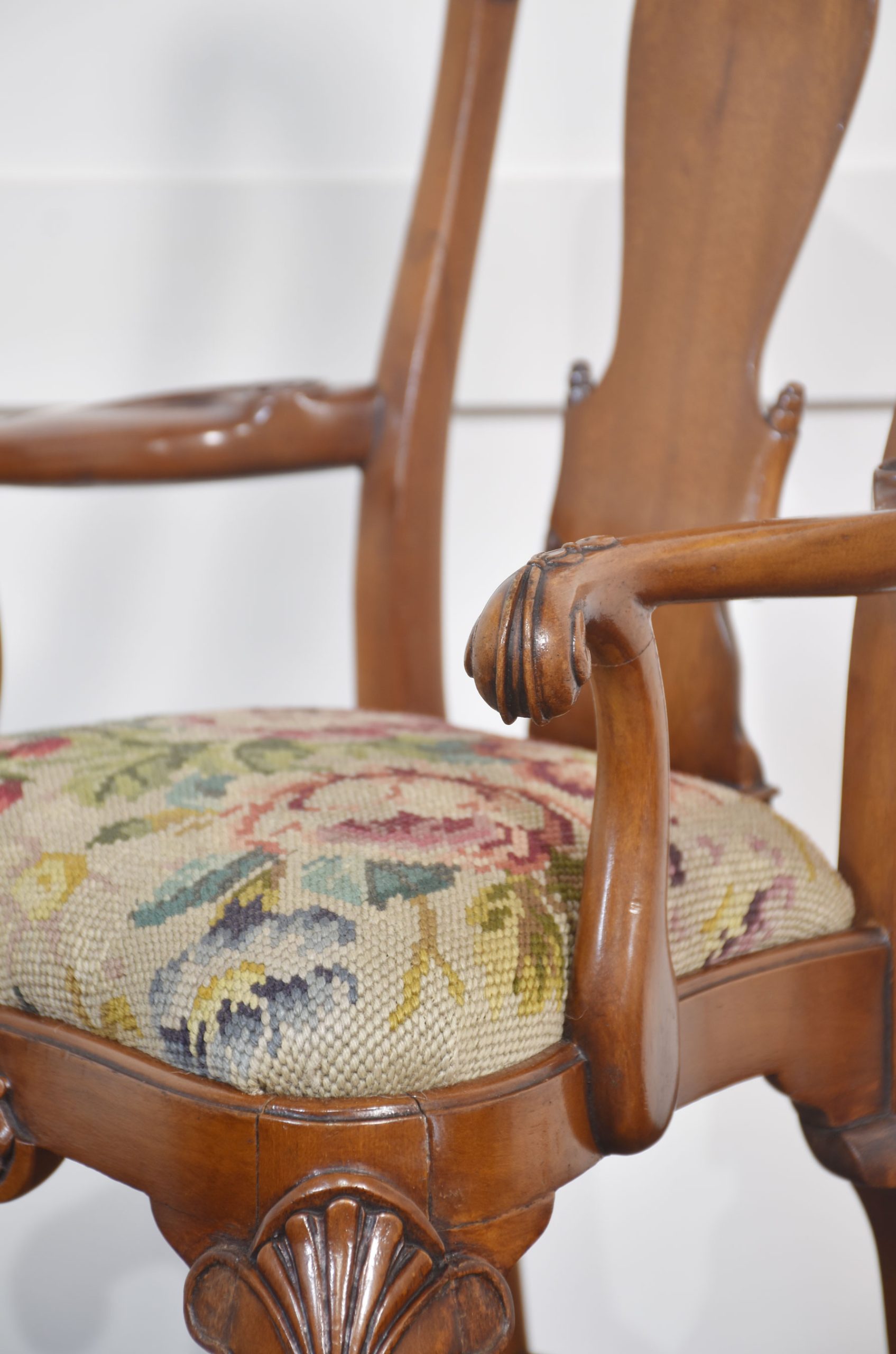 19th-century walnut child’s armchair the shaped back with a central splat to the needlepoint removable seat cushion, enclosed by outswept arms. All raised up on shell-capped carved cabriole legs terminating in pad feet.