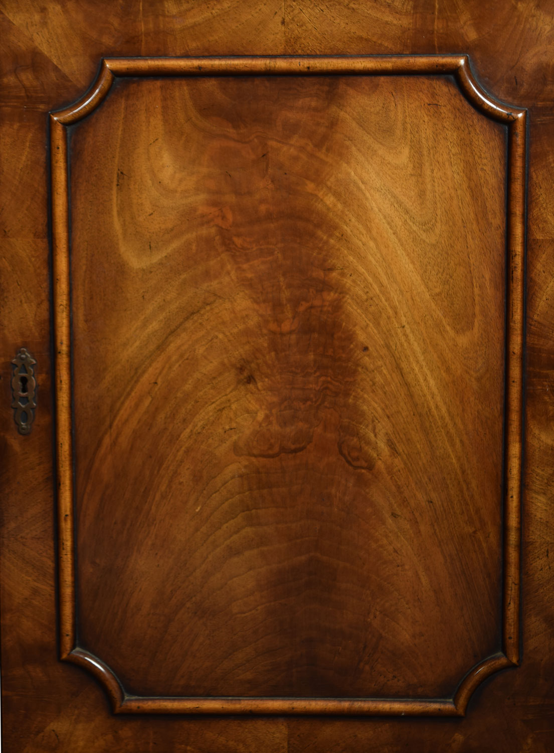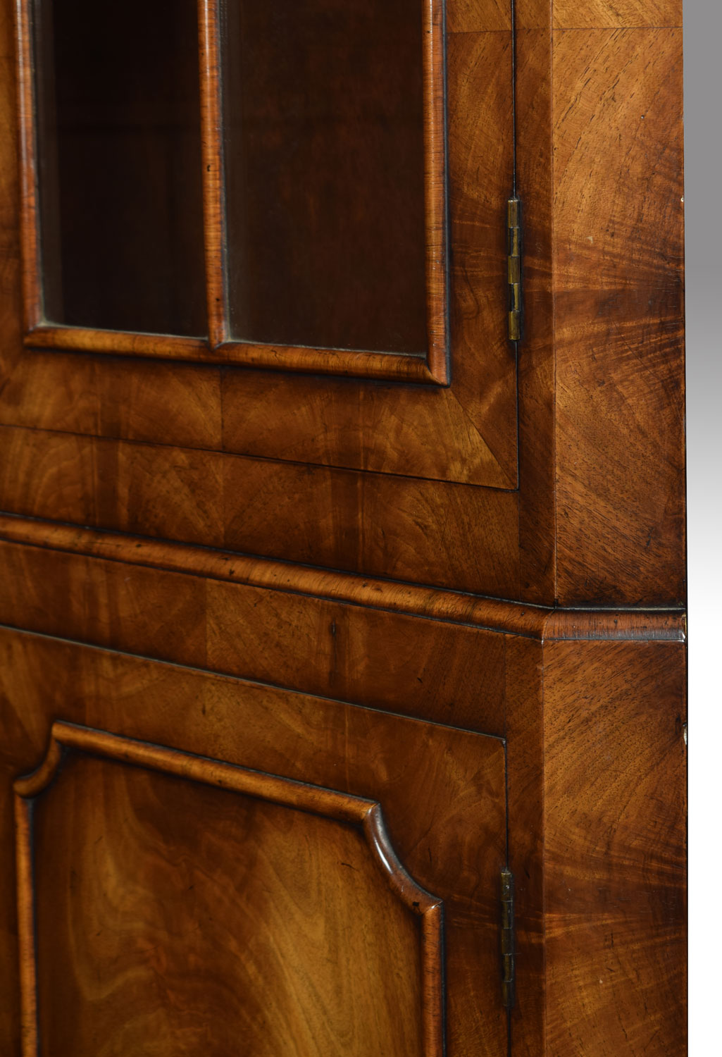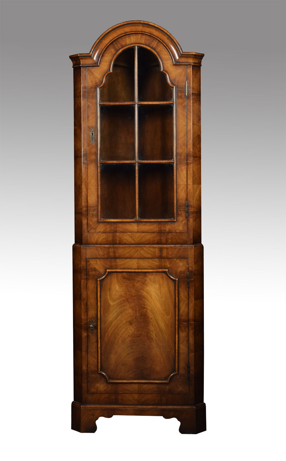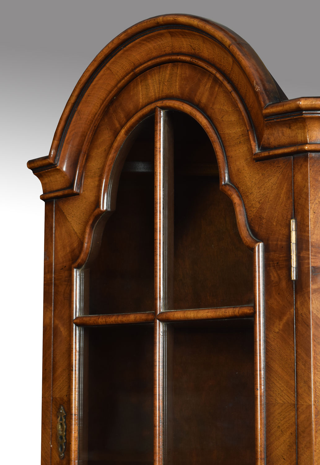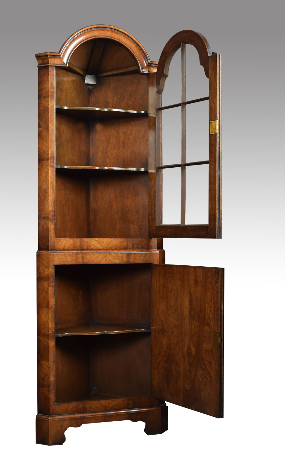 Walnut floor standing corner cabinet, the dome top above single glazed door enclosing two fixed shelves to the base section with a panelled cabinet door opening to reveal single fixed shelf all raised up on bracket feet.