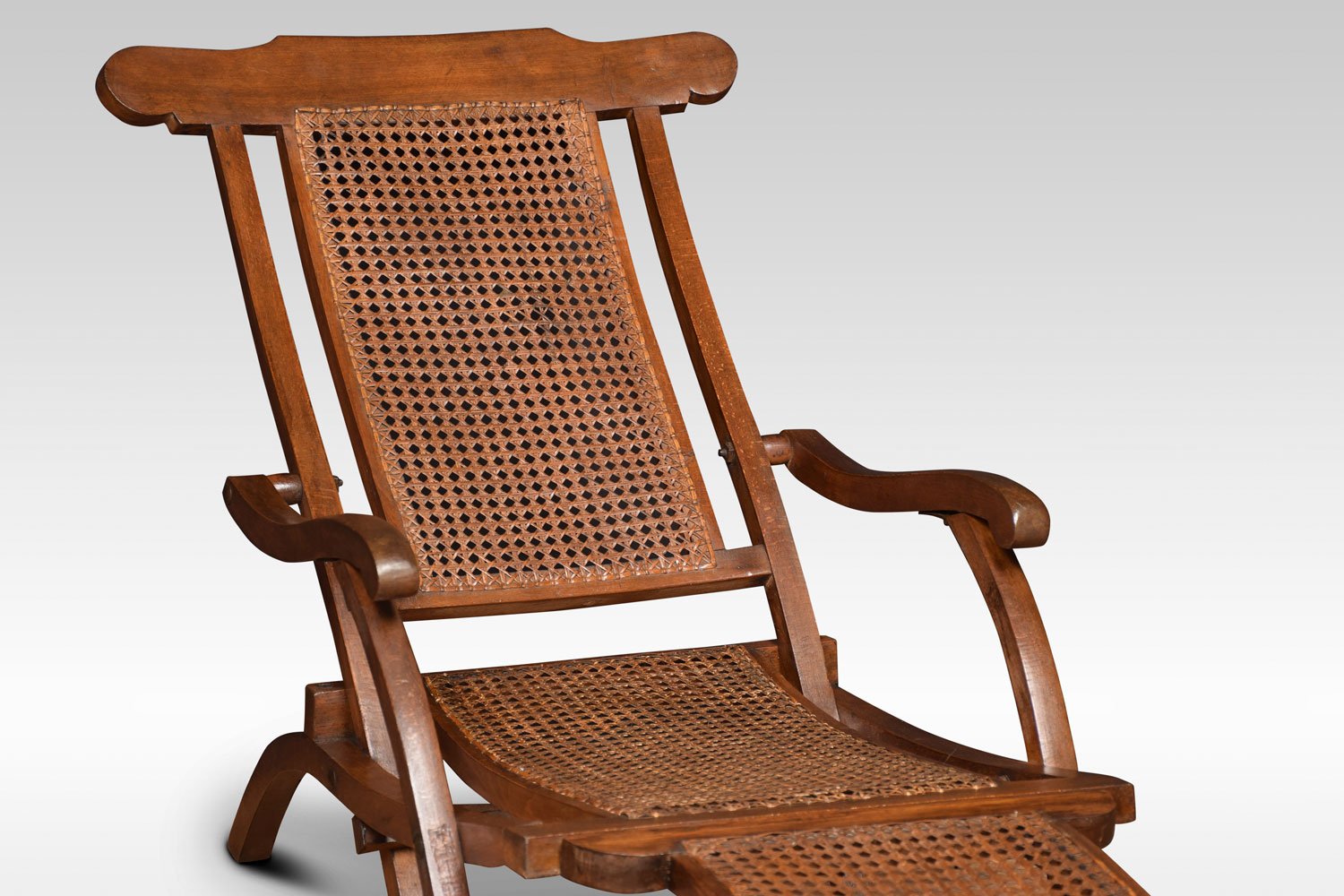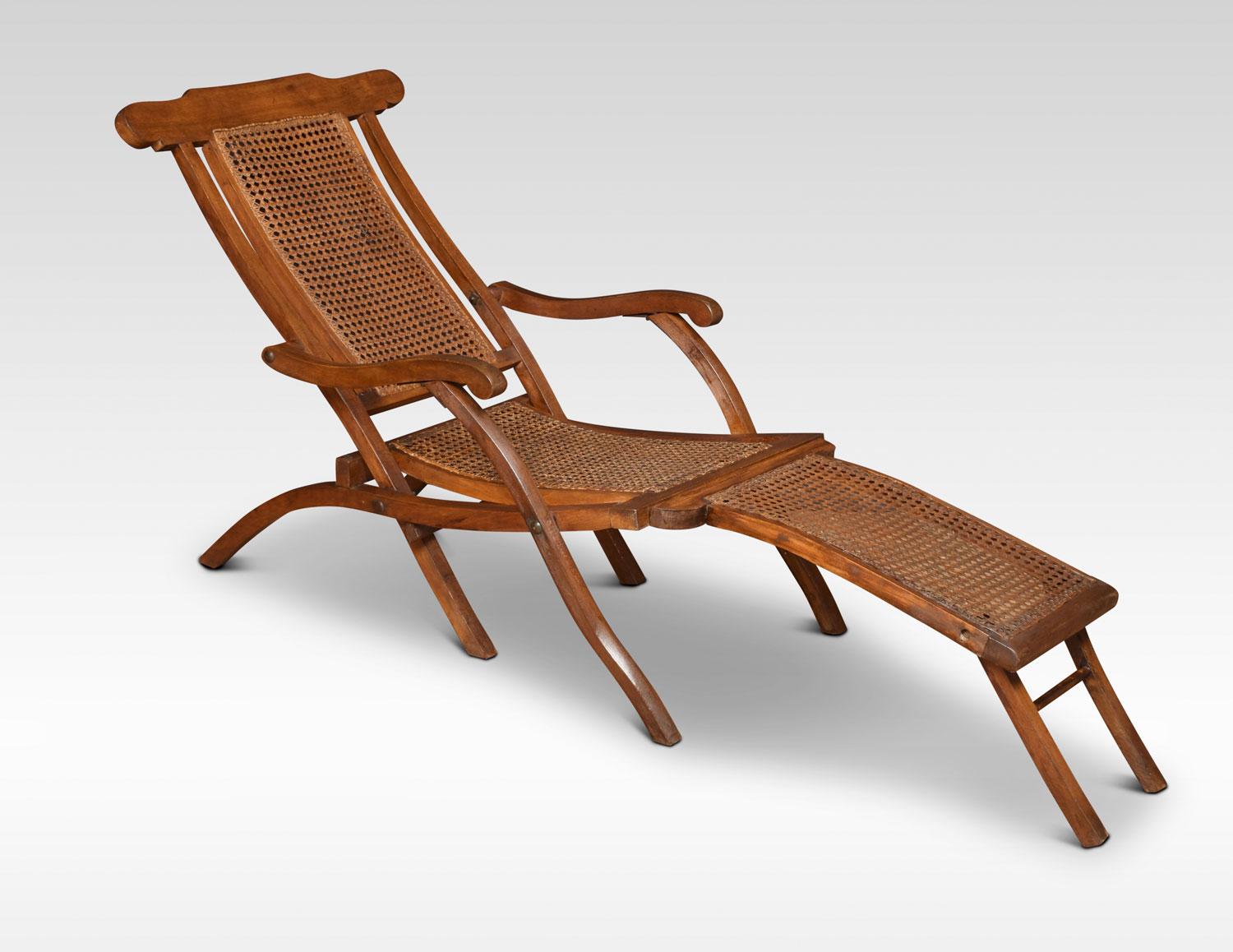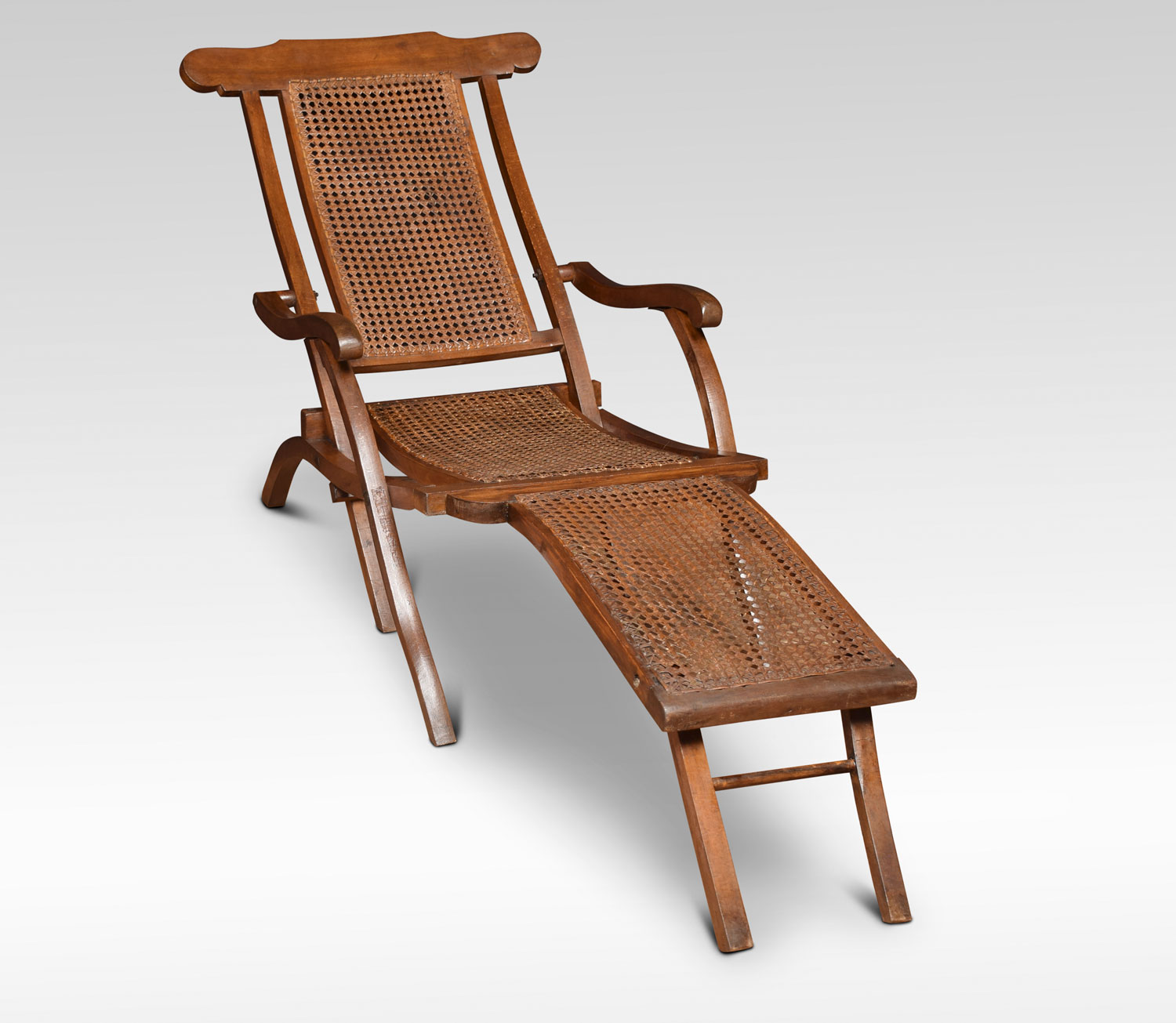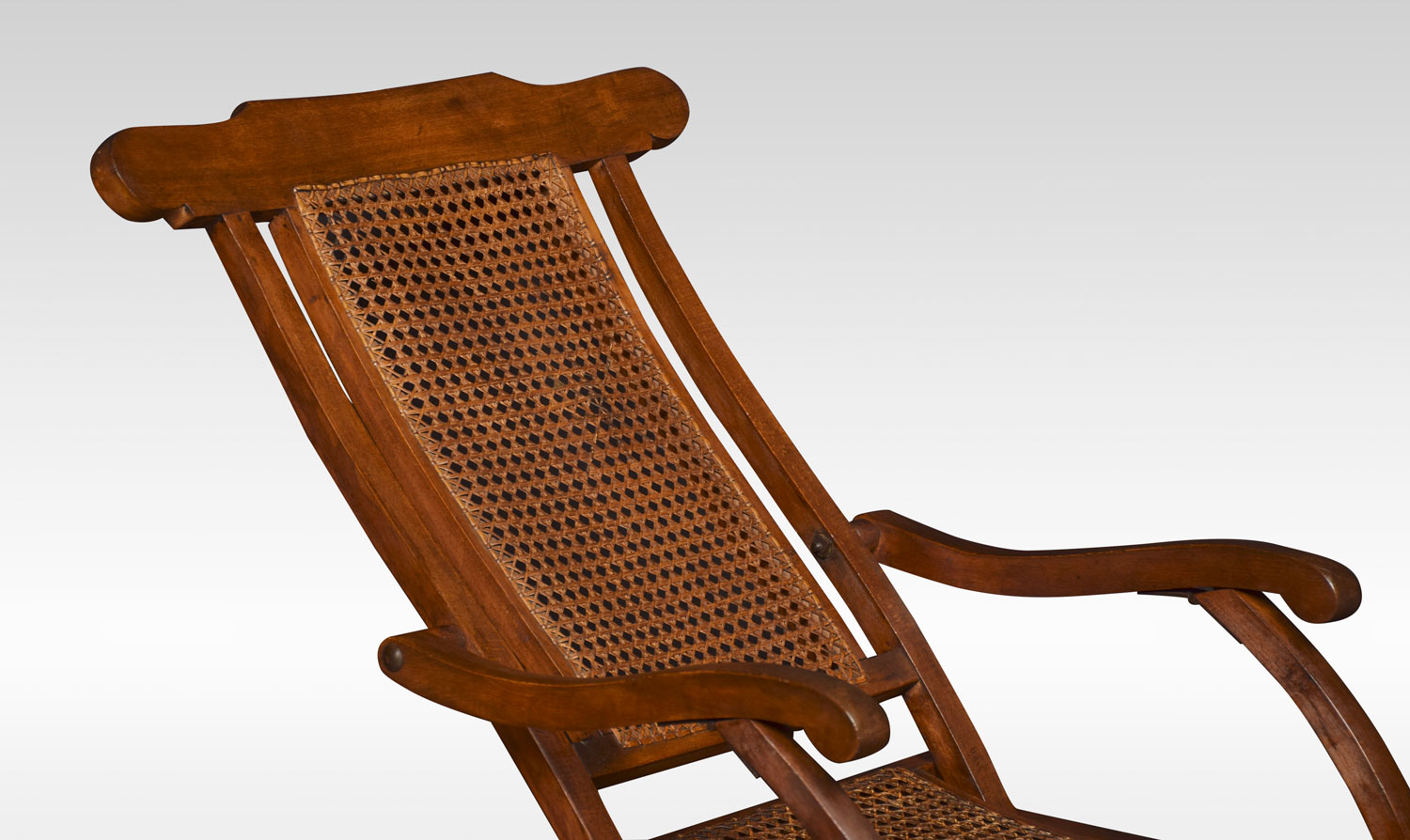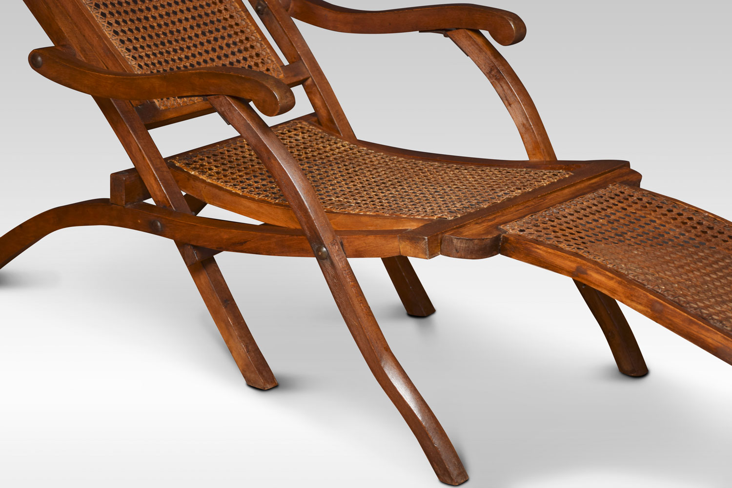 Walnut framed folding Steamer deck chair. The cane work back and seat, flanked by scrolling arms and splayed legs. It folds very easily for storage.