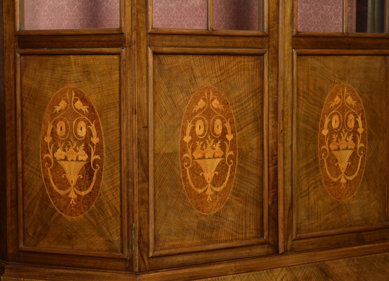 Walnut display cabinet the arched top over two central doors opening to reveal serviceable upholstered interior with two glazed shelves. Flanked by unusual concaved glass panelled sides the base section with oval inlaid panels all raised up shaped plinth