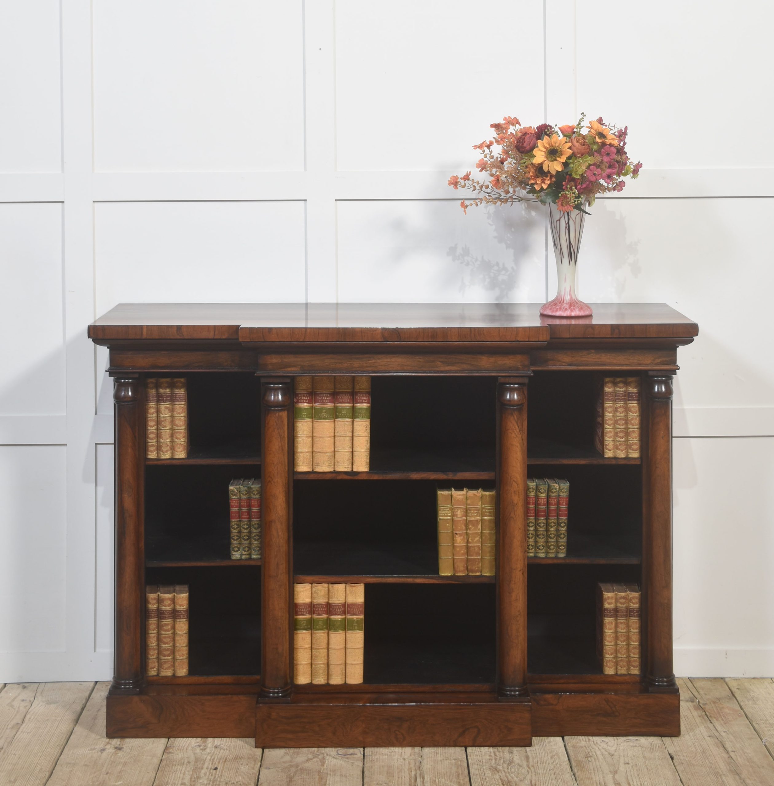 Walnut bookcase, the large rectangular breakfront top with ebonised line detail enclosed by moulded edge. to the large central panelled doors with foliated inlay opening to reveal shelved interior. Flaked by adjustable open bookshelves. All raised up on plinth base.