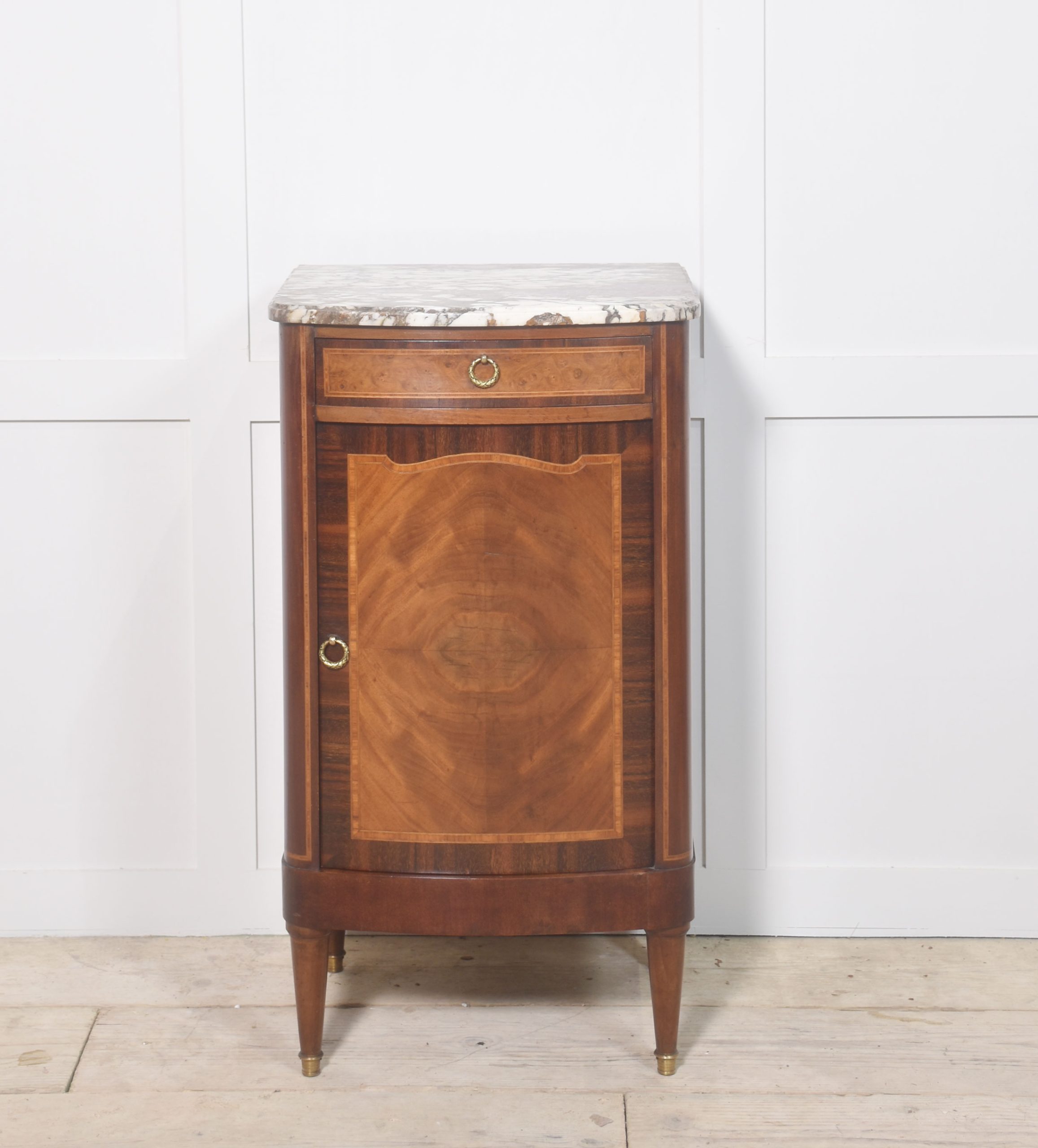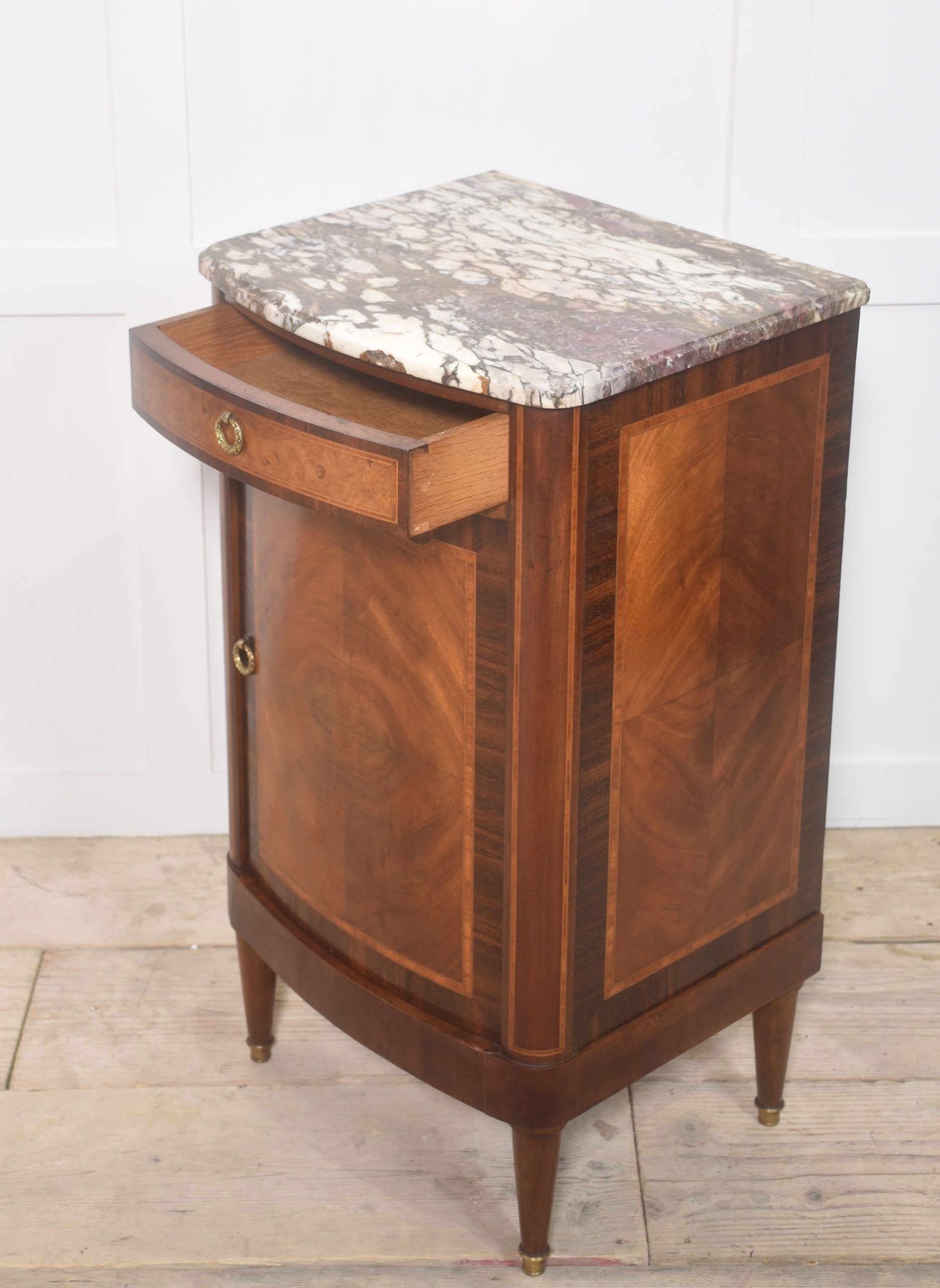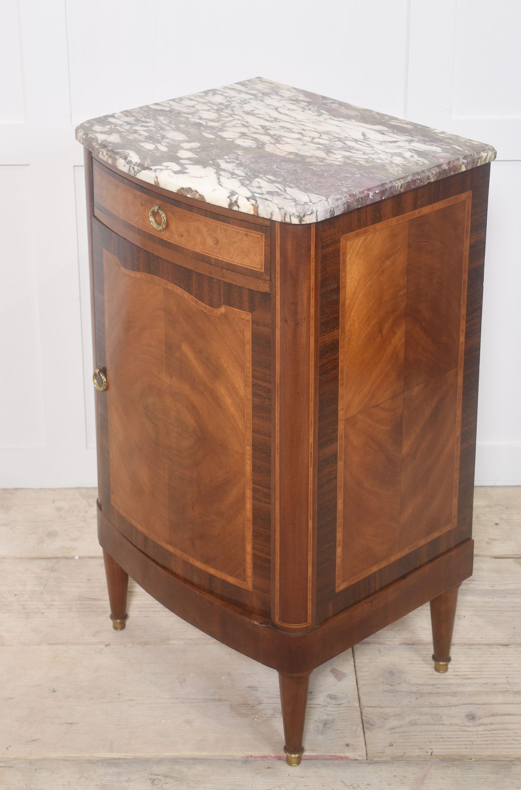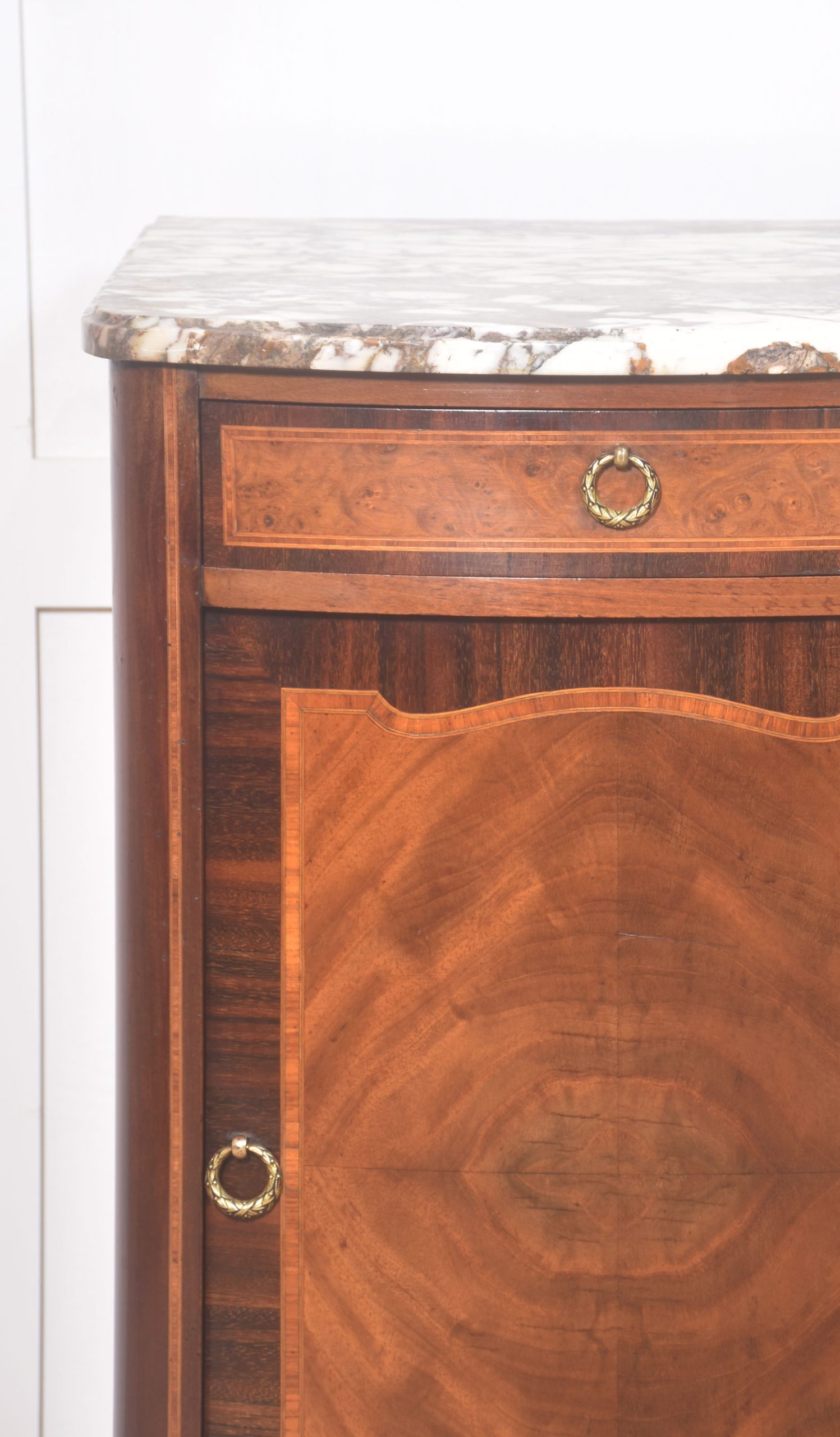 Walnut inlaid side cabinet, the well-figured bow fronted marble top above single drawer fitted with circular tooled brass handle. Above large cupboard door opening to reveal large storage area. All raised up on short tapering legs.