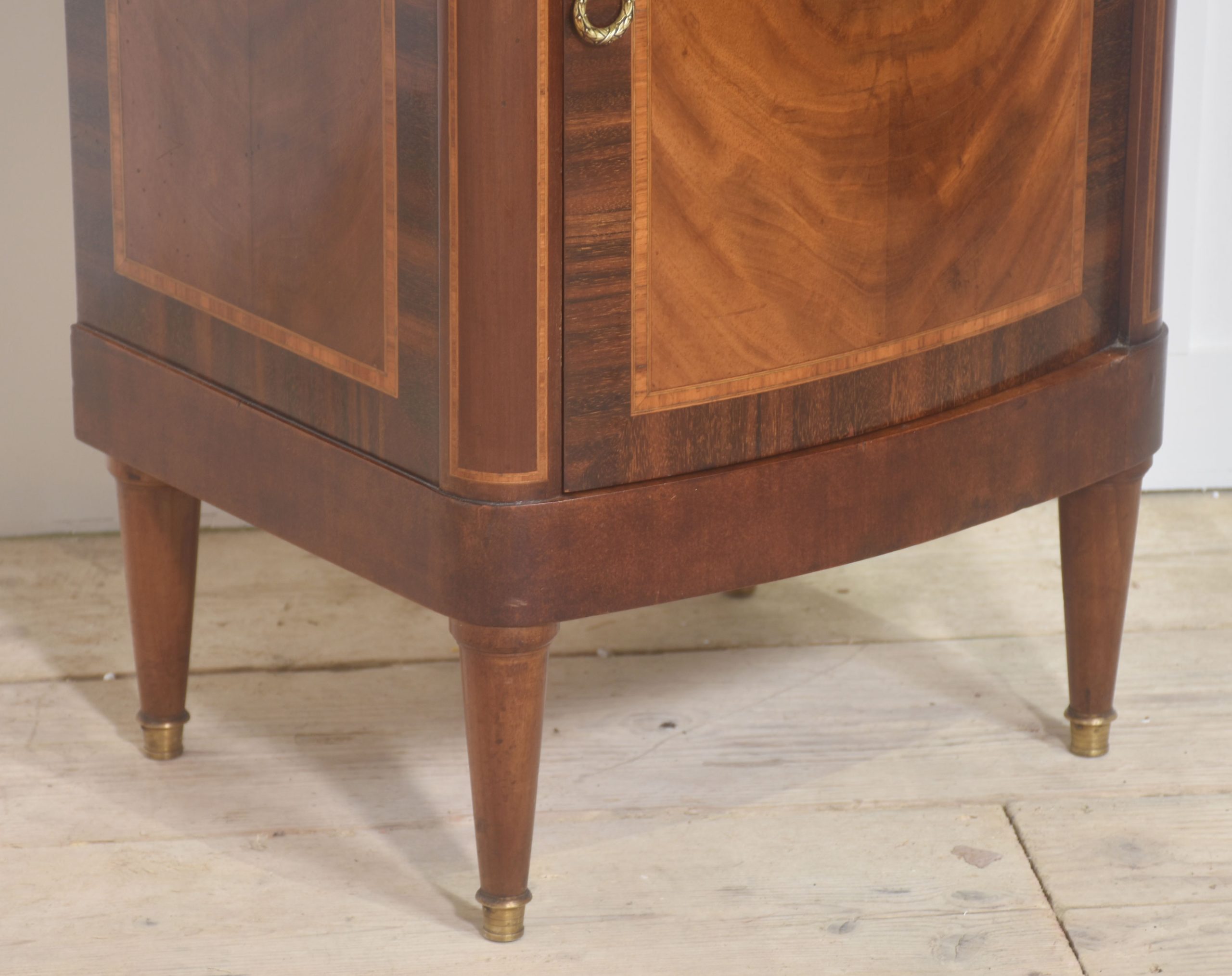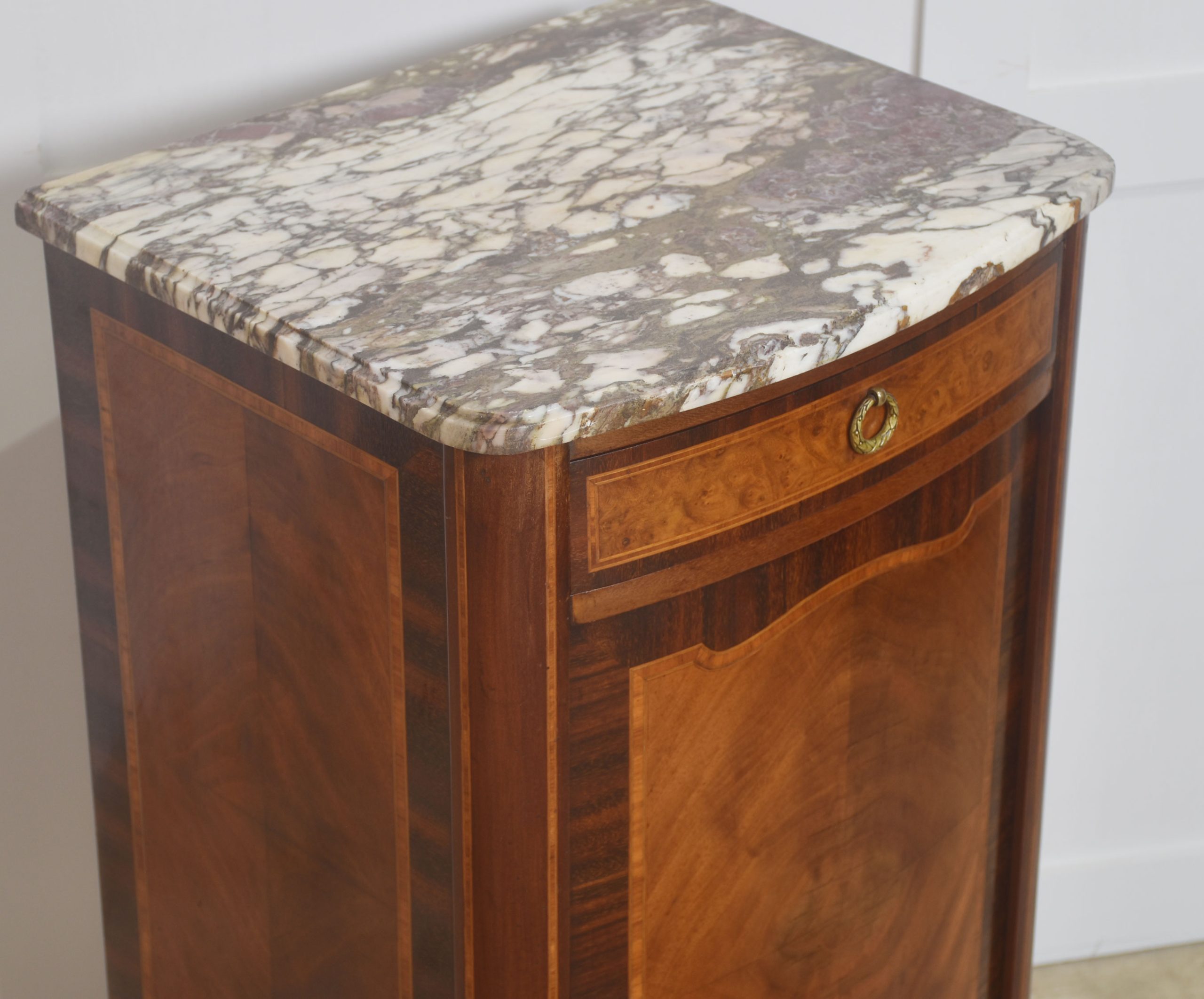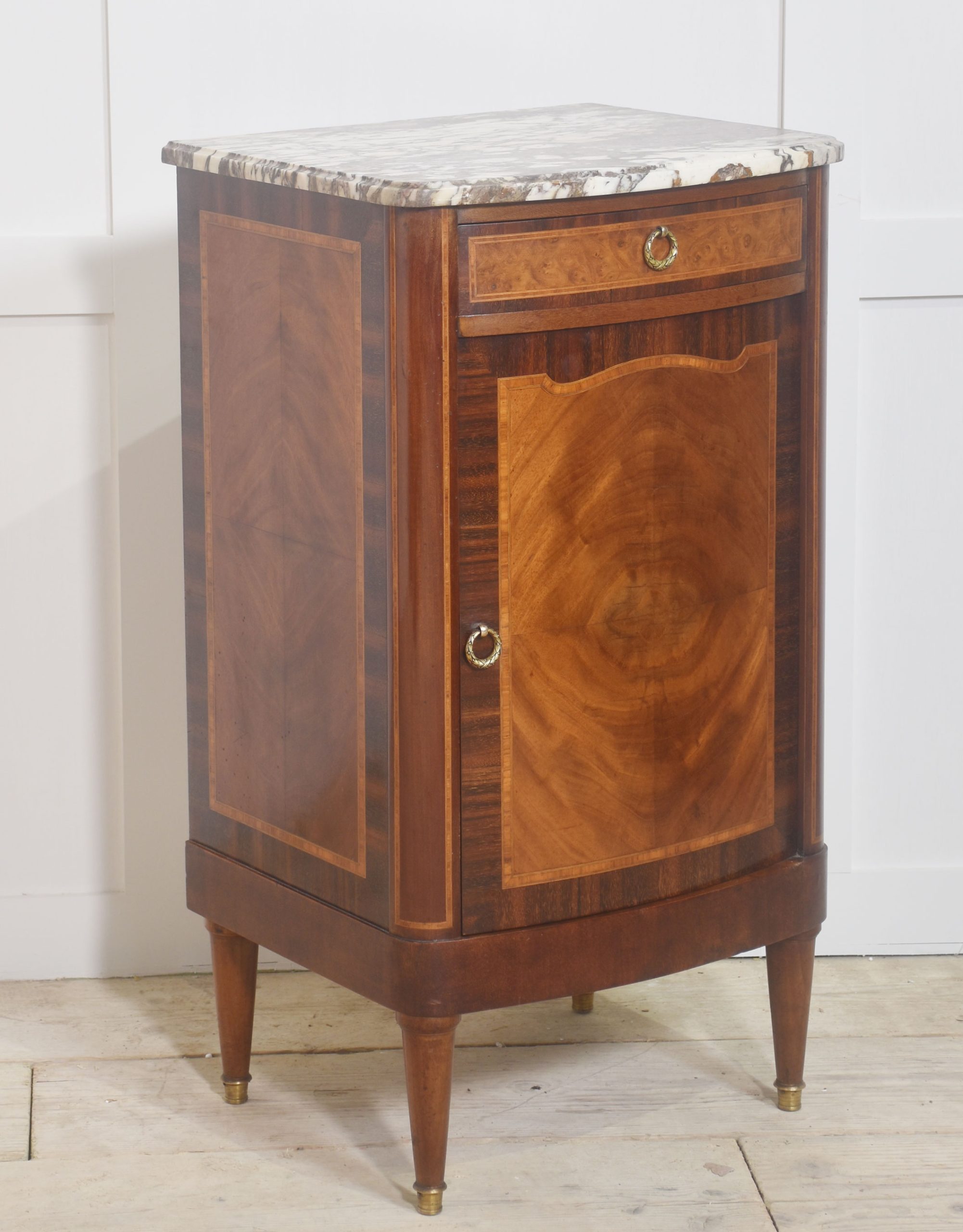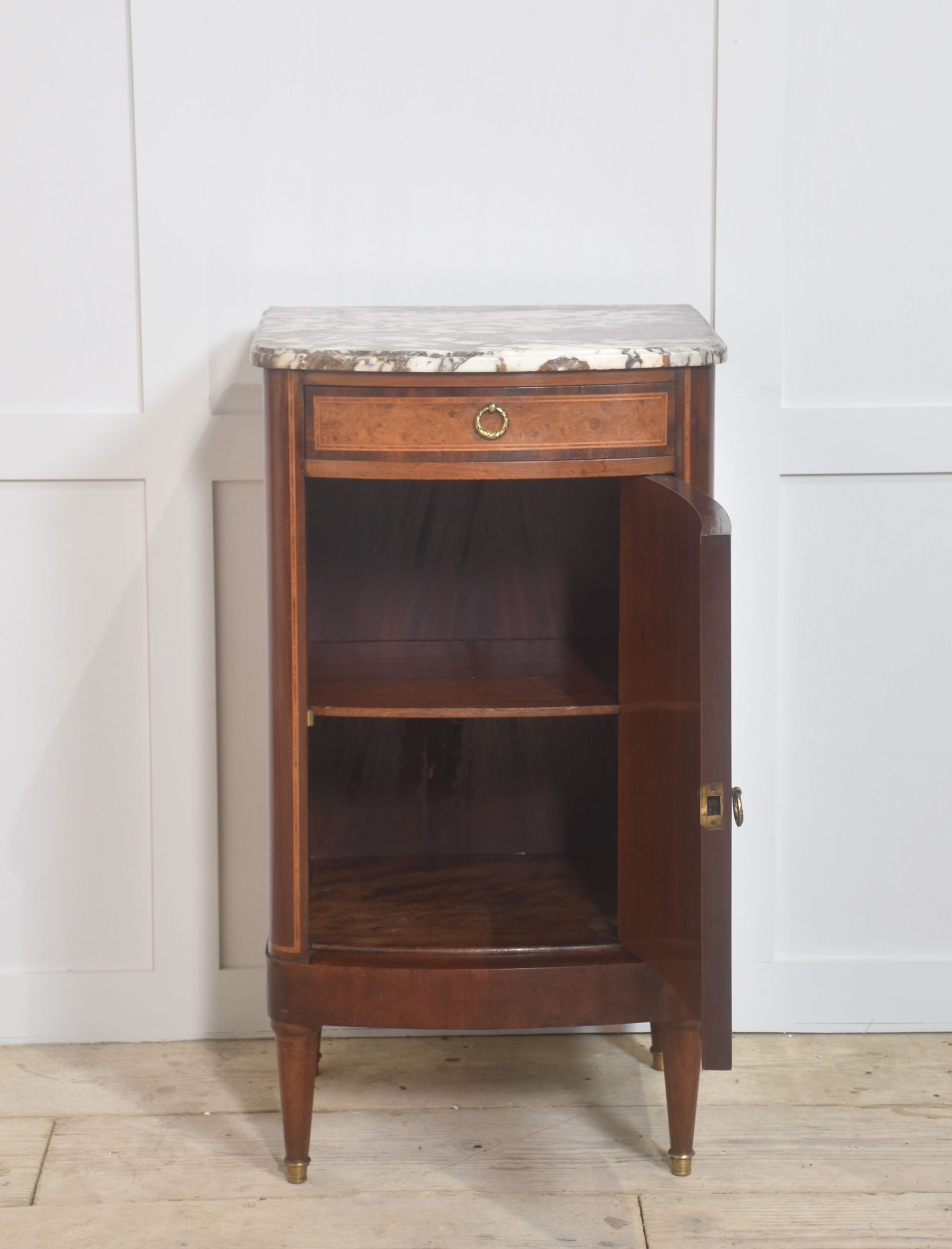 Walnut inlaid side cabinet, the well-figured bow fronted marble top above single drawer fitted with circular tooled brass handle. Above large cupboard door opening to reveal large storage area. All raised up on short tapering legs.