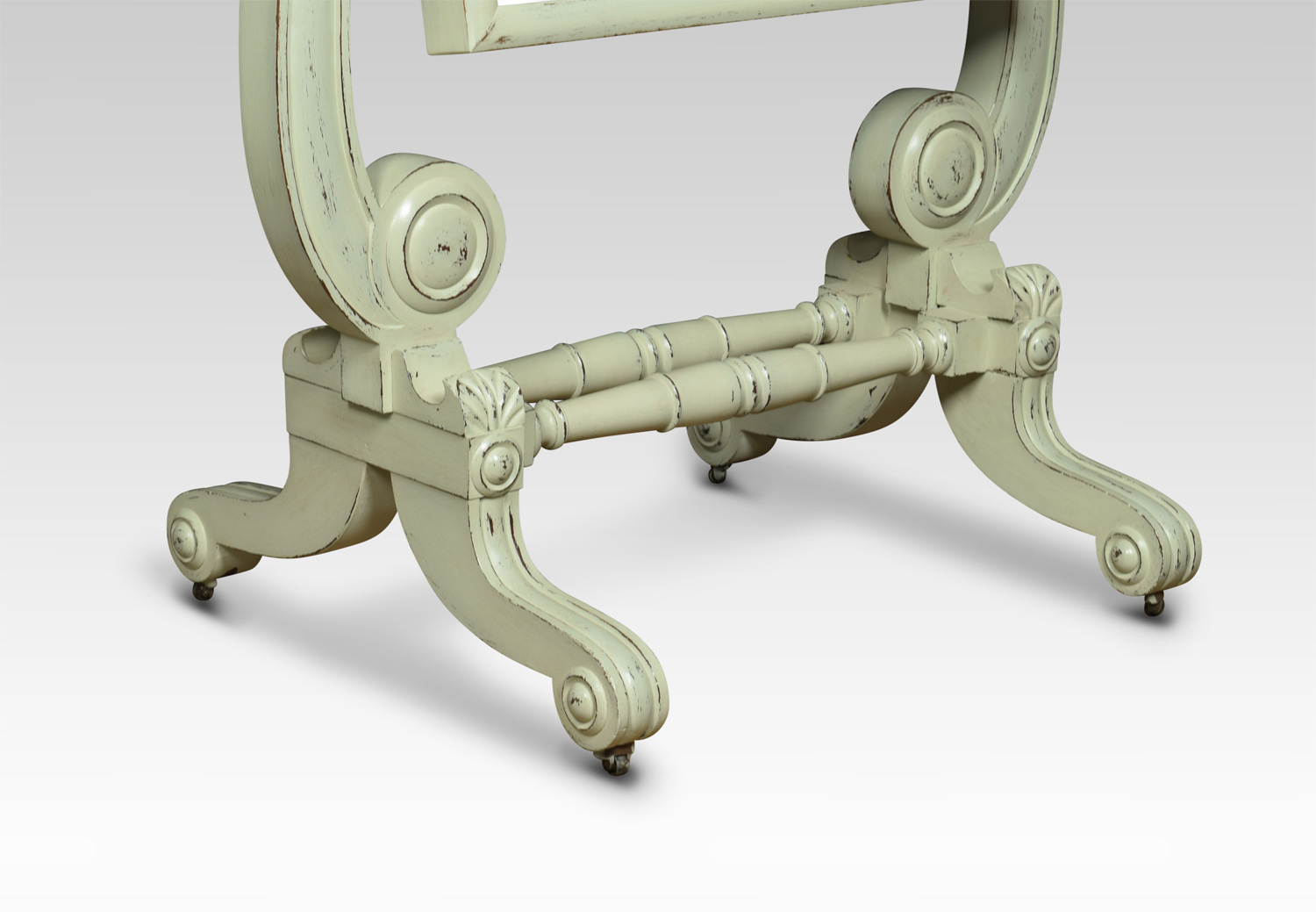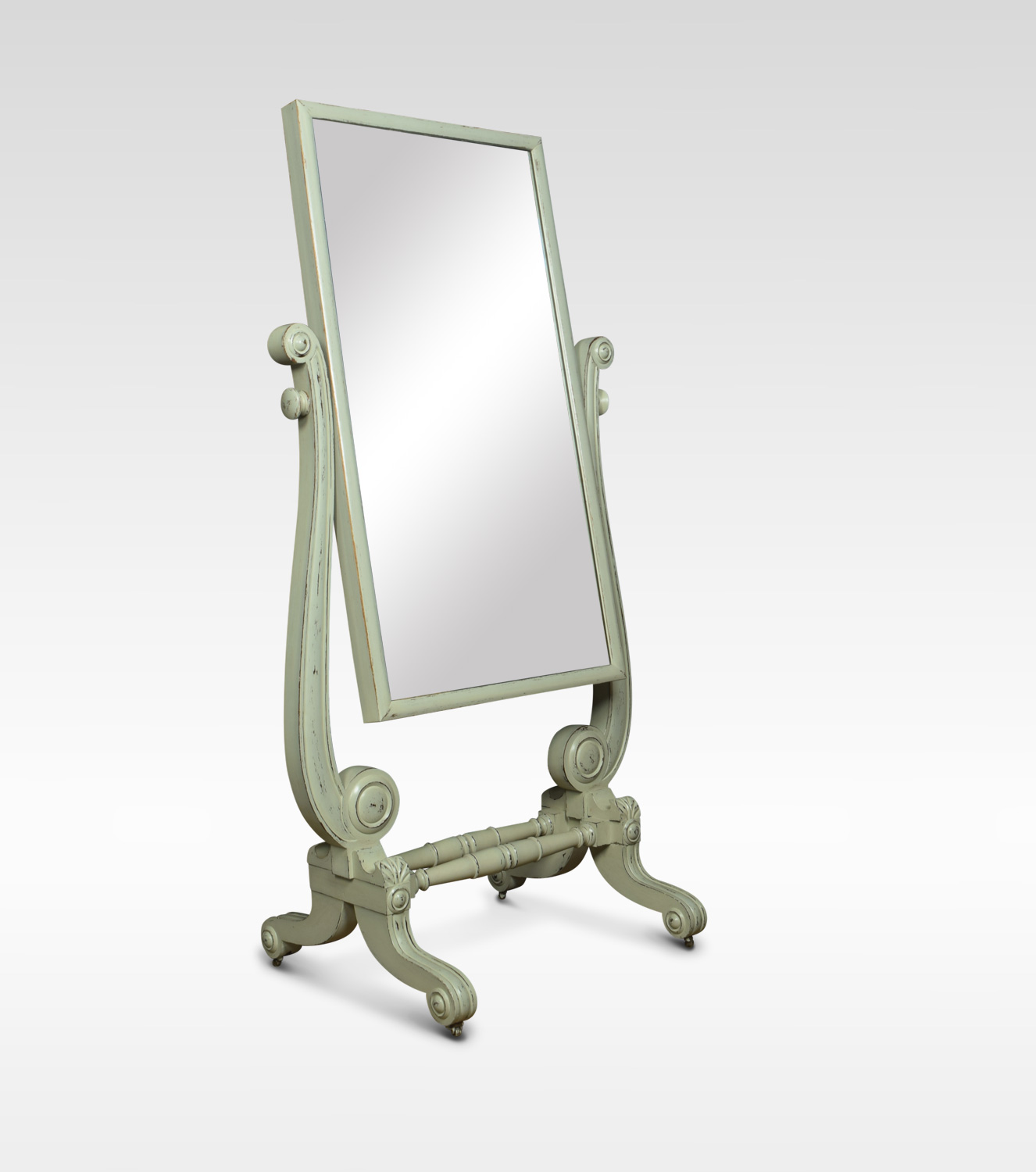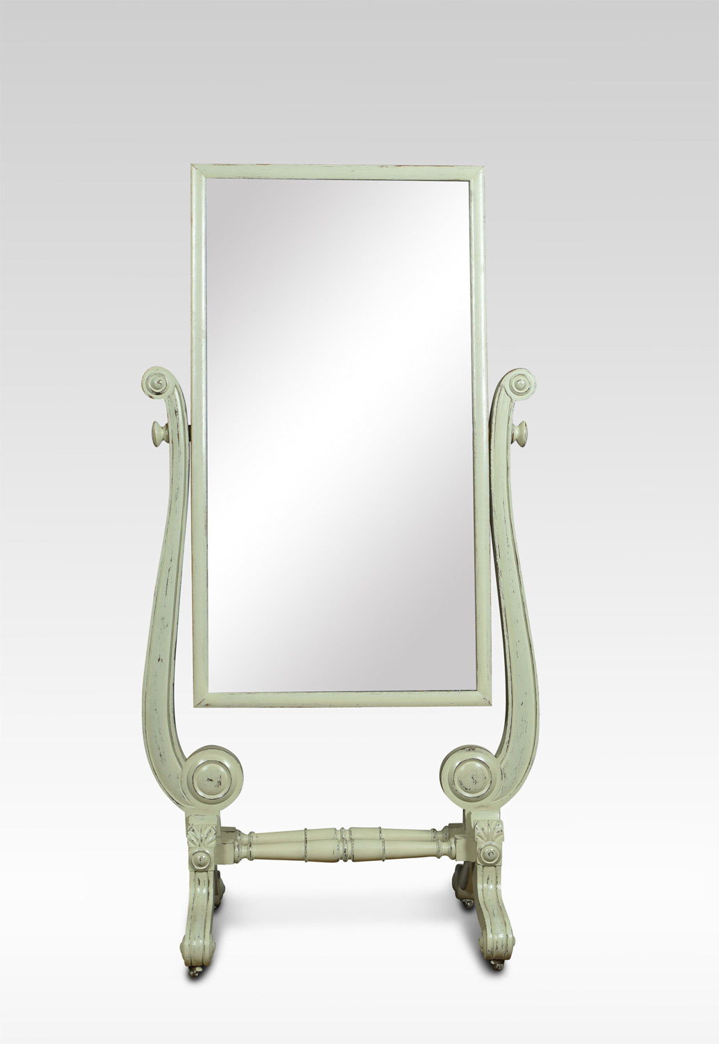 Regency painted Cheval Mirror, the original rectangular plate between shaped supports on scrolling feet with brass castors.